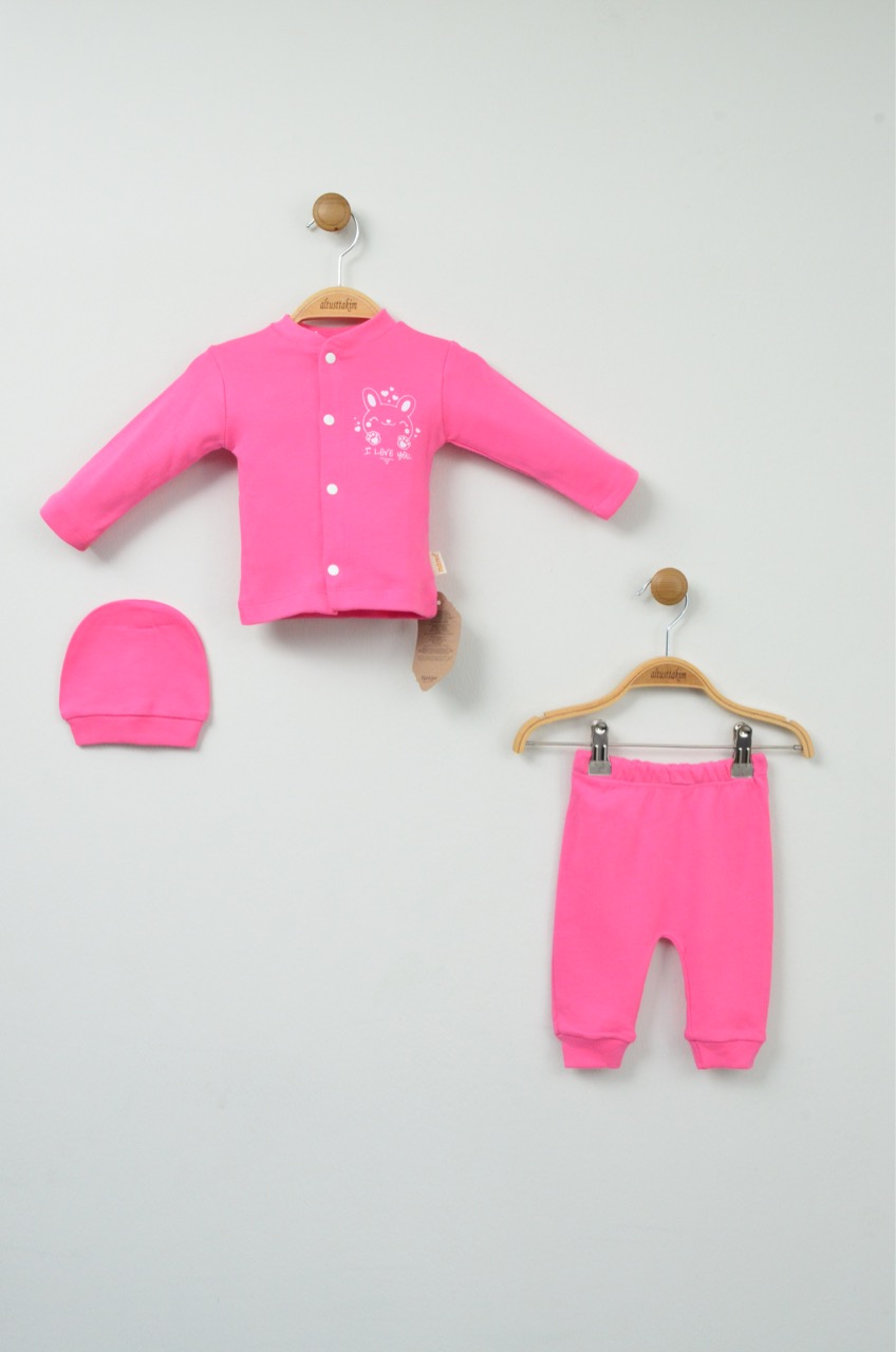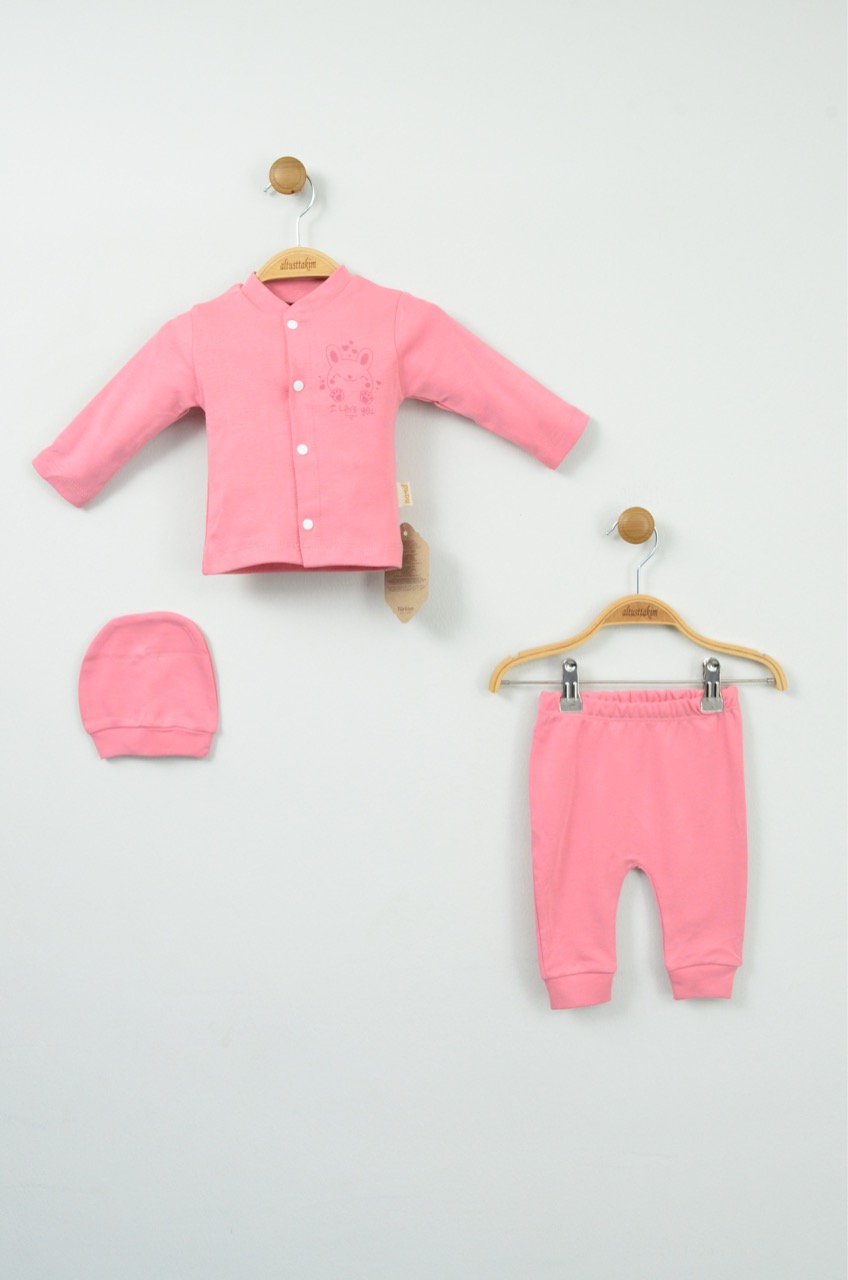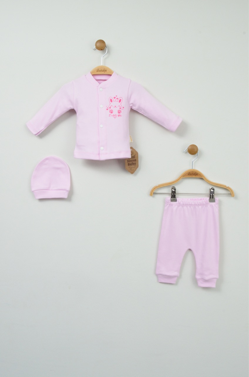 Pembe Tavşan Baskılı %100 Pamuk Yenidoğan Üçlü Takım(0-3 Ay)