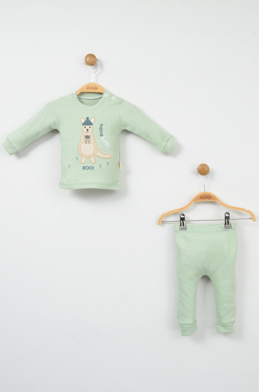 Mint Yeşili Kanguru Baskılı %100 Pamuk Yenidoğan İkili Takım(0-9 Ay)