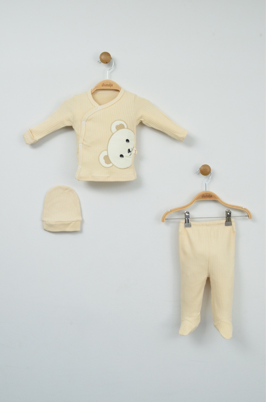 Bej Rengi Ayıcık Aplike %100 Pamuk Yenidoğan Üçlü Takım(0-3 Ay)