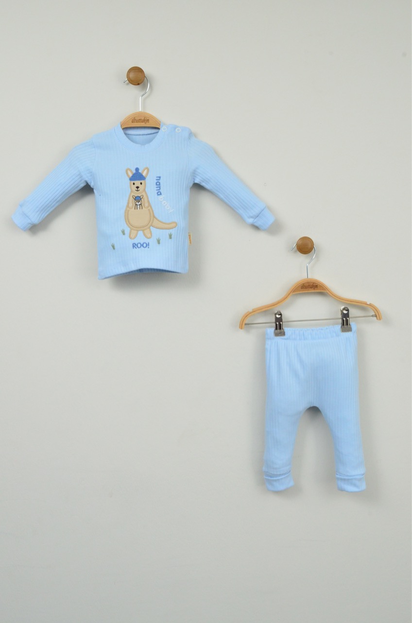 Açık Mavi Kanguru Baskılı %100 Pamuk Yenidoğan İkili Takım(0-9 Ay)