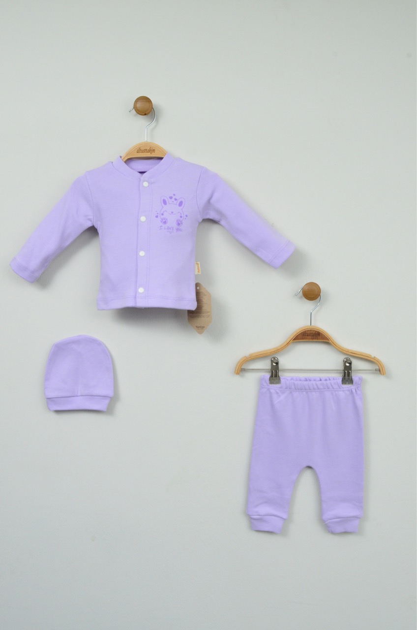 Lila Kedi Baskılı %100 Pamuk Yenidoğan Üçlü Takım(0-3 Ay)