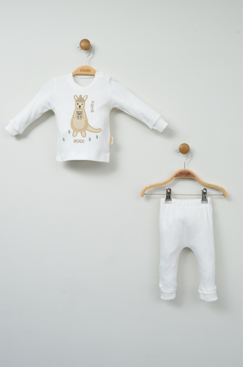 Beyaz Kanguru Baskılı %100 Pamuk Yenidoğan İkili Takım(0-9 Ay)