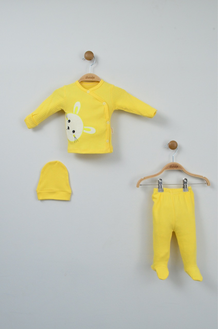 Sarı Tavşan Aplike %100 Pamuk Yenidoğan Üçlü Takım(0-3 Ay)
