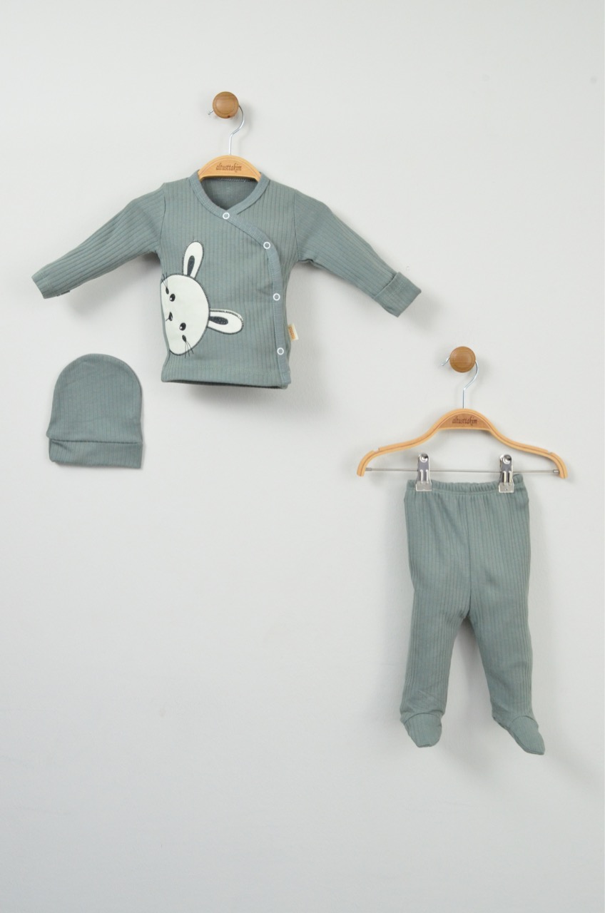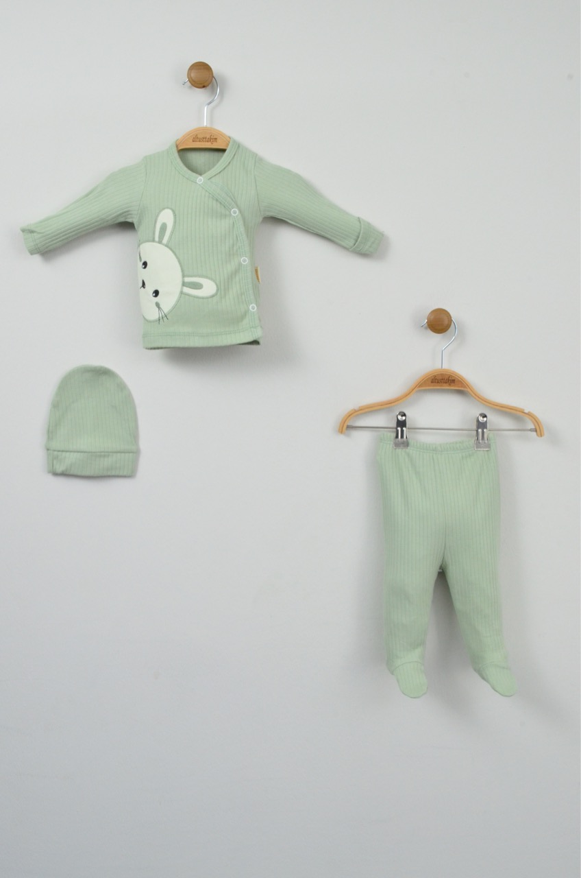 Açık Yeşil Tavşan Aplike %100 Pamuk Yenidoğan Üçlü Takım(0-3 Ay)