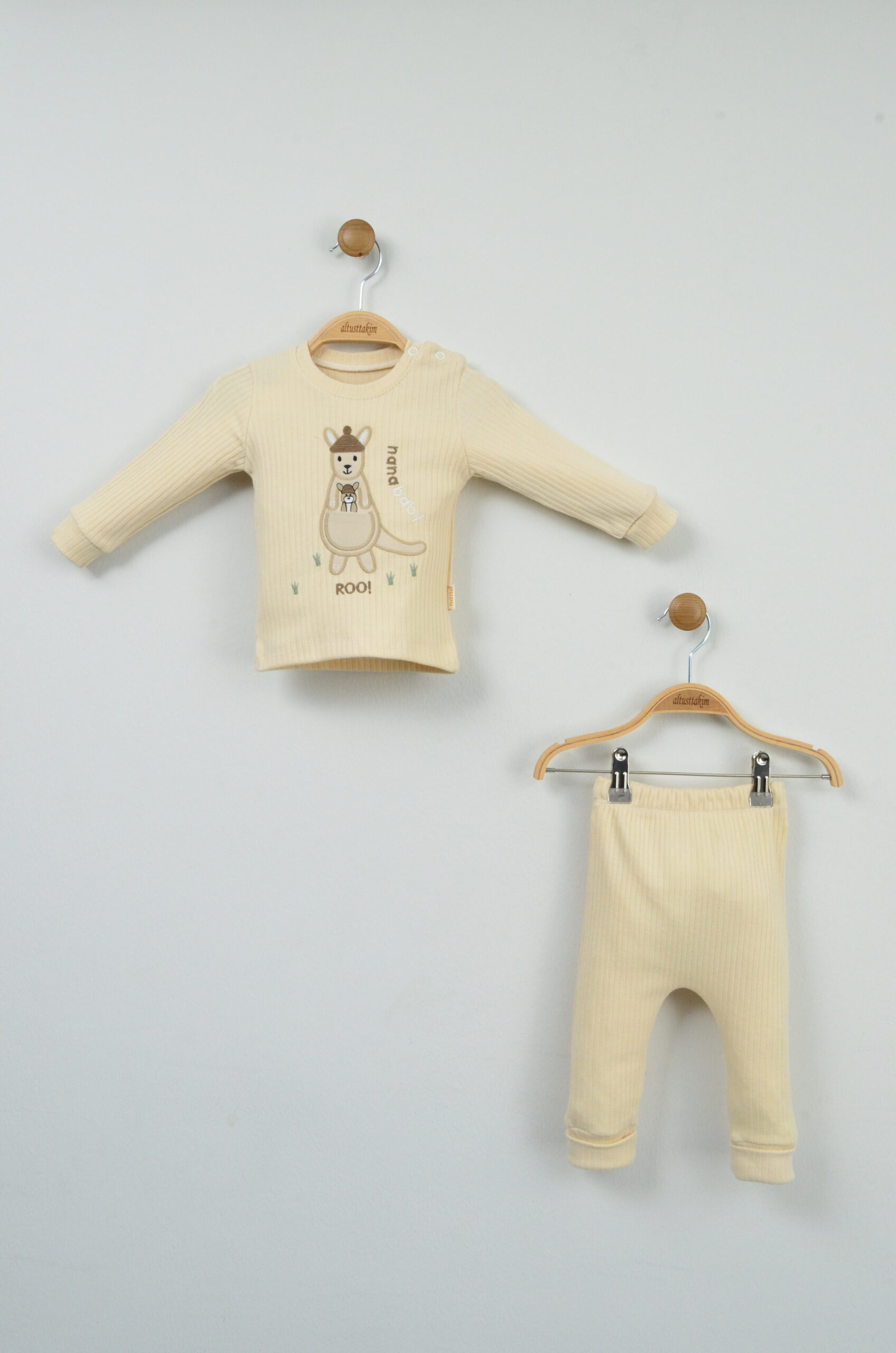 Krem Rengi Kanguru Baskılı %100 Pamuk Yenidoğan İkili Takım(0-9 Ay)