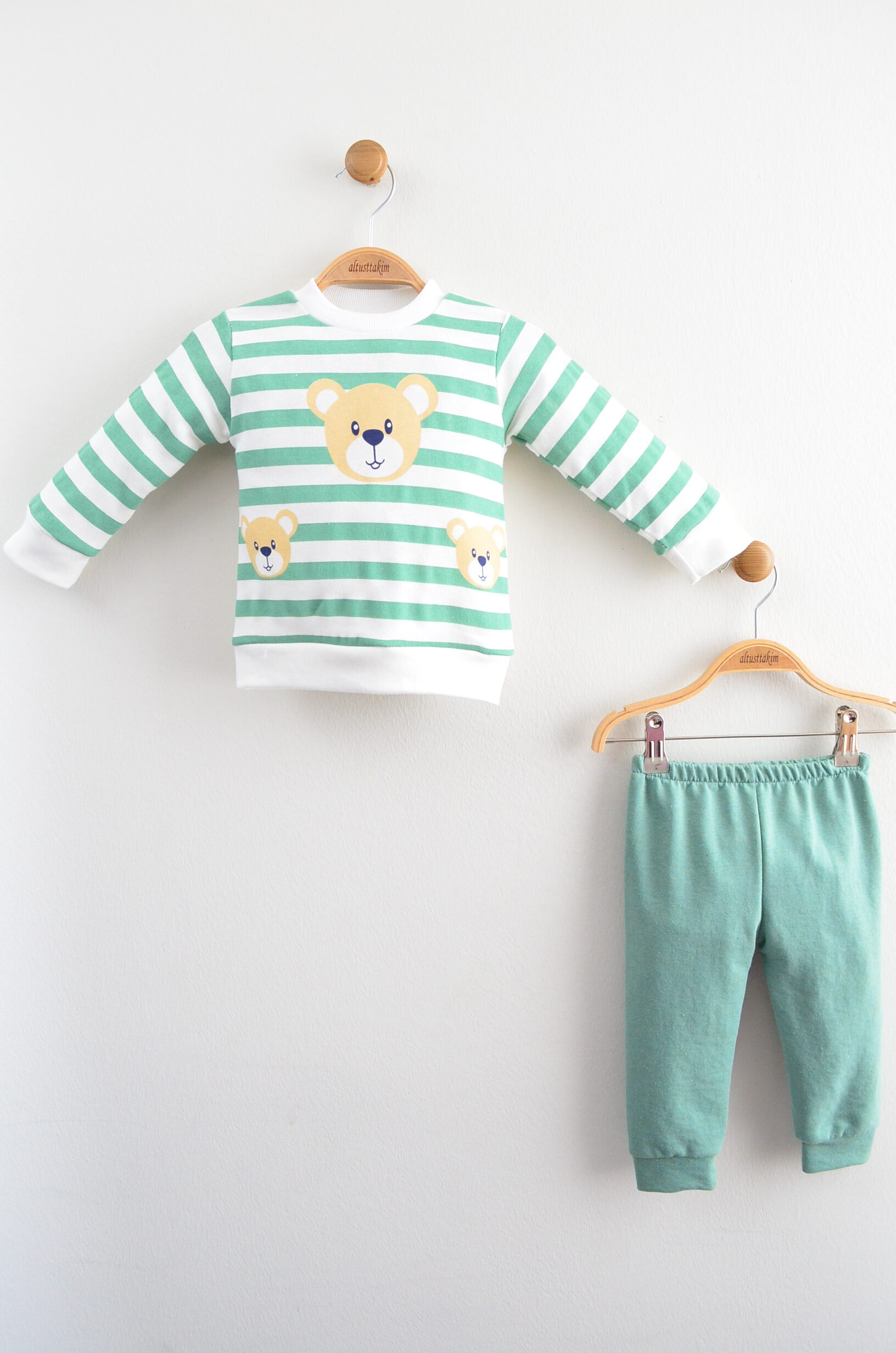 Mint Yeşili Çizgili Ayıcık Baskılı Sweatshirt ve Eşofman Altı Takım (6-24 Ay)