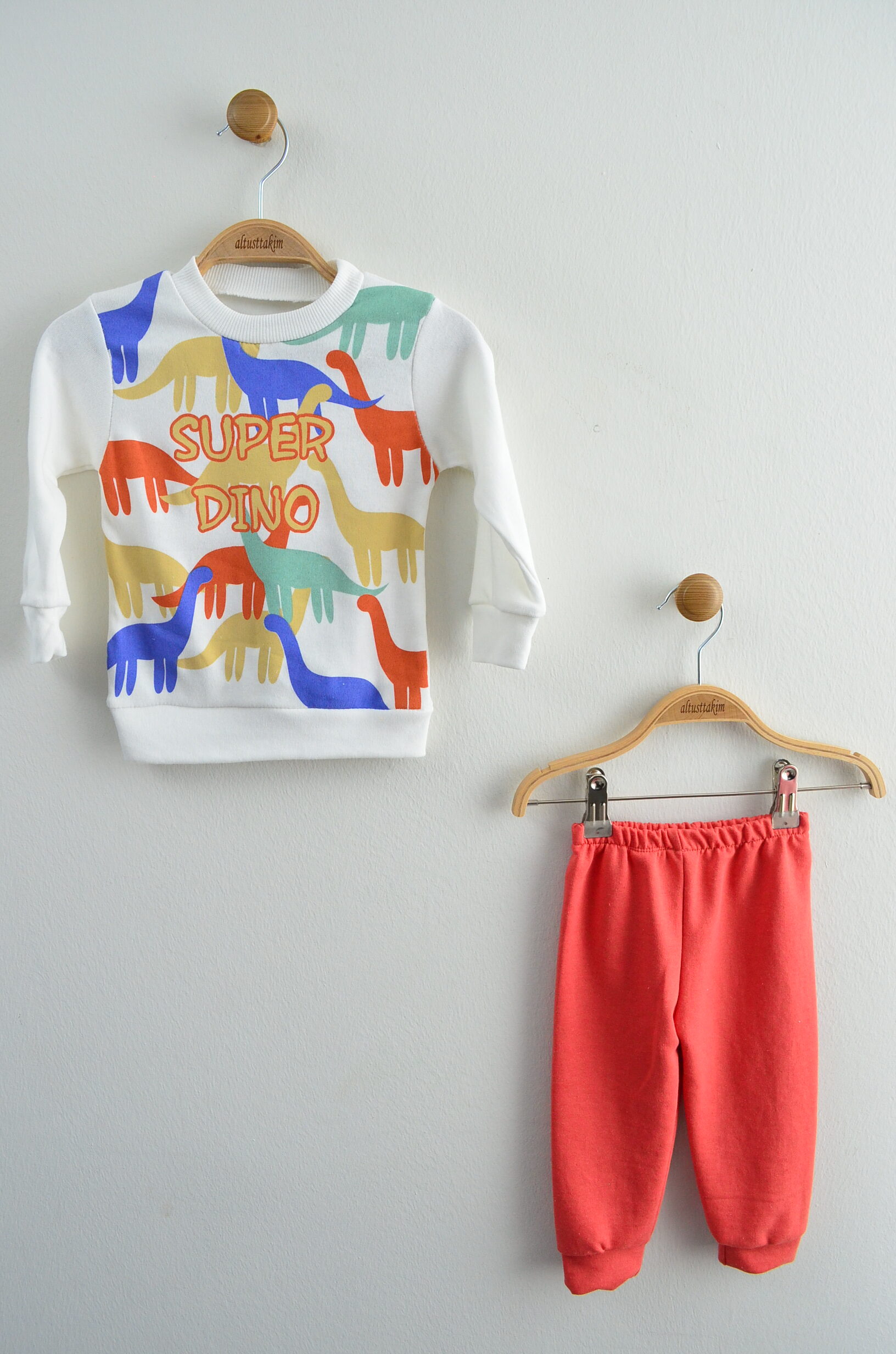 Beyaz Dinozor Baskılı Sweatshirt ve Mercan Rengi Eşofman Altı Takım (6-24 Ay)