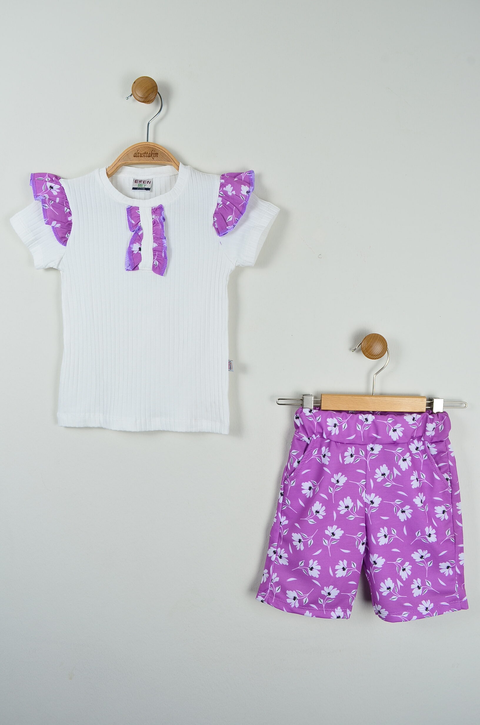 Mor Fırfırlı Şortu Çiçeklerle Süslenmiş Alt Üst Takım (1-5 Yaş)