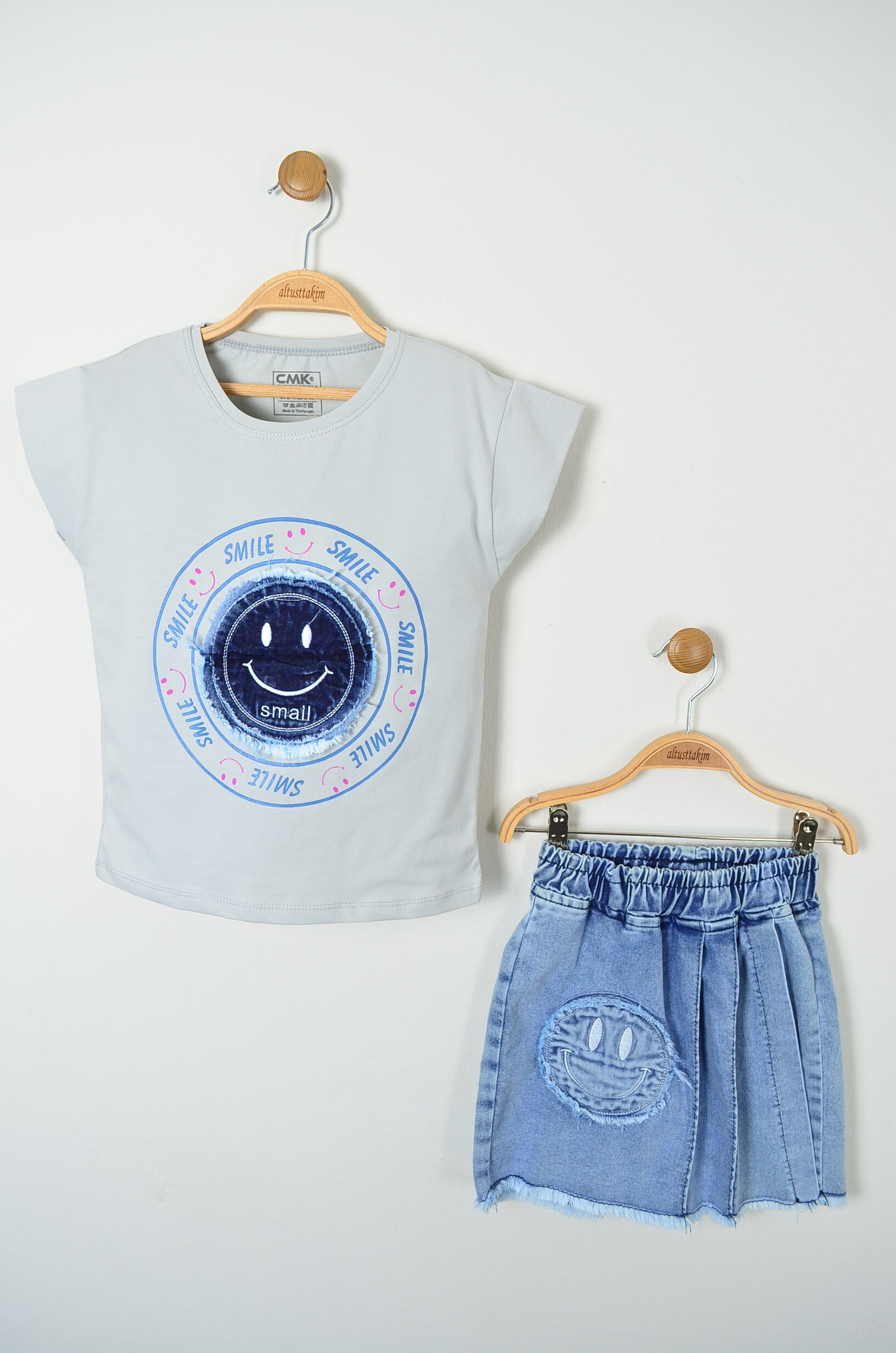 GÜLEN YÜZ TEMALI TİŞÖRT VE KOT ETEK TAKIMI (5-8 YAŞ)