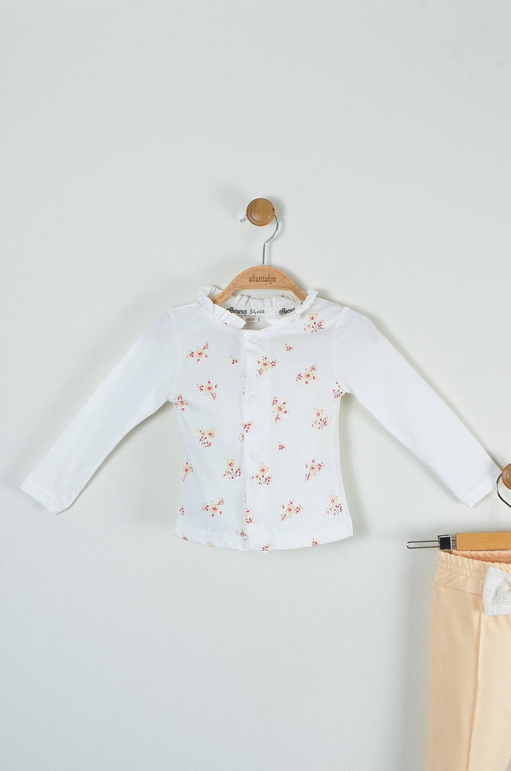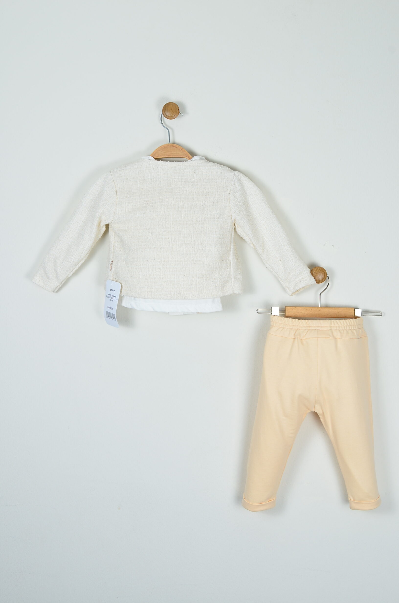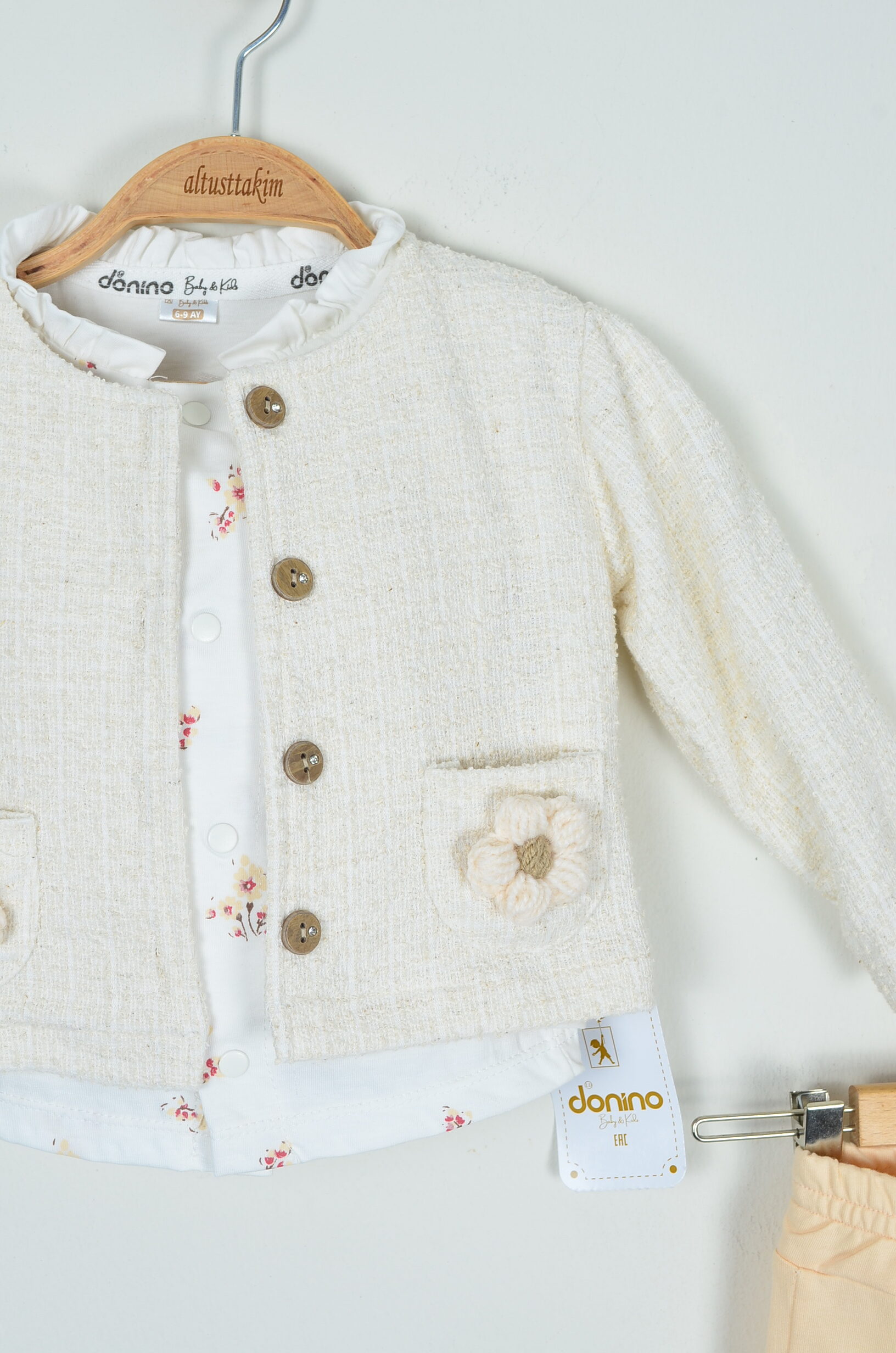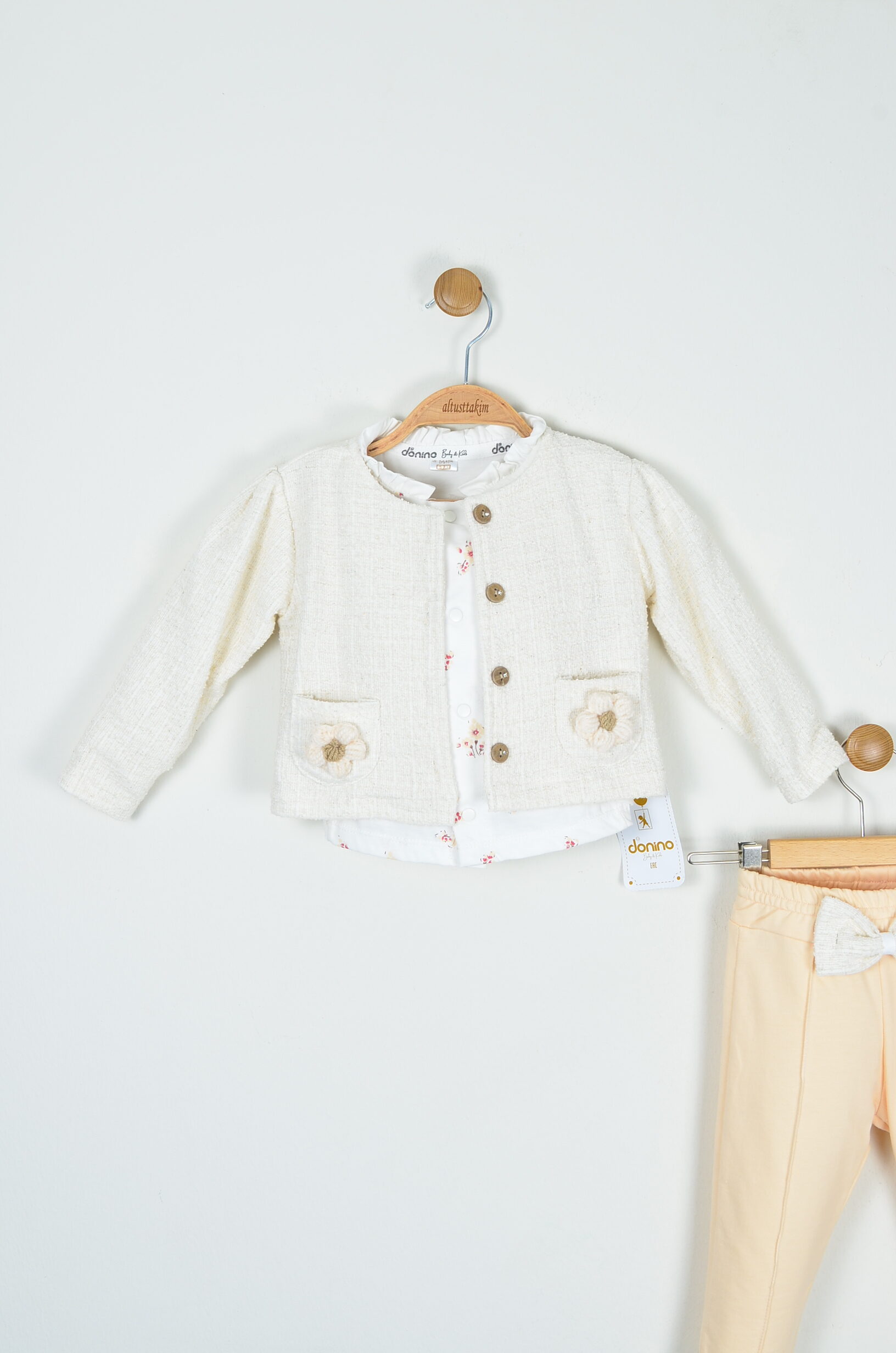 Bu üç parçalı takım, 6-24 aylık kız bebekler için hem şıklığı hem de konforu bir arada sunar. %100 pamuklu, bej renkli, ince dokulu tuvit ceketiyle göz alıcı bir stil oluşturur. Ceketin ön kısmında yer alan üç boyutlu çiçek aplikeleri, takıma zarif ve sevimli bir dokunuş katar. İçindeki beyaz, minik desenli gömlek ve paçaları fiyonk detaylı rahat pantolon, takımın şıklığını tamamlar.