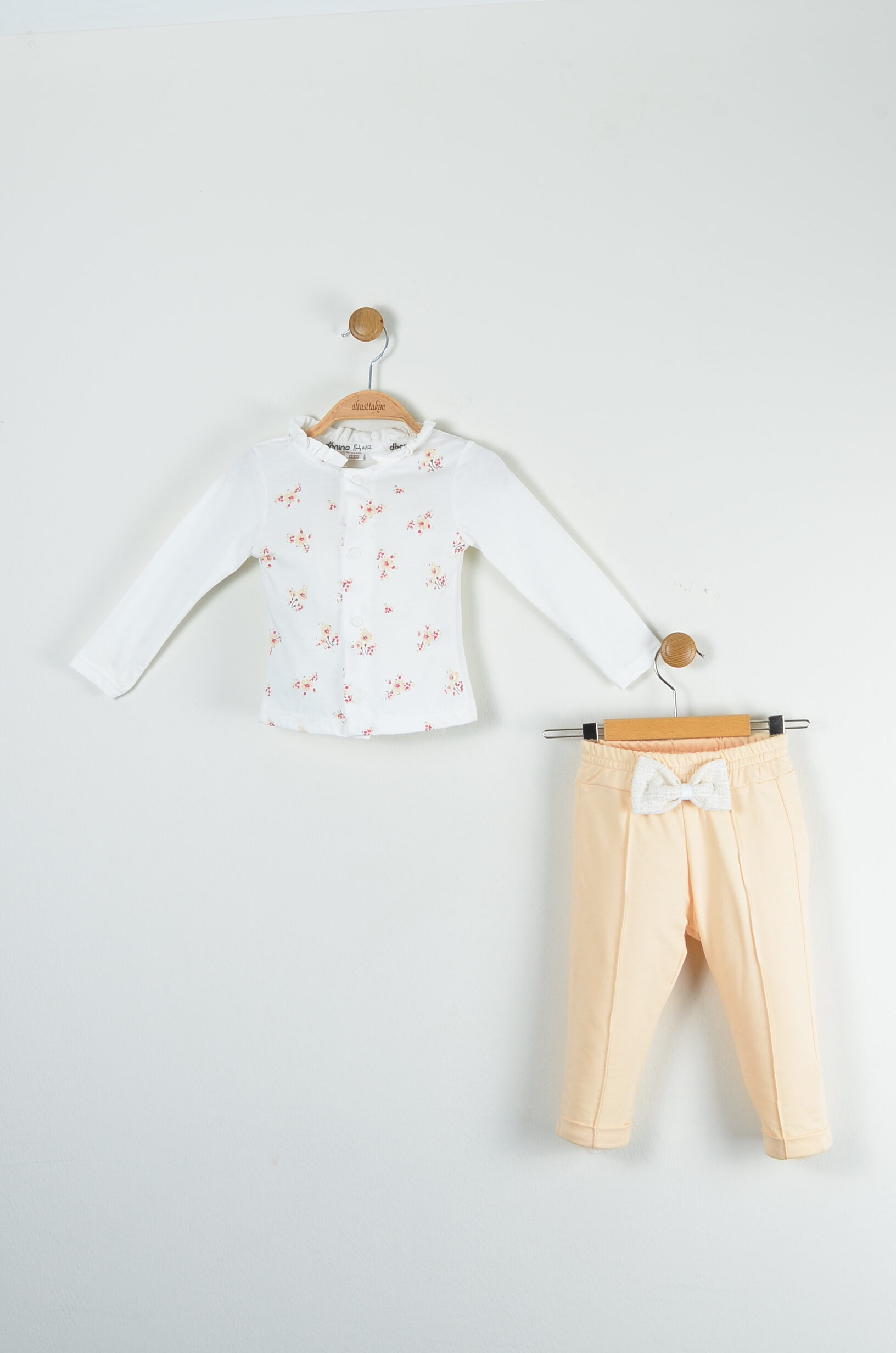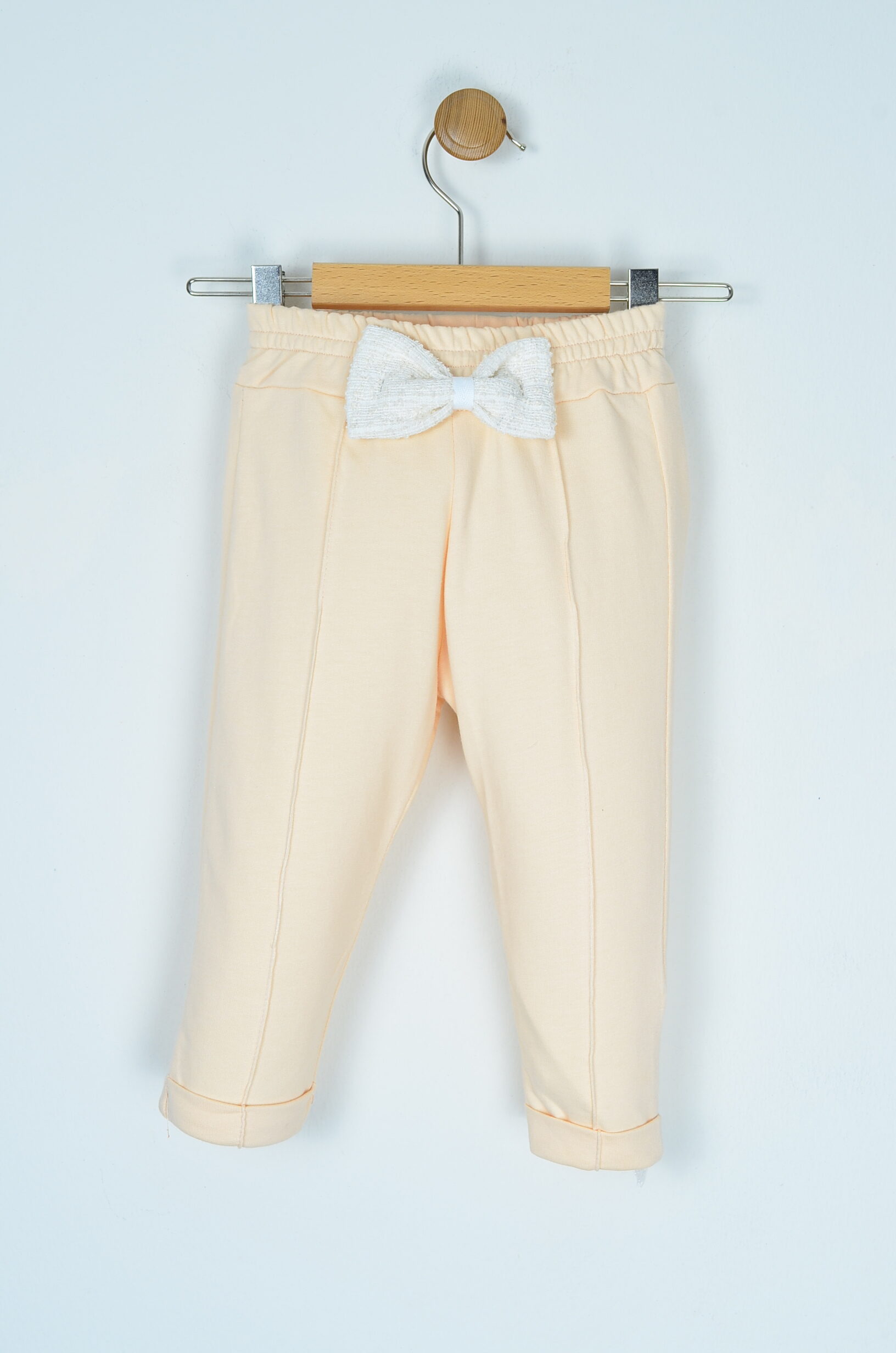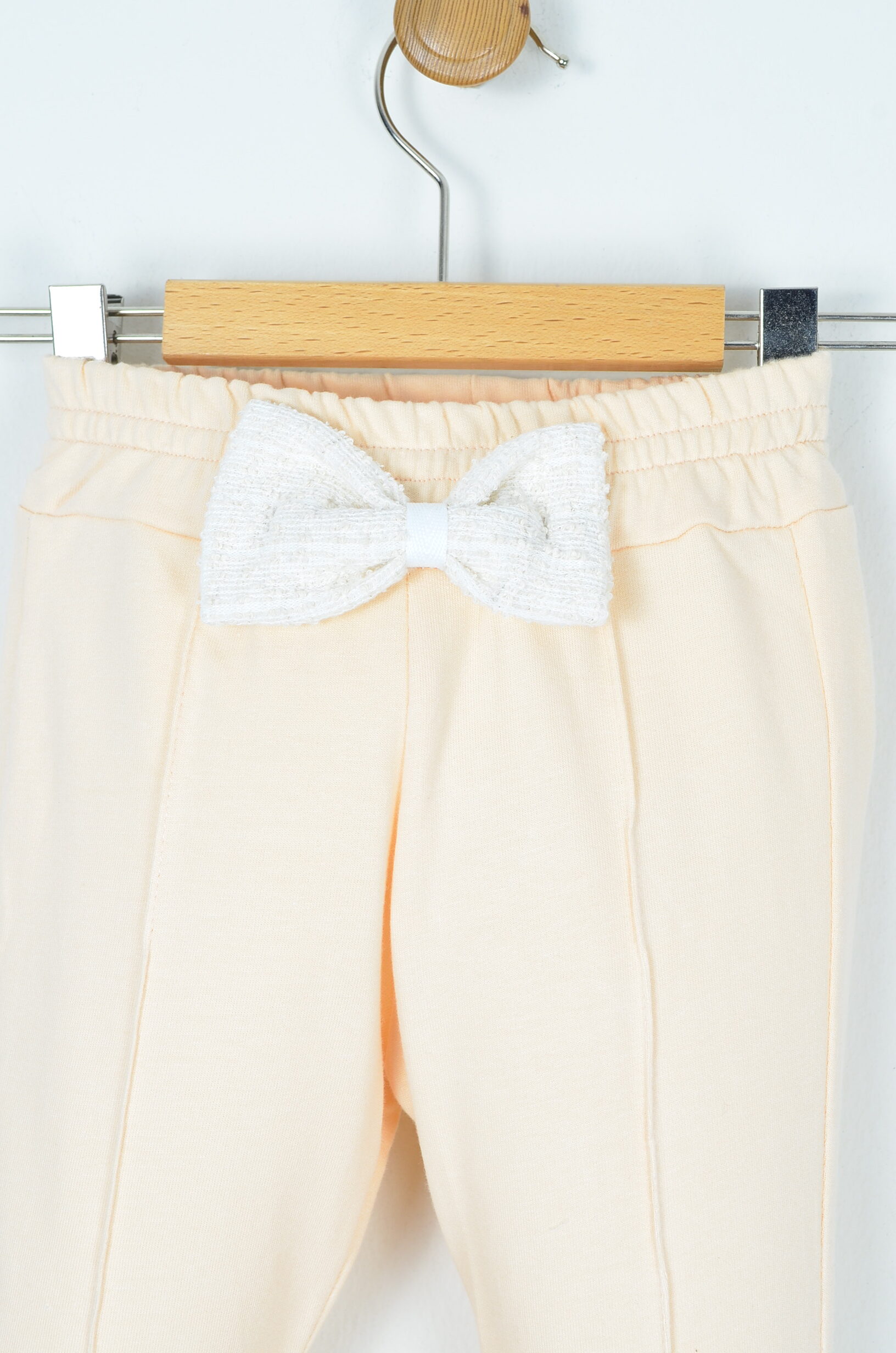 - Pantolon: Belden lastikli, rahat kesim, krem renkli, paçalarında fiyonk detayı bulunur.