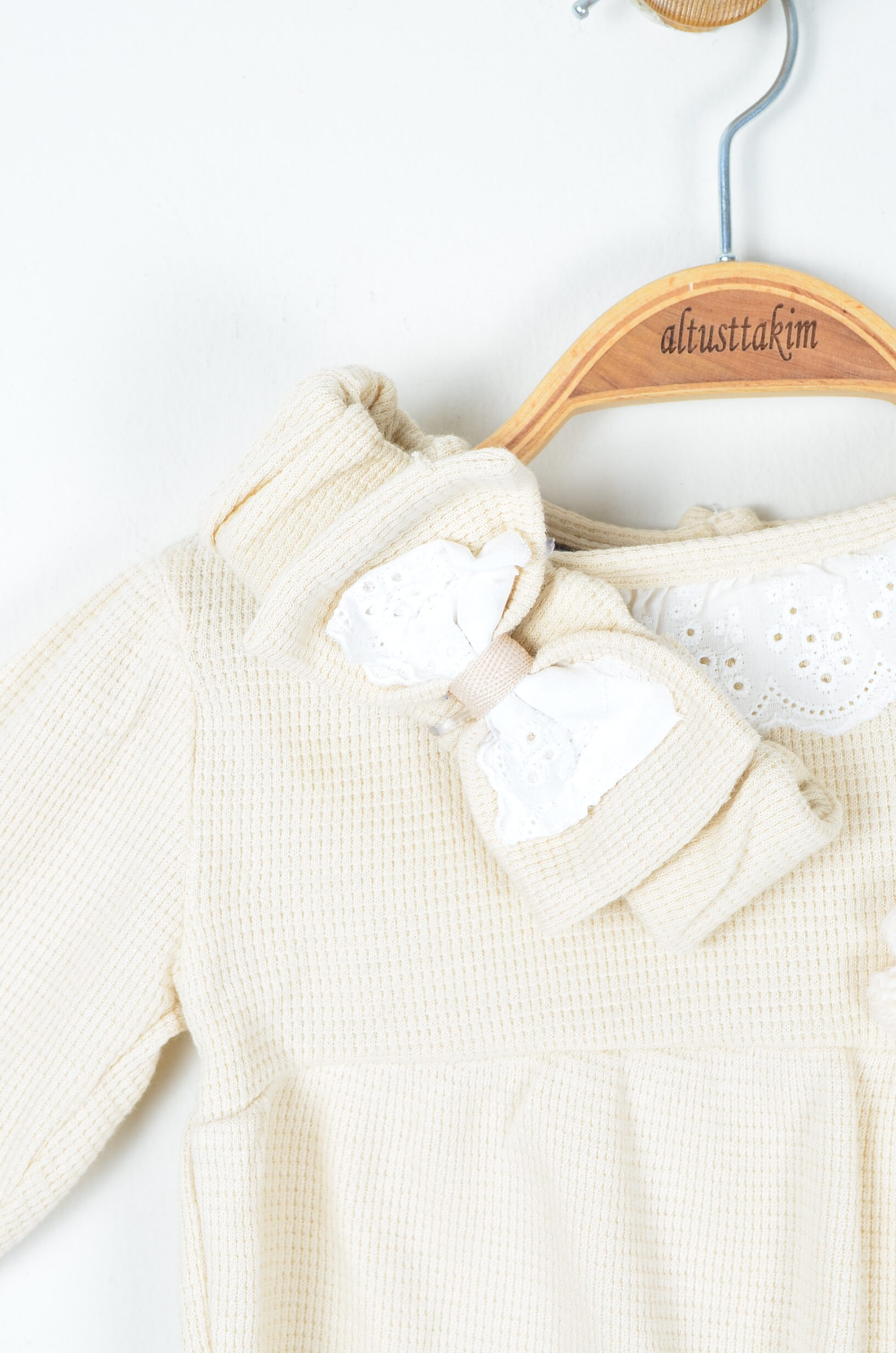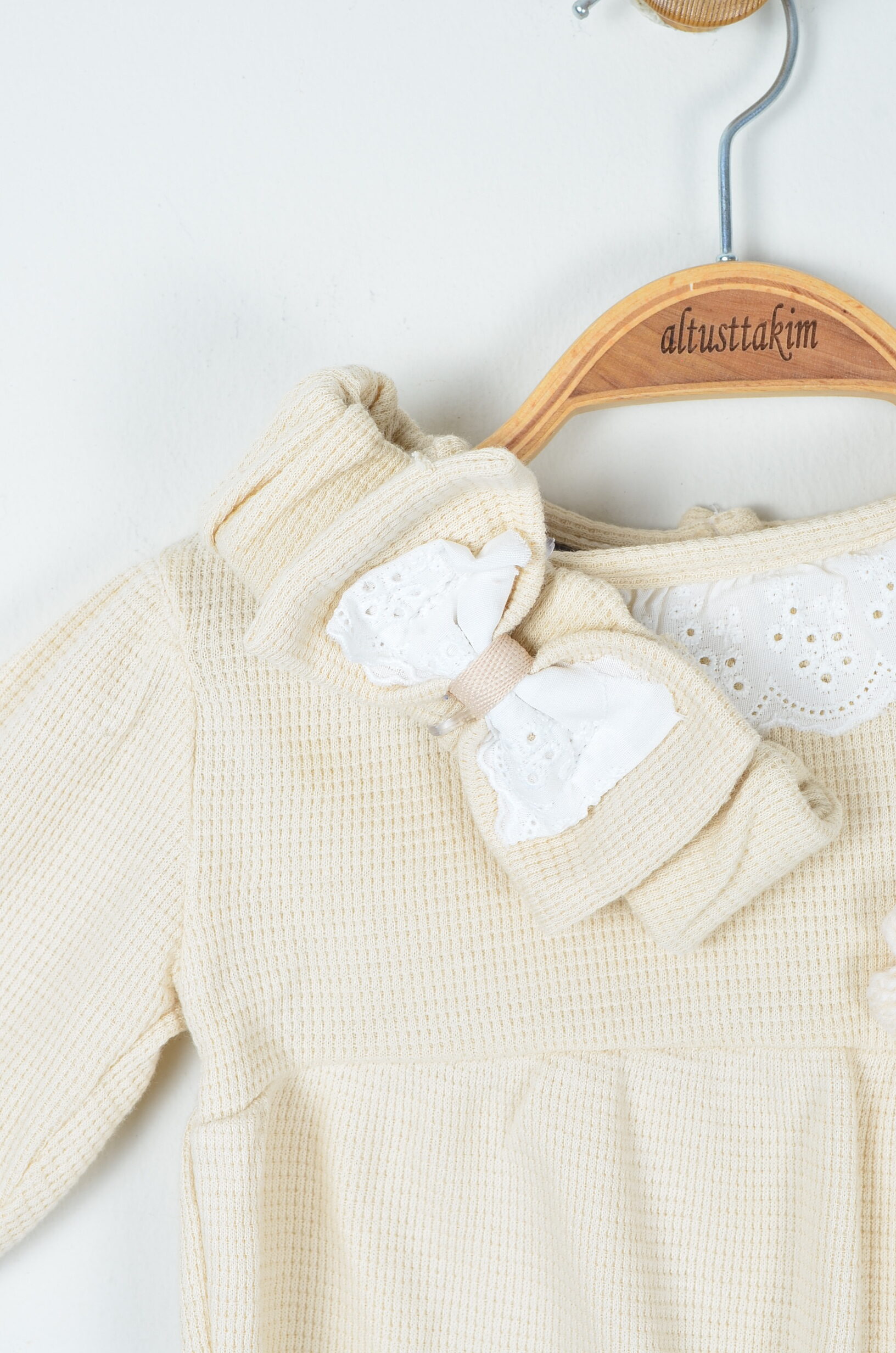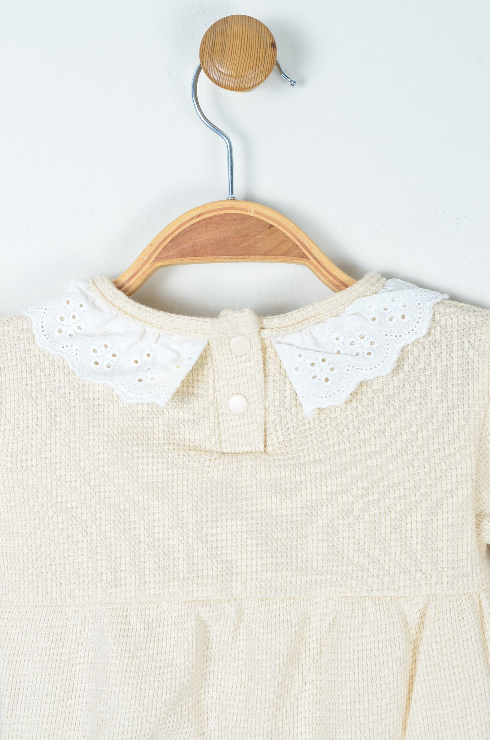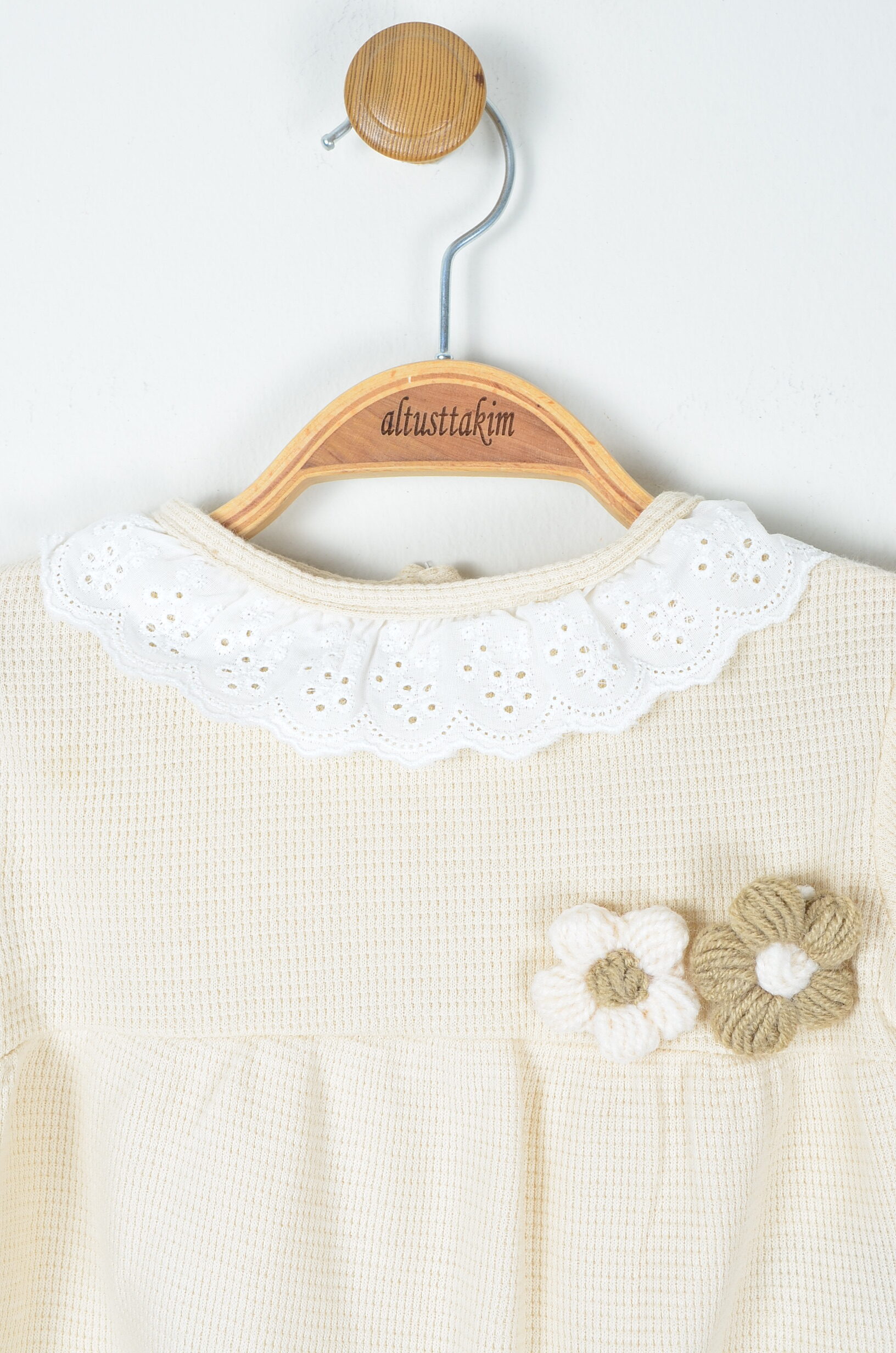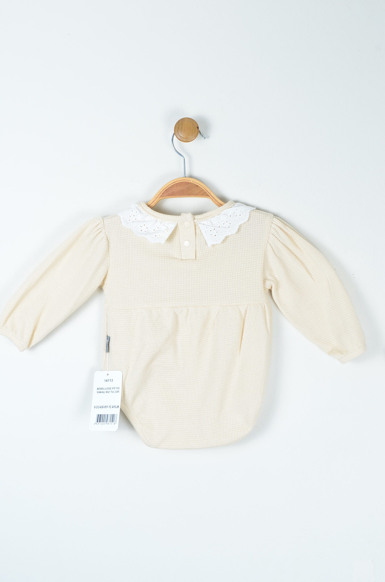 Bu uzun kollu bodysuit, bebeğinizin konforu ve şıklığı için tasarlandı. Ekru rengi, dantel detaylı yakası ve önündeki el yapımı görünümlü çiçek nakışlarıyla ürüne benzersiz bir zarafet katar. Yumuşak, waffle dokulu kumaşı, bebeğinizin hassas cildine dost bir dokuya sahiptir.