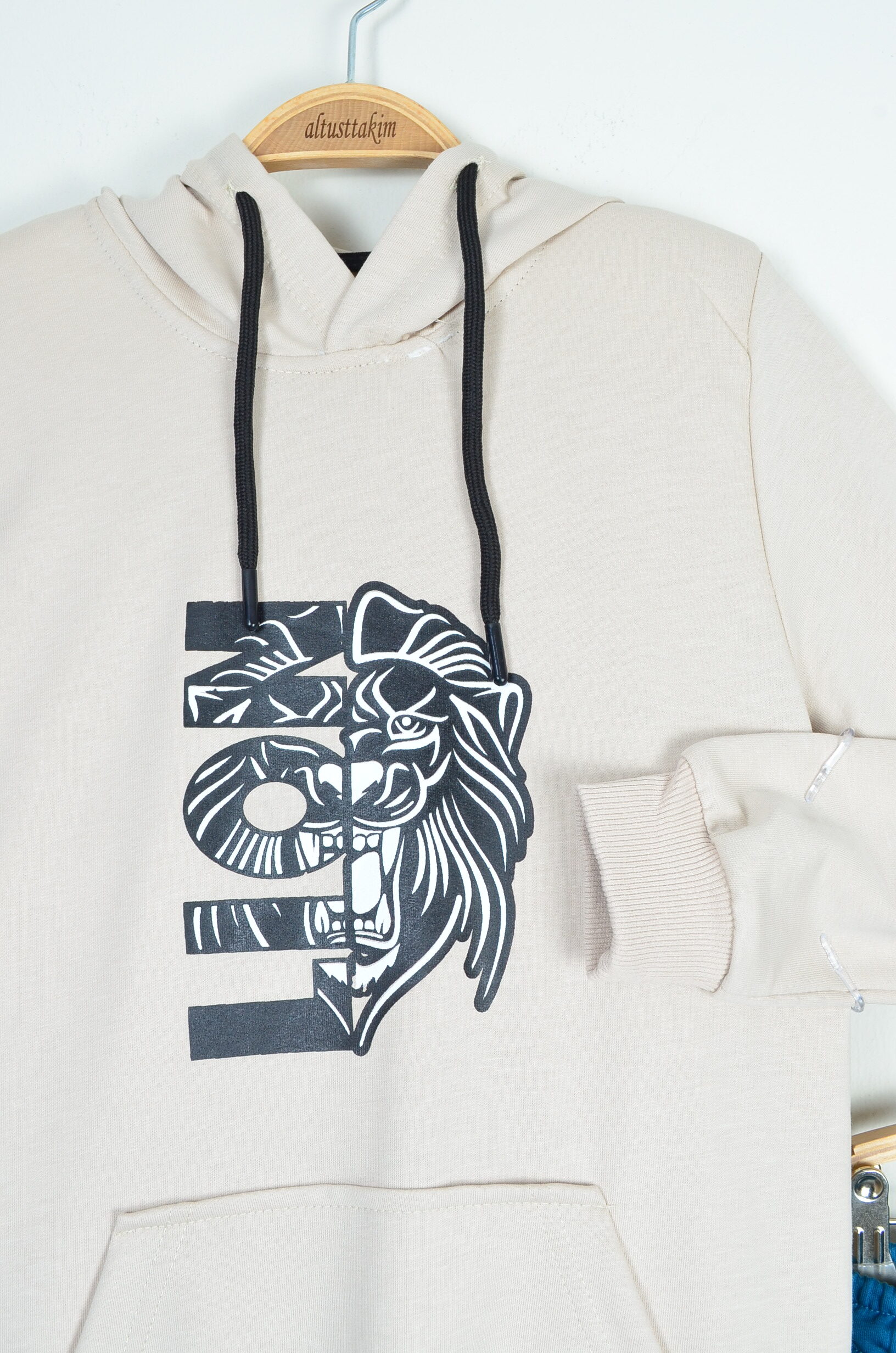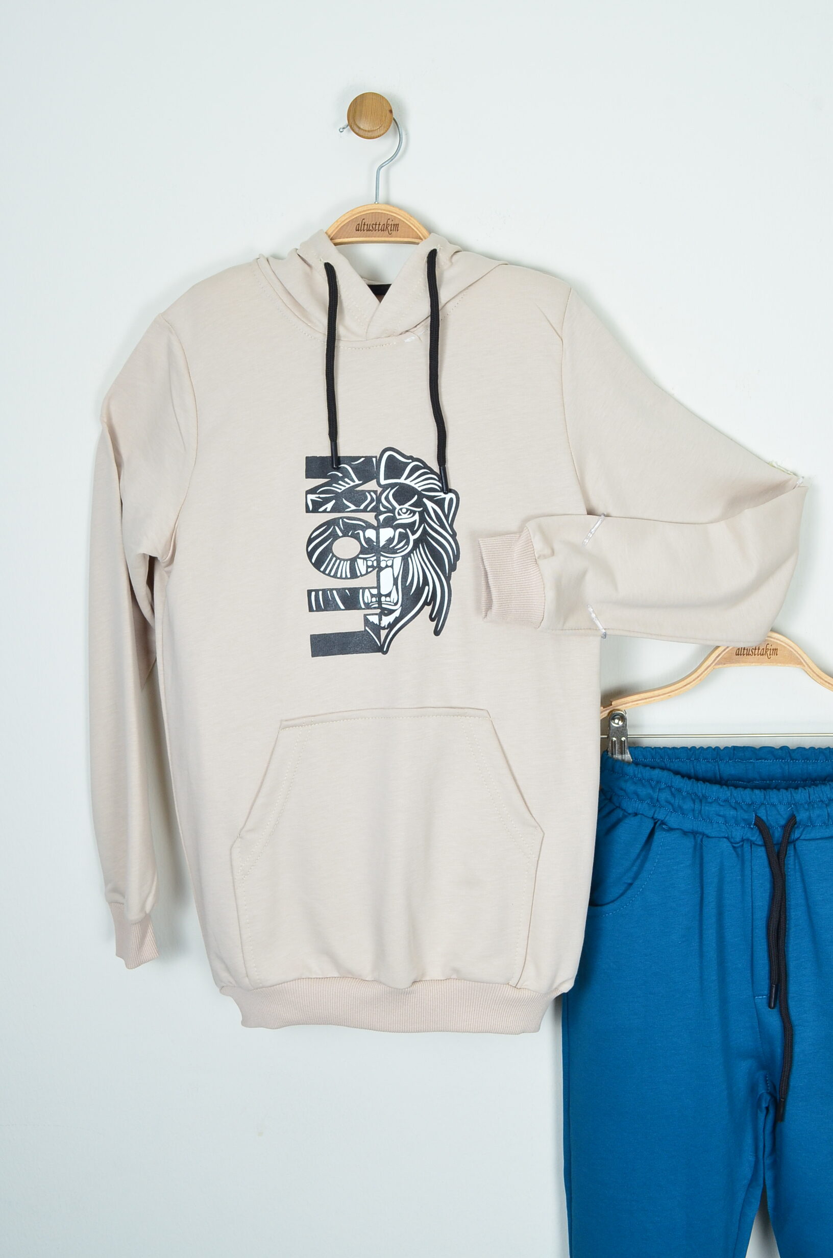 Serin günlerde okula, parka ve spora eşlik edecek bu takım; bej kapüşonlu hoodie ve mavi alt ile hem rahat hem de enerjik bir görünüm sunar. Büyük aslan baskısı ve paçadaki LION yazı detayı modern bir stil katar.