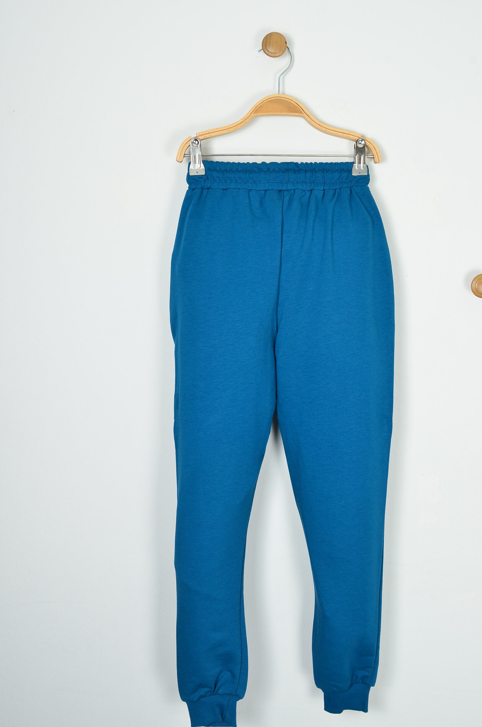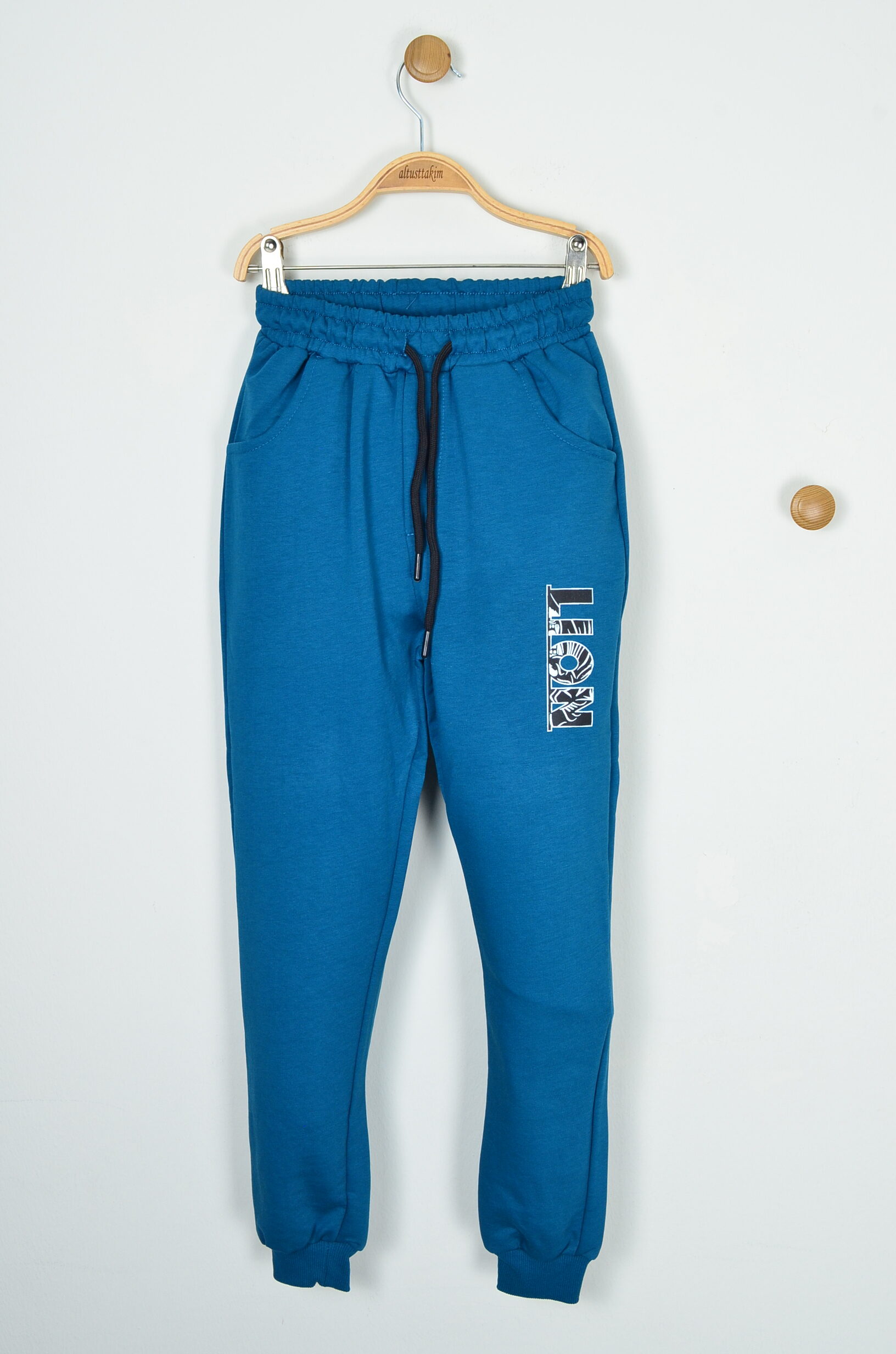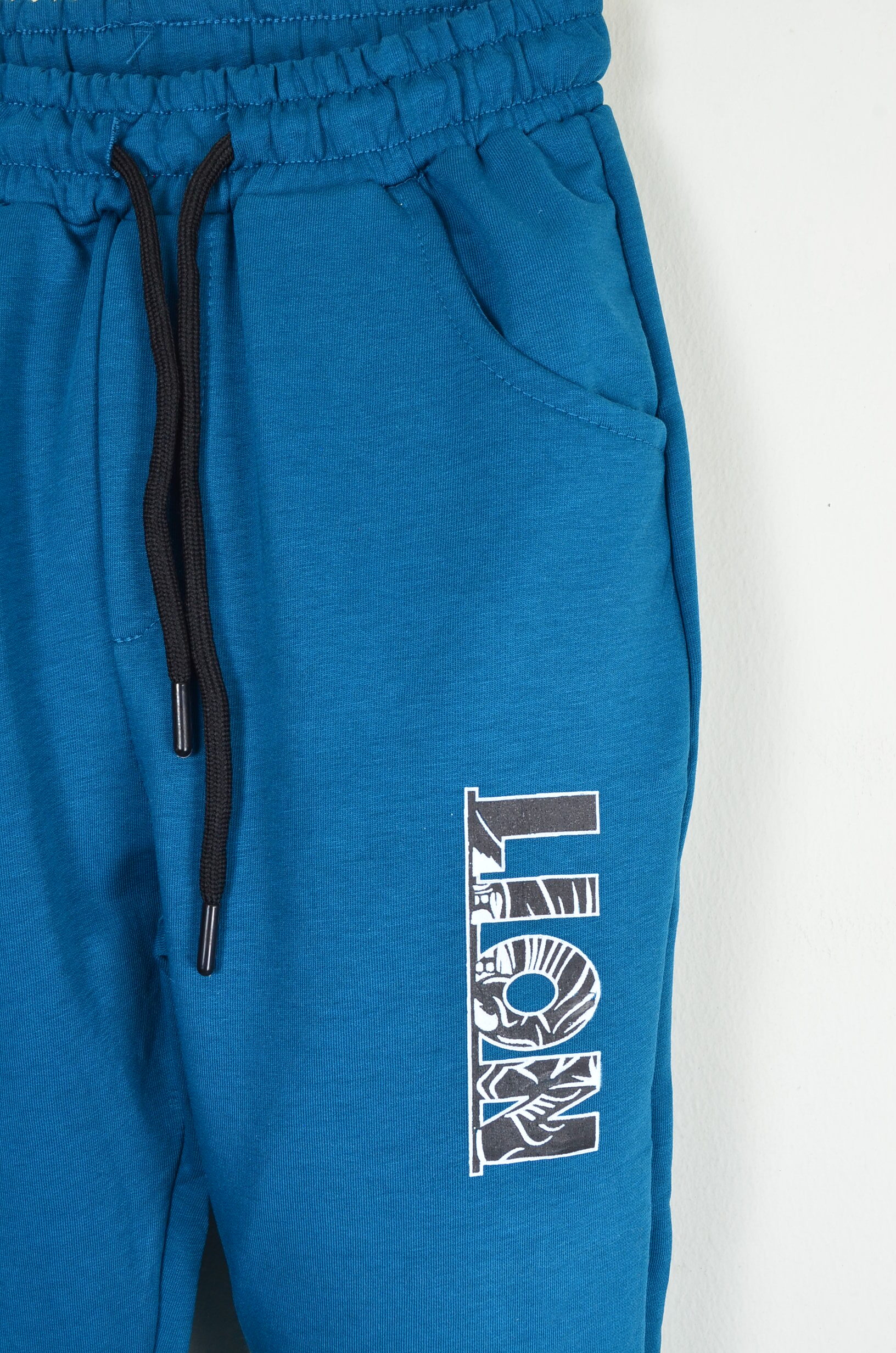 Alt: Mavi, belden lastikli + ayarlanabilir siyah bağcıklı, yan cepli; sağ paçada LION yazı/baskı detayı, paçalar ribanalı.