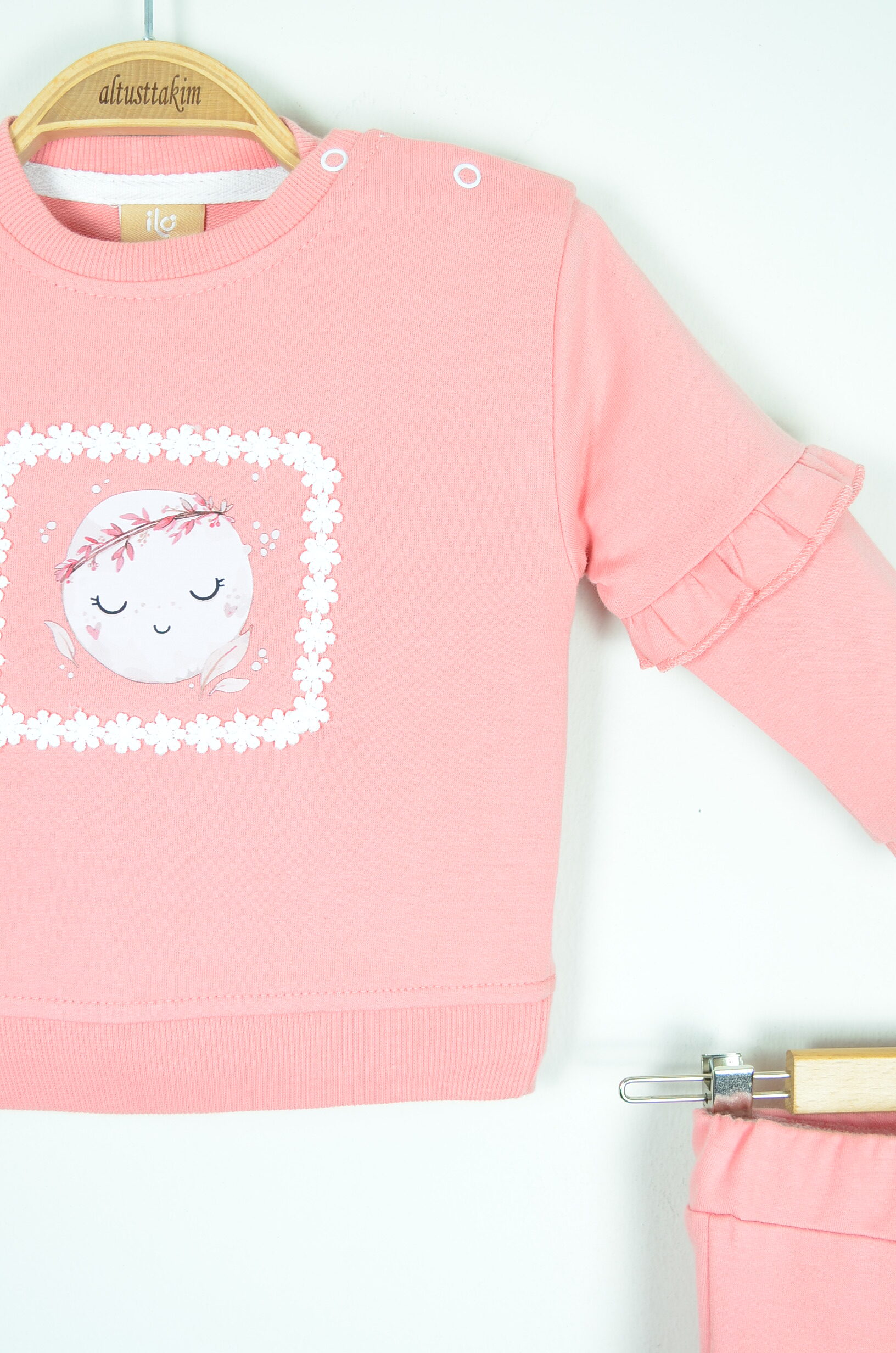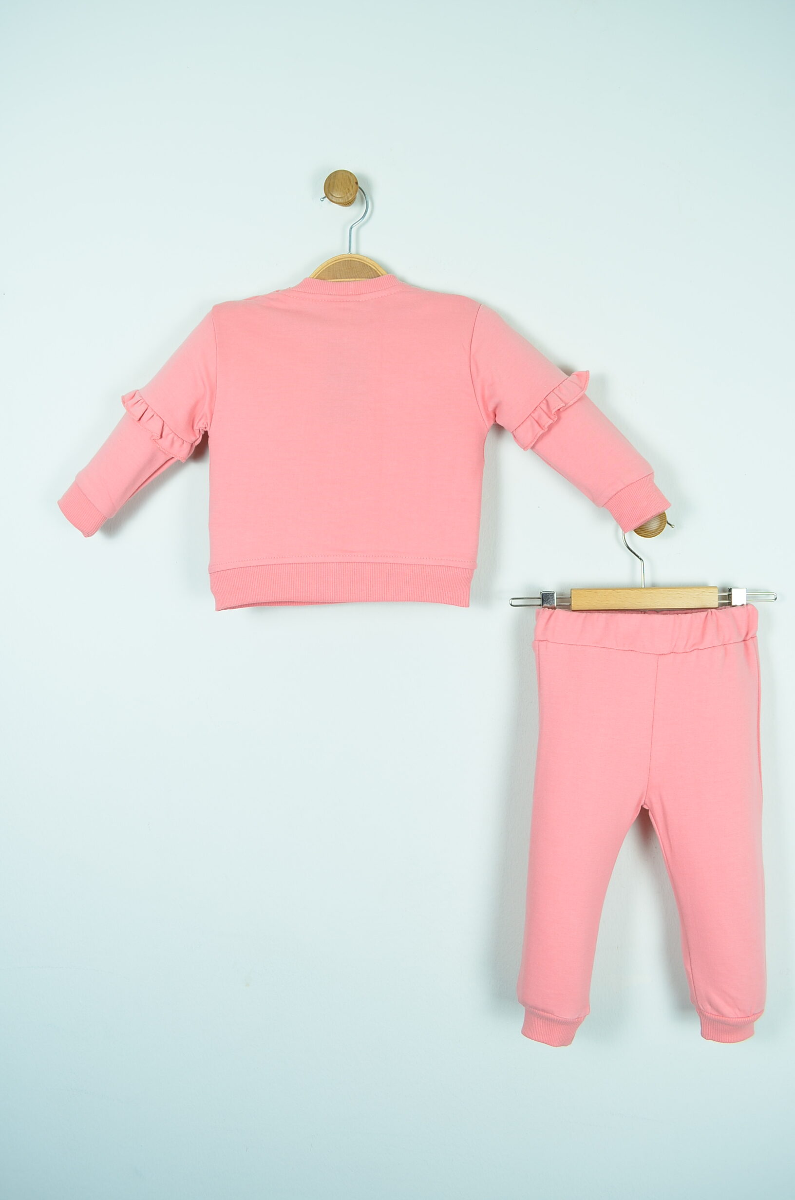 Bu iki parçalı eşofman takımı, minik prensesinizin hem evde hem dışarıda rahatça hareket etmesi ve gün boyu konforlu kalması için tasarlandı. Tatlı pembe tonu ve sevimli bebek figürü, takıma neşeli ve sevimli bir hava katarken, sweatshirt kollarındaki fırfır detayları şıklık ve zarafet sunar. Yumuşak ve sıcak tutan kumaşı sayesinde serin havalarda ve ev içi kullanımda ideal bir seçimdir.