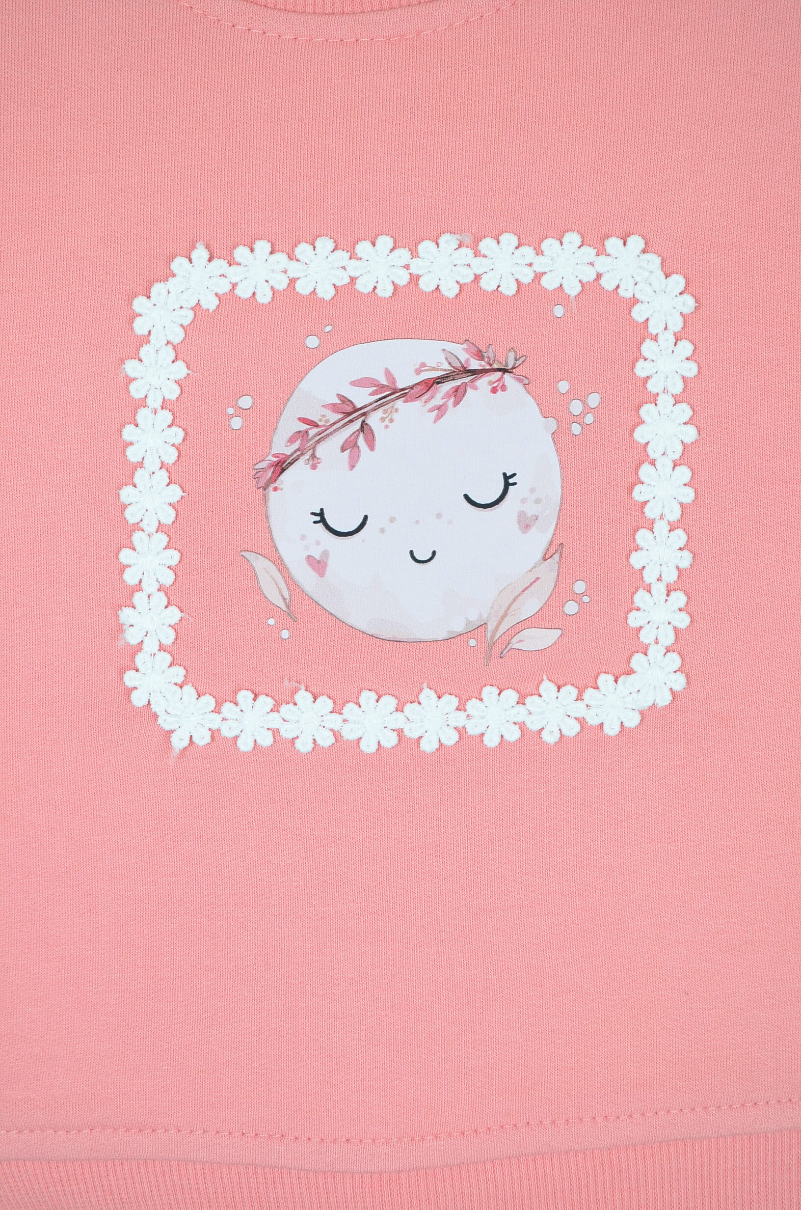 - Sweatshirt: Uzun kollu, bisiklet yaka, pembe renkli, ön kısmında sevimli bir bebek figürü baskısı ve kollarında fırfır detayları bulunur.