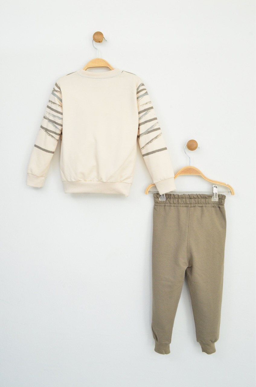 Bu bej renkli iki parça takım, 3 ila 6 yaş arasındaki miniklerin kış aylarında hem sıcak kalmasını sağlayacak hem de tarz sahibi görünmelerine yardımcı olacak. Üzerindeki “Hello Winter” yazısı ve modern çizgili deseniyle dikkat çeken bu takım, rahatlığı ve şıklığı bir arada sunuyor.