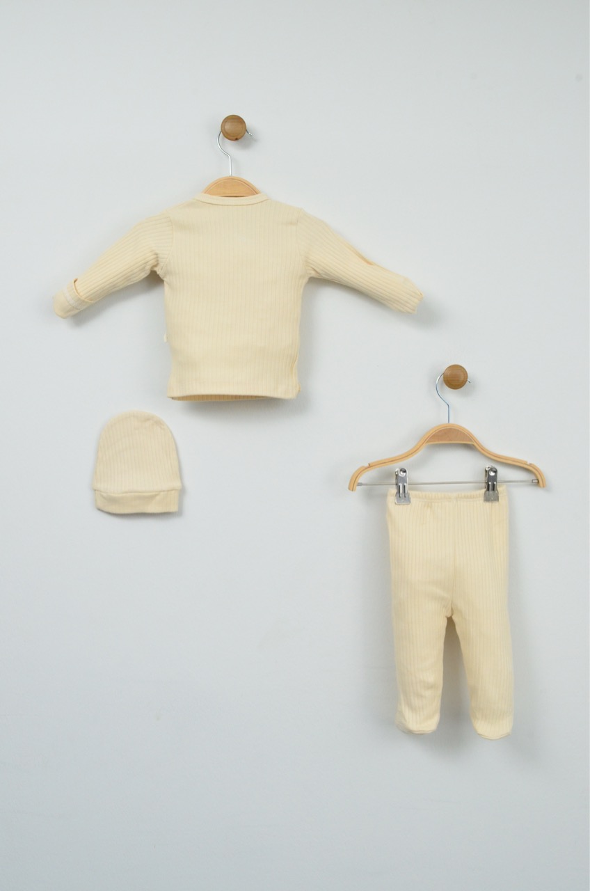 Bu sevimli krem rengi %100 pamuk yenidoğan üçlü takım, bebeğinizin ilk günlerinde ihtiyaç duyacağı konforu ve şirinliği bir arada sunar. Tamamen pamuk içeriği sayesinde bebeğinizin cildine nazikçe dokunur.
