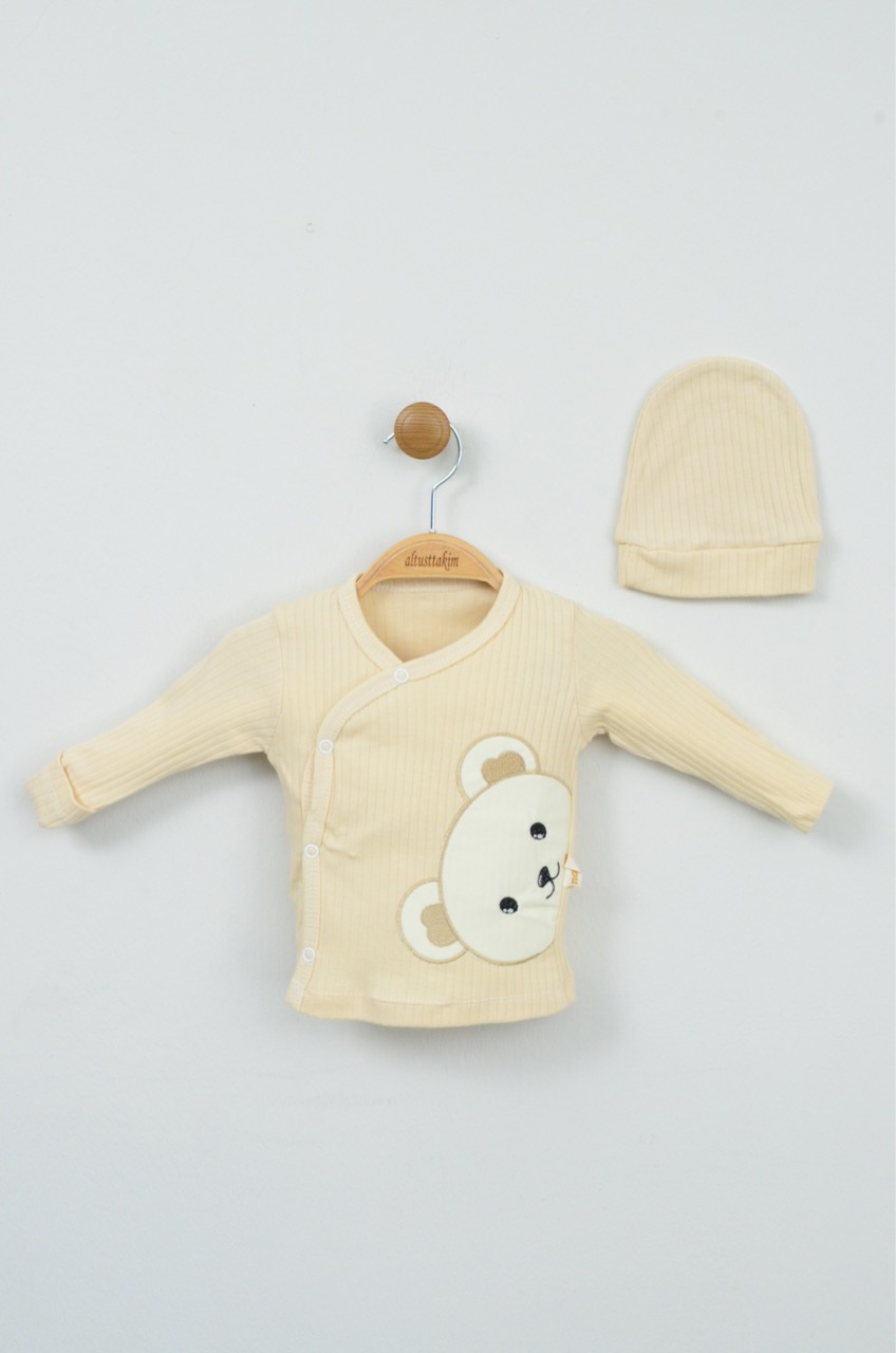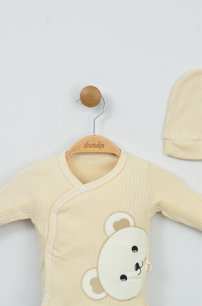 Bej Rengi Ayıcık Aplike %100 Pamuk Yenidoğan Üçlü Takım(0-3 Ay)