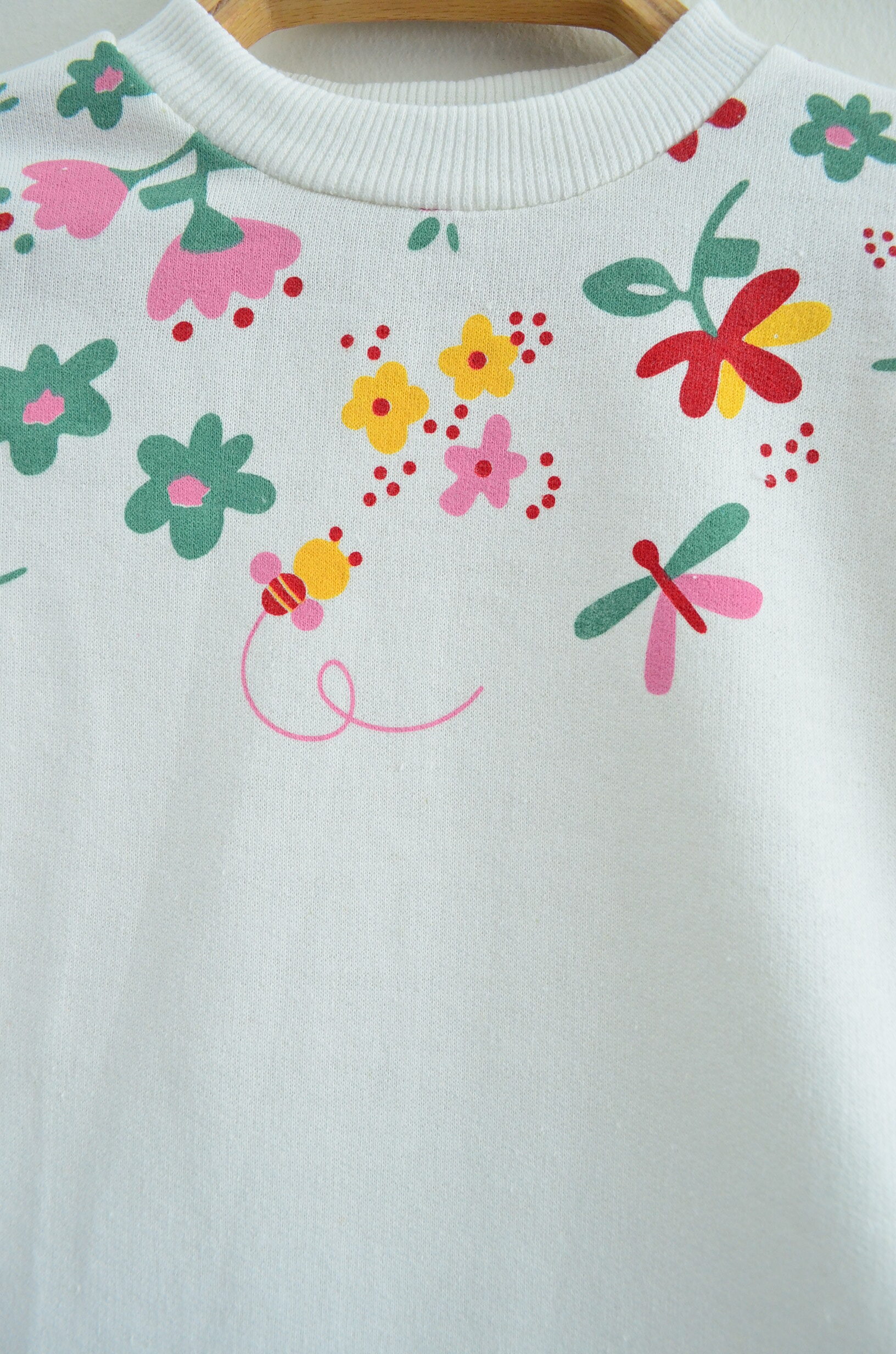 - Tişört: Bisiklet yaka, uzun kollu, beyaz renkli, ön kısmında çok renkli çiçek ve kelebek desenleri bulunur.