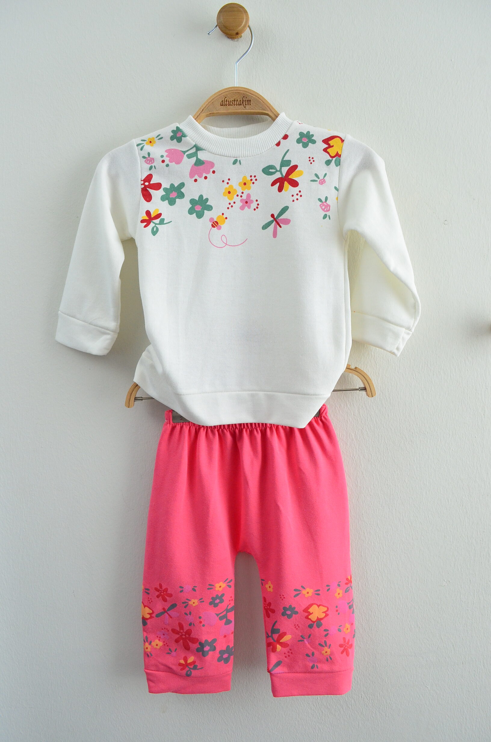 Beyaz Çiçek Desenli Tişört ve Pembe Şort Takım (%100 Pamuk)
