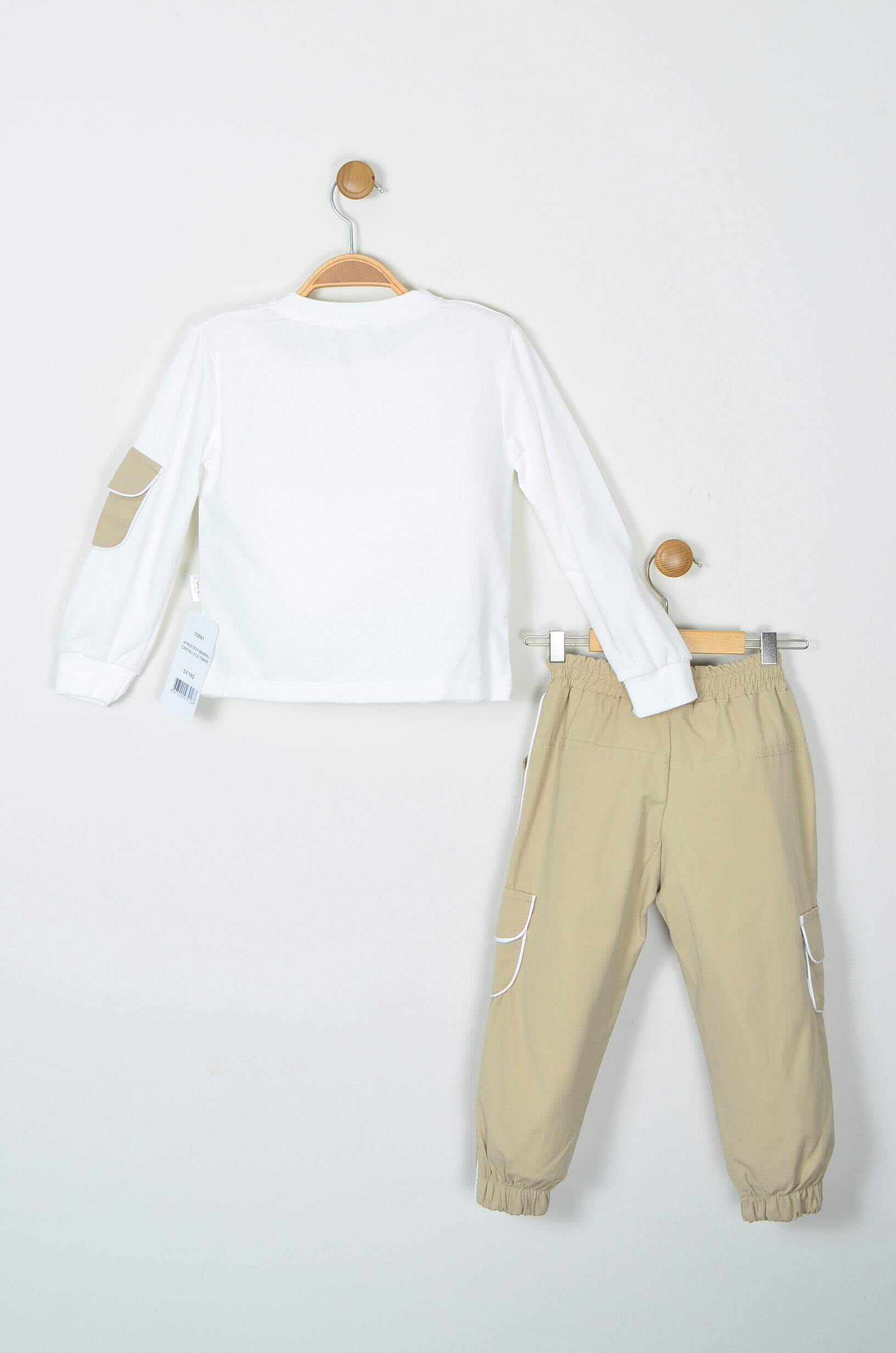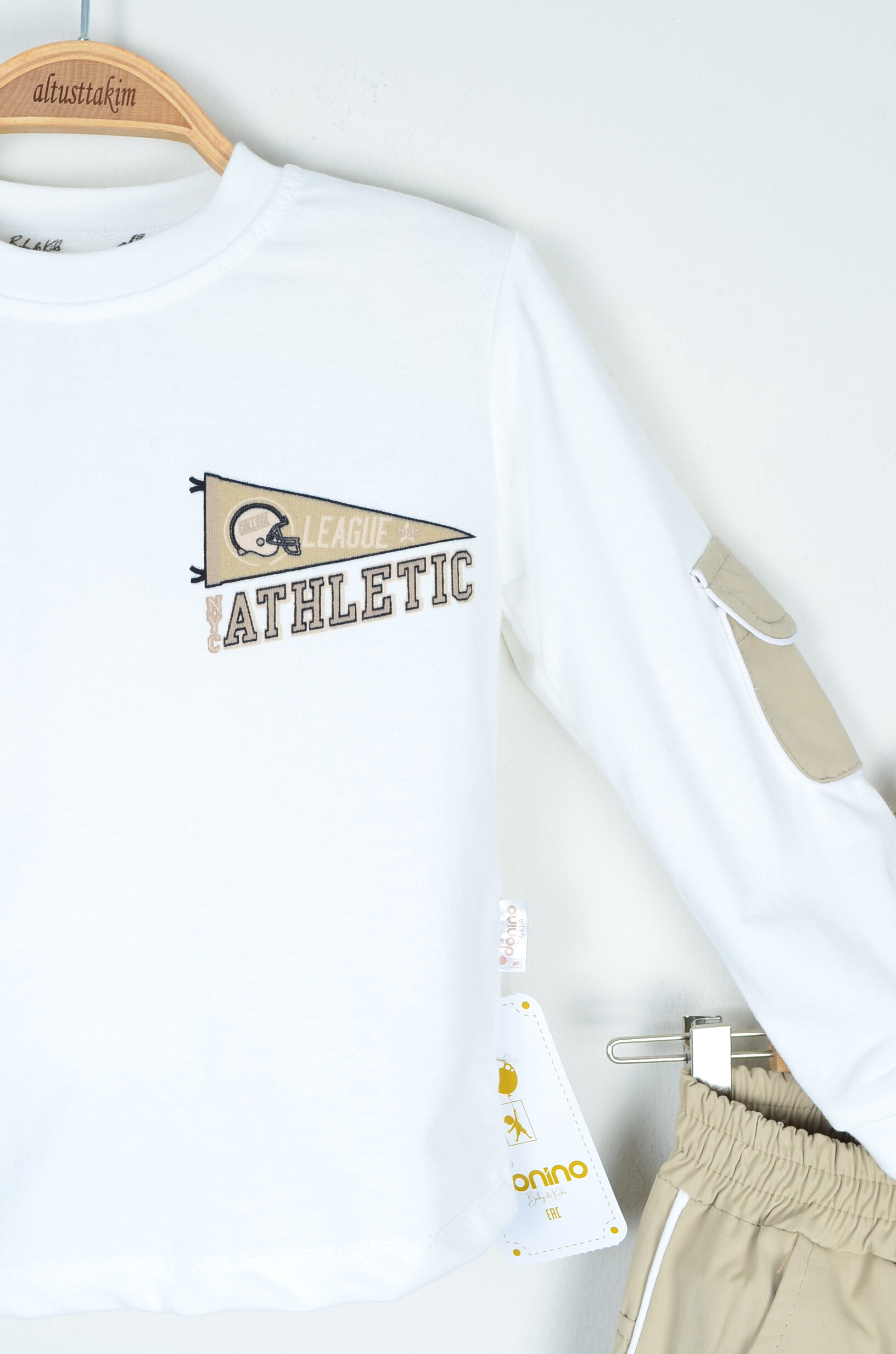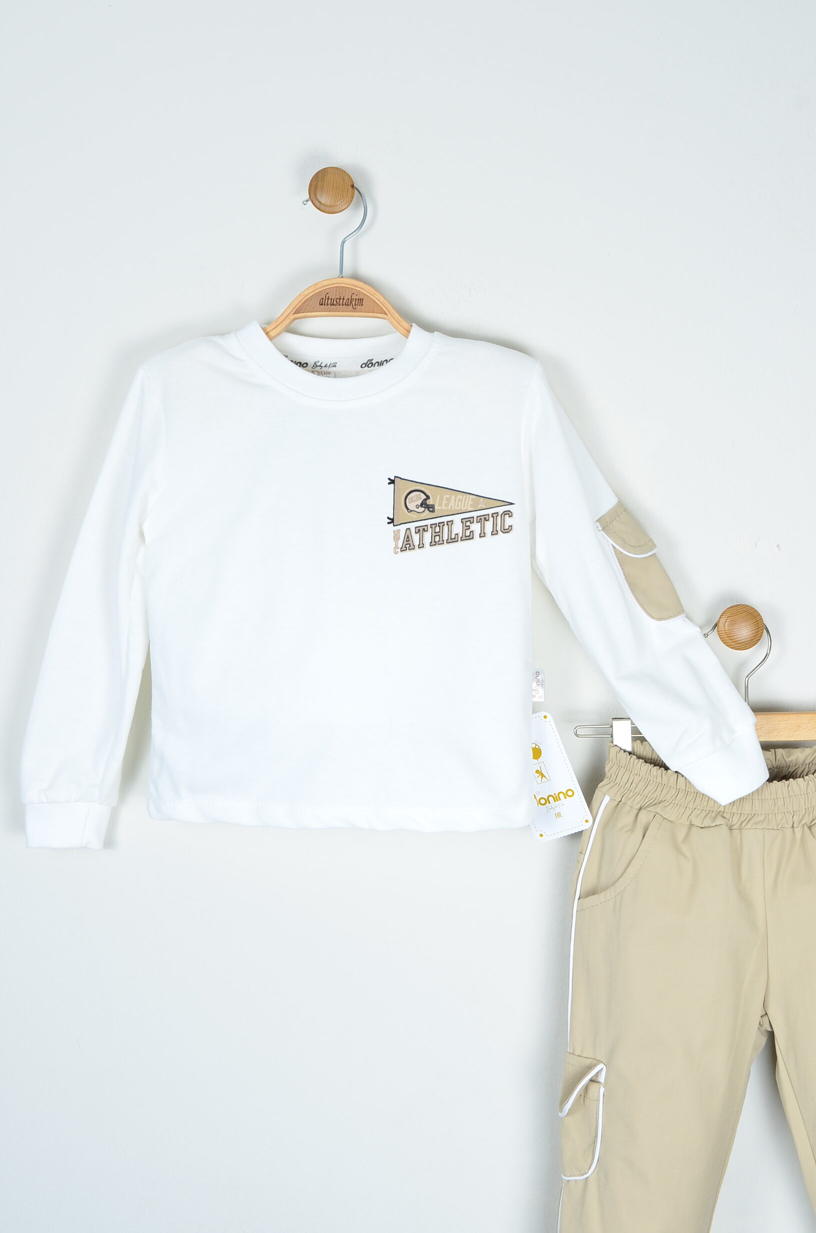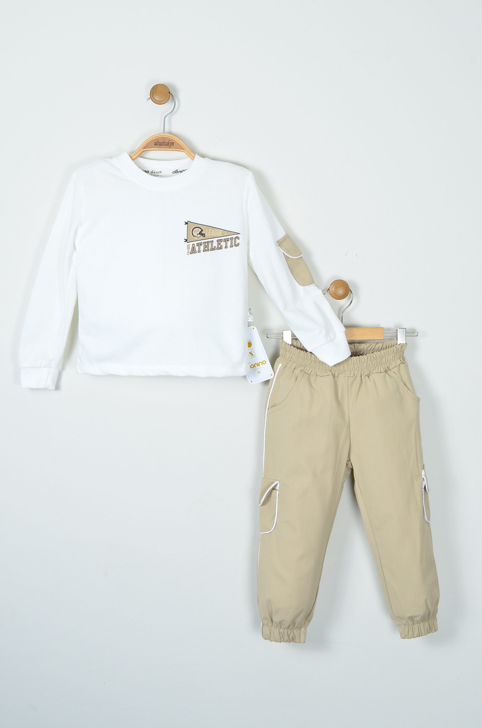 Bu üç parçalı takım, 2-5 yaş arası erkek çocuklarınız için rahatlığı ve trend spor stili bir araya getirir. Uzun kollu beyaz sweatshirt, kol kısımlarındaki yama detayı ve göğüs kısmındaki “ATHLETIC” yazısı ile dinamik bir görünüm sunar. Uyumlu bej renkli eşofman altı, ceplerinde ve dikiş yerlerinde bulunan beyaz biye detayları ile modern ve şıktır. Takıma dahil olan bej renkli omuz/bel çantası ile kombin tamamlanır ve çocuğunuzun eşyalarını taşıması için pratik bir aksesuar sunulur. Tüm parçalar %100 pamuk ince kumaştan üretilmiştir, bu sayede hassas ciltlere dosttur ve mevsim geçişlerinde idealdir.