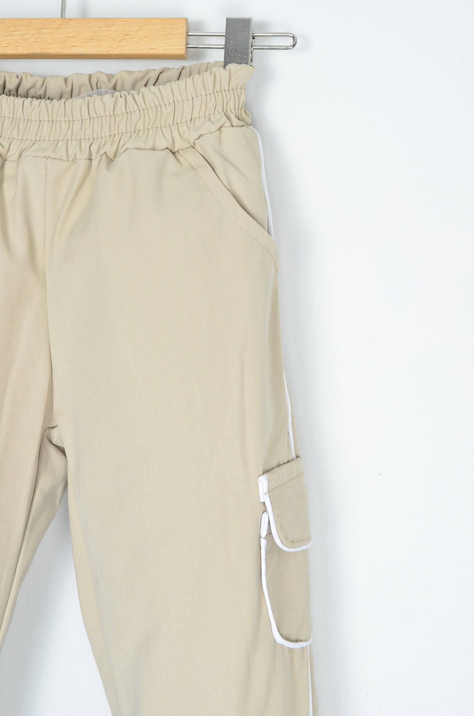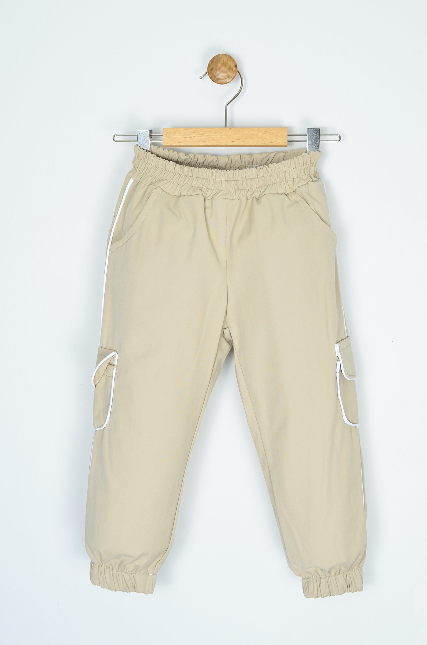 • Pantolon: Beli lastikli, yanlarda cep ve beyaz biye detayları bulunan, bej renkli eşofman altı.