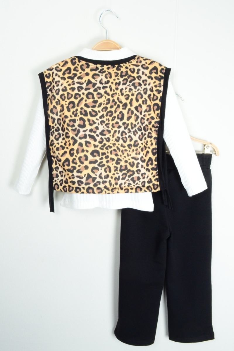 CMK Premium markasına ait bu şık ve modern kız çocuk kıyafet seti, günlük kullanım için ideal olup, çocuklarınıza rahat ve tarz bir görünüm sunar. Set, leopar desenli üst, beyaz uzun kollu içlik ve siyah pantolondan oluşmaktadır. Üst kısmında yer alan bağlama detayı ile şıklığı ön plana çıkarır.