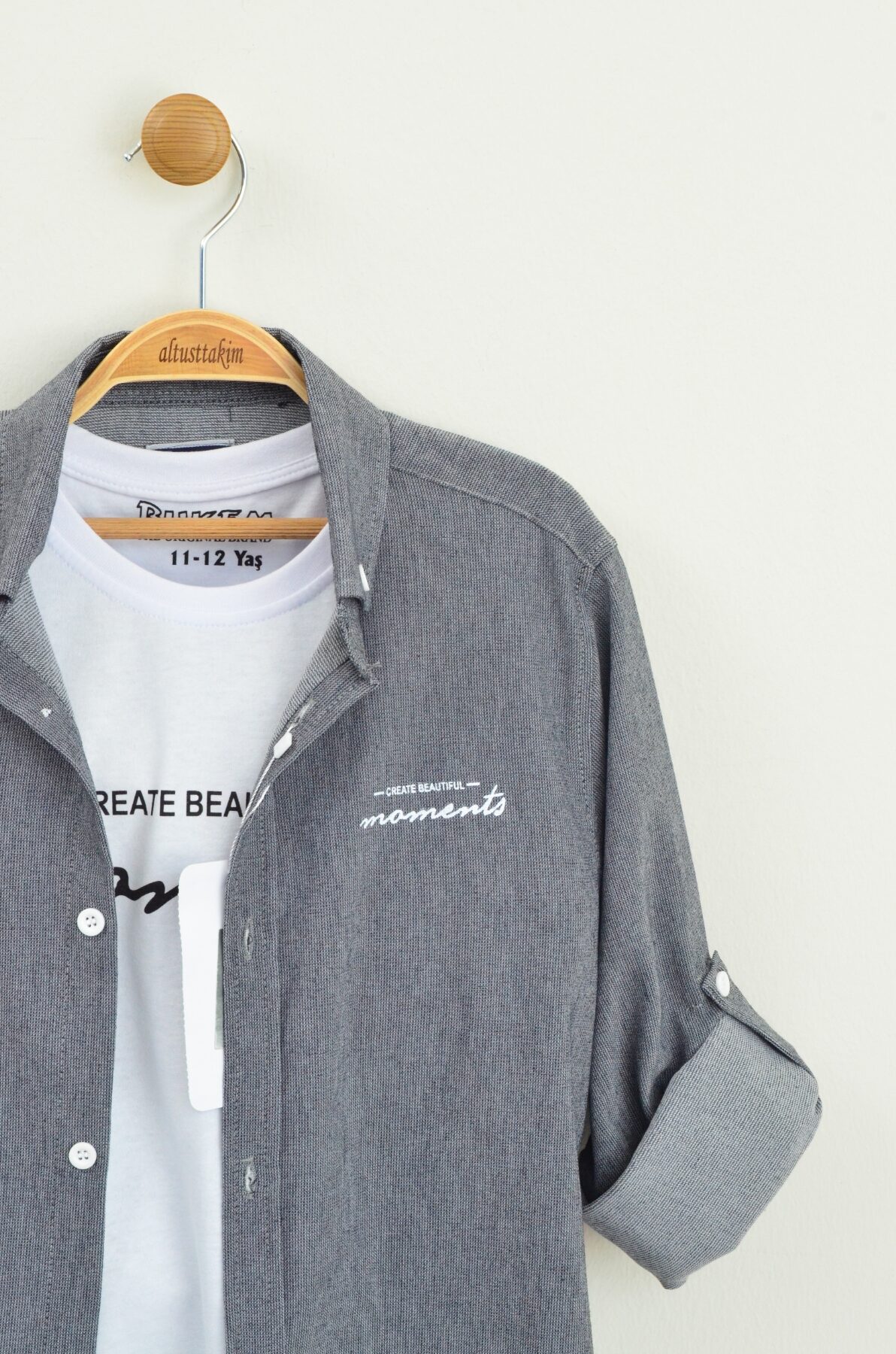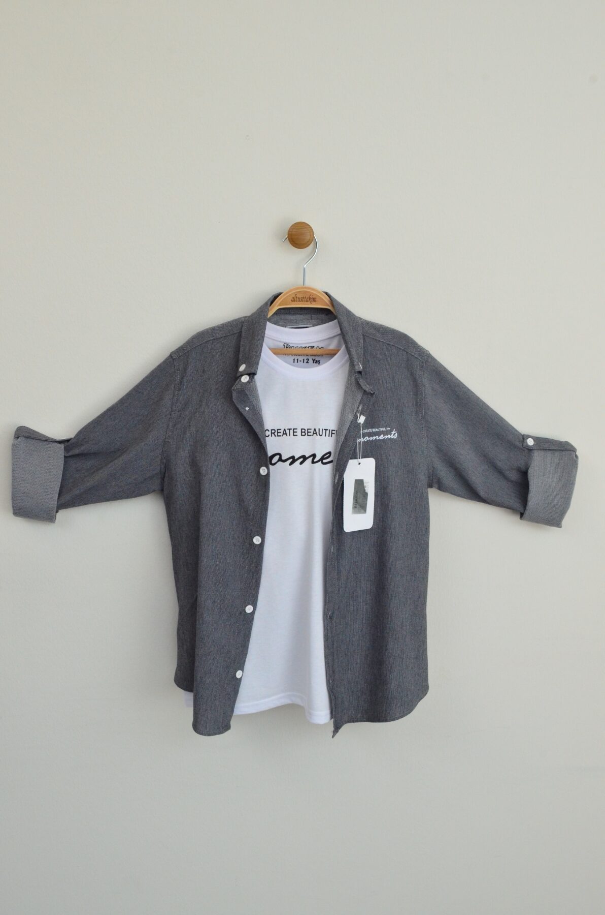 • Üst: Gri gömlek, “Create Beautiful Moments” yazısı baskılı, beyaz tişört ile kombinlenmiş