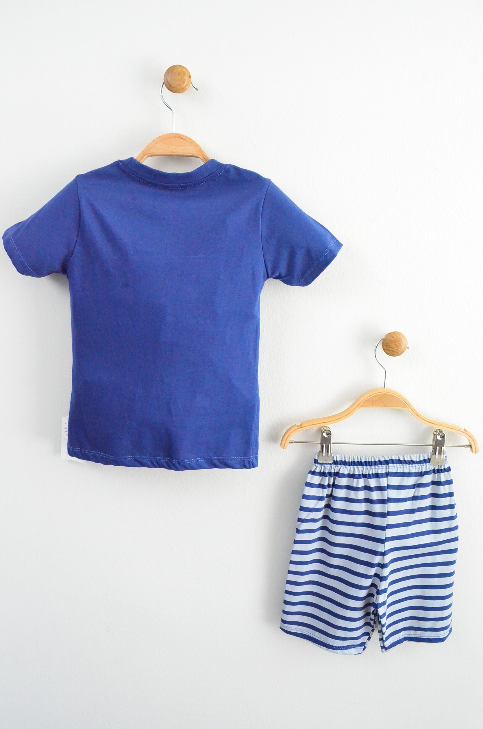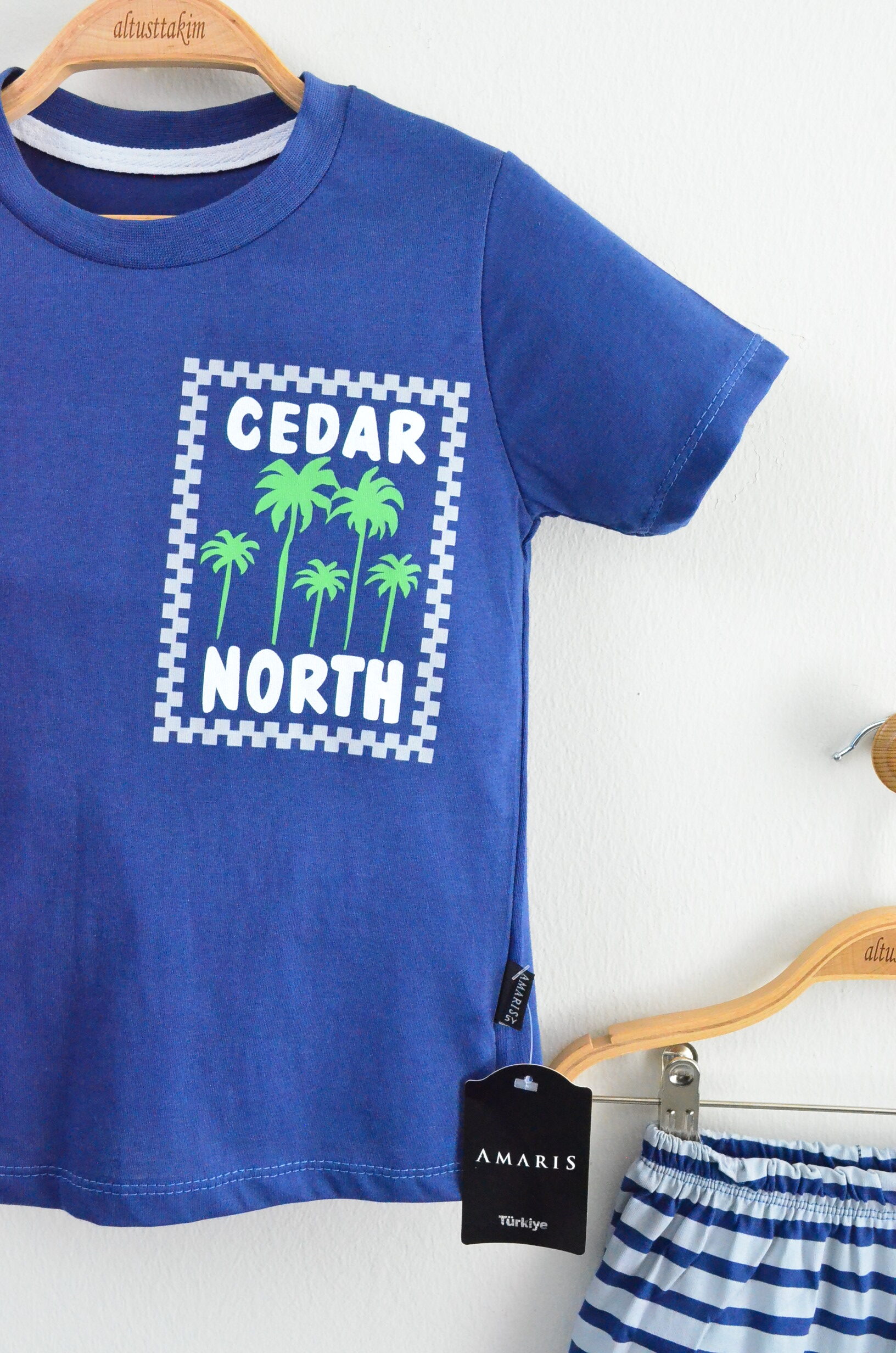Bu iki parçalı takım, minik maceraperestlerin yaz aylarında hem serin kalması hem de enerjik bir stil sergilemesi için tasarlandı. Koyu mavi tişörtün ön kısmındaki palmiye ağaçları ve “CEDAR NORTH” yazısı, uyumlu mavi-beyaz çizgili şortla birleşerek deniz ve kumsal ruhunu yansıtan neşeli bir görünüm sunar.