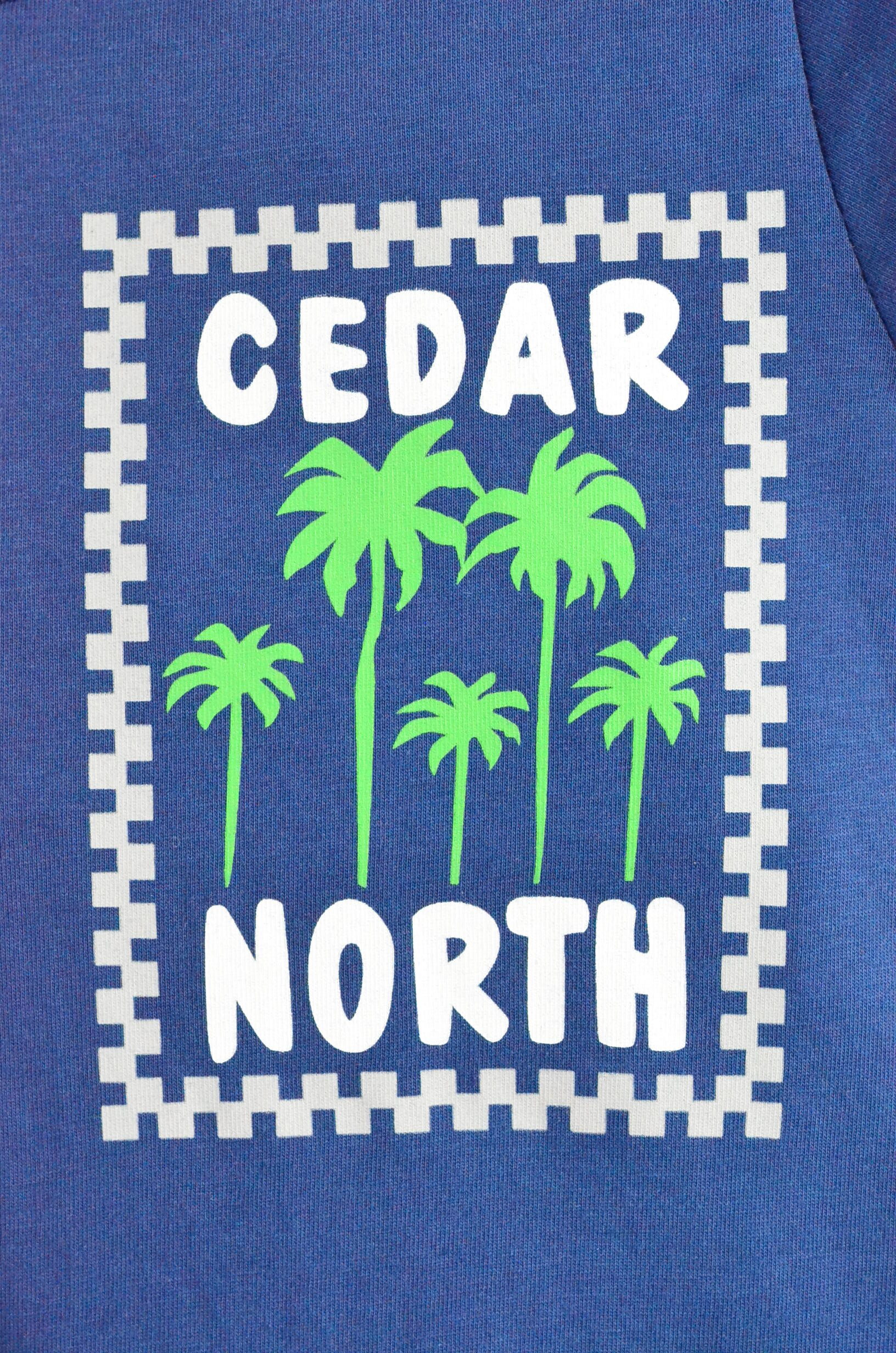 Üst: Kısa kollu, bisiklet yaka, lacivert renkli, ön kısmında palmiye ağacı baskısı ve “CEDAR NORTH” yazısı bulunur.
