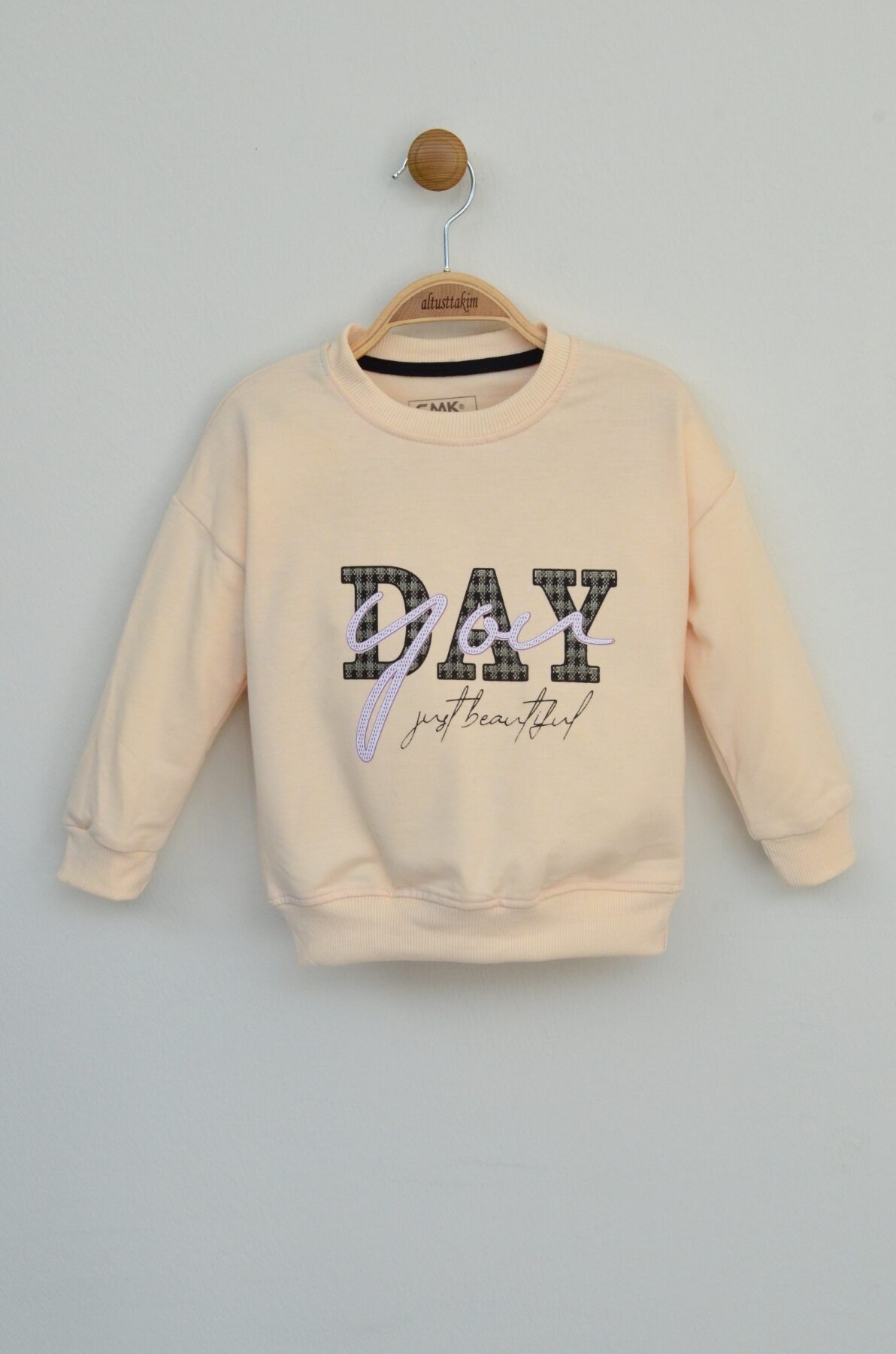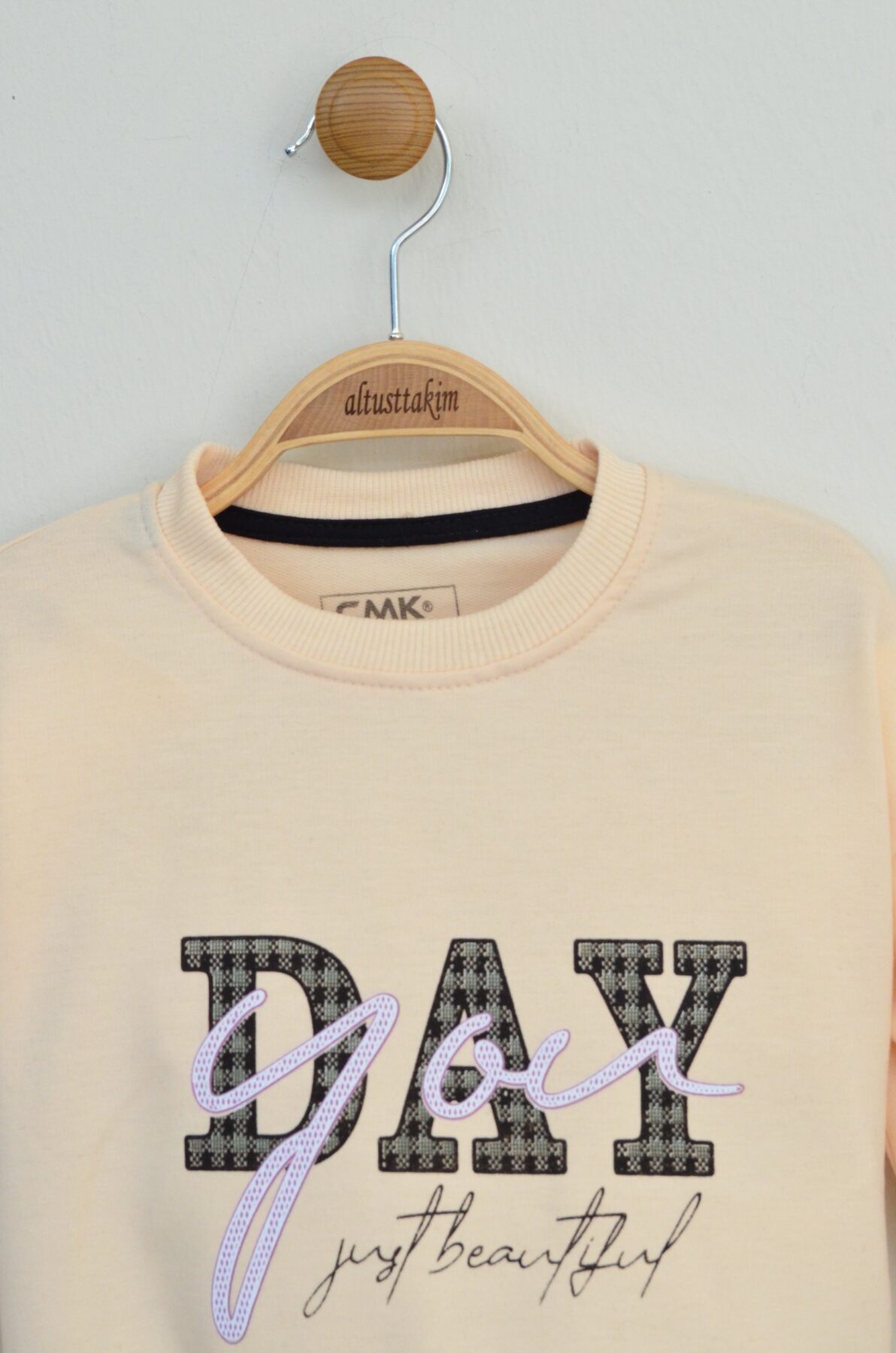 Miniklerin günlük hayatında hem rahat hem de şık olmasını sağlayacak bu iki parça takım, ekru rengi ve “Day Beauty Be” baskısıyla dikkat çekiyor. Yumuşacık pamuklu kumaşı sayesinde çocuğunuz gün boyu konforlu hissederken, şık tasarımıyla da göz kamaştıracak.