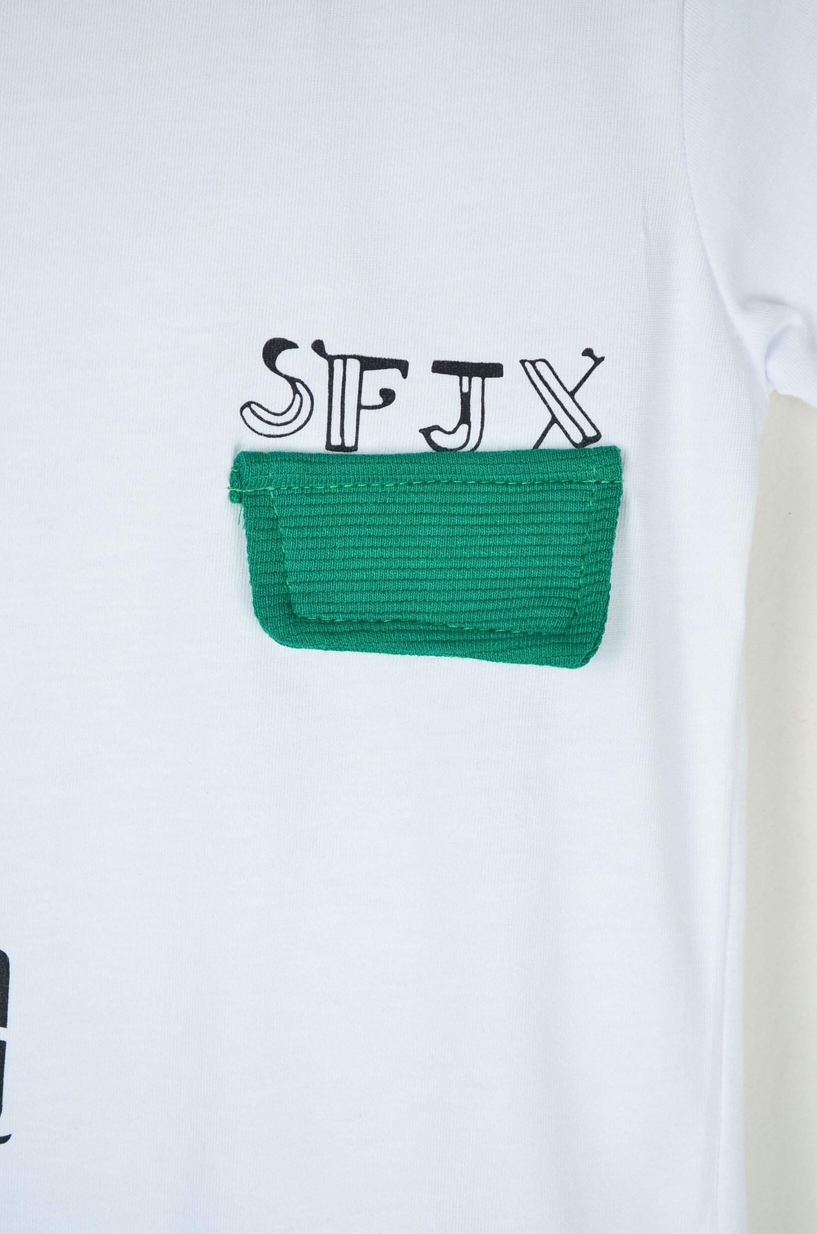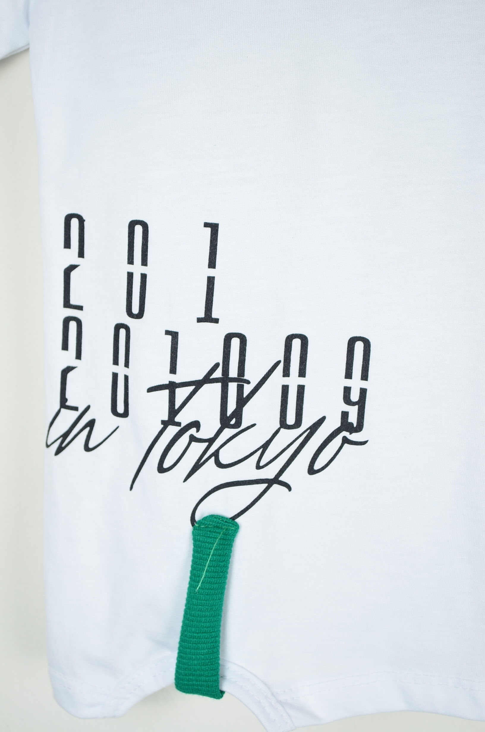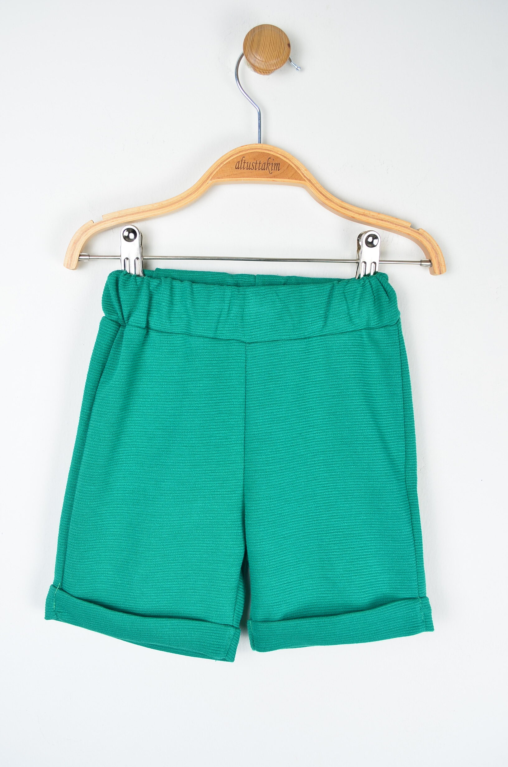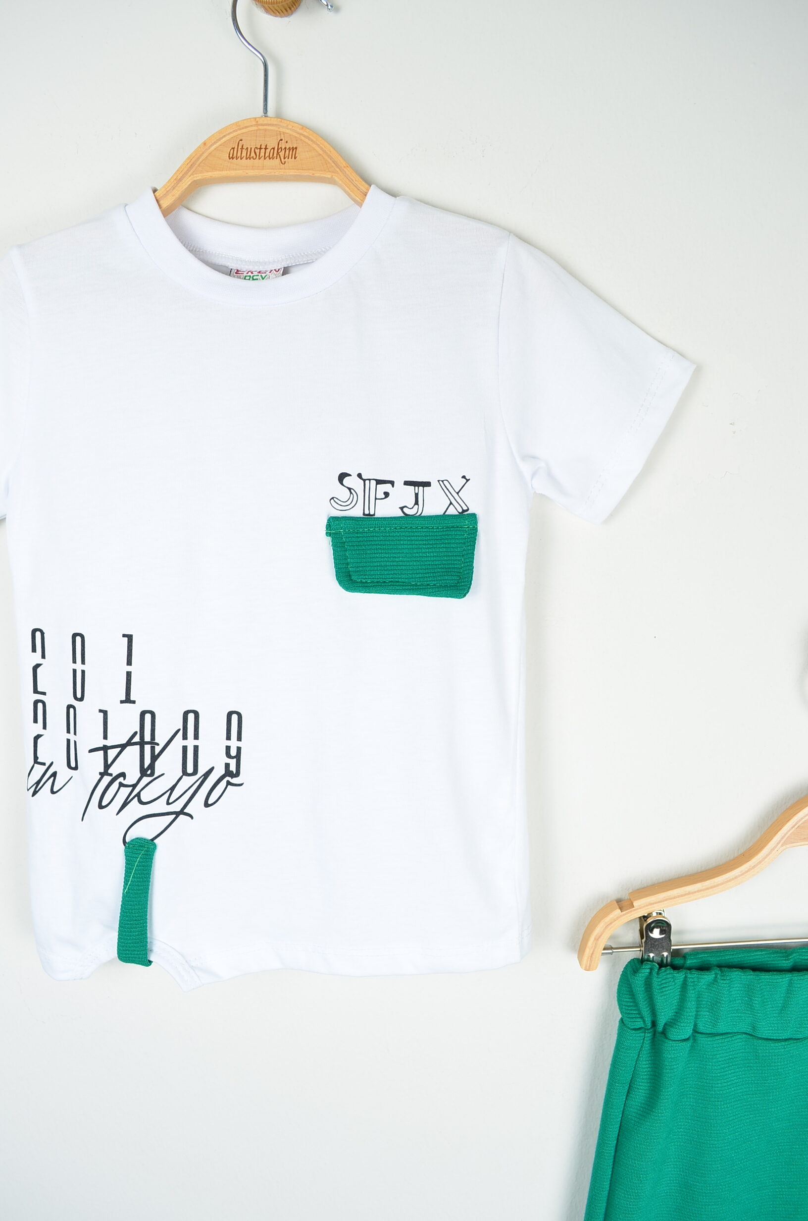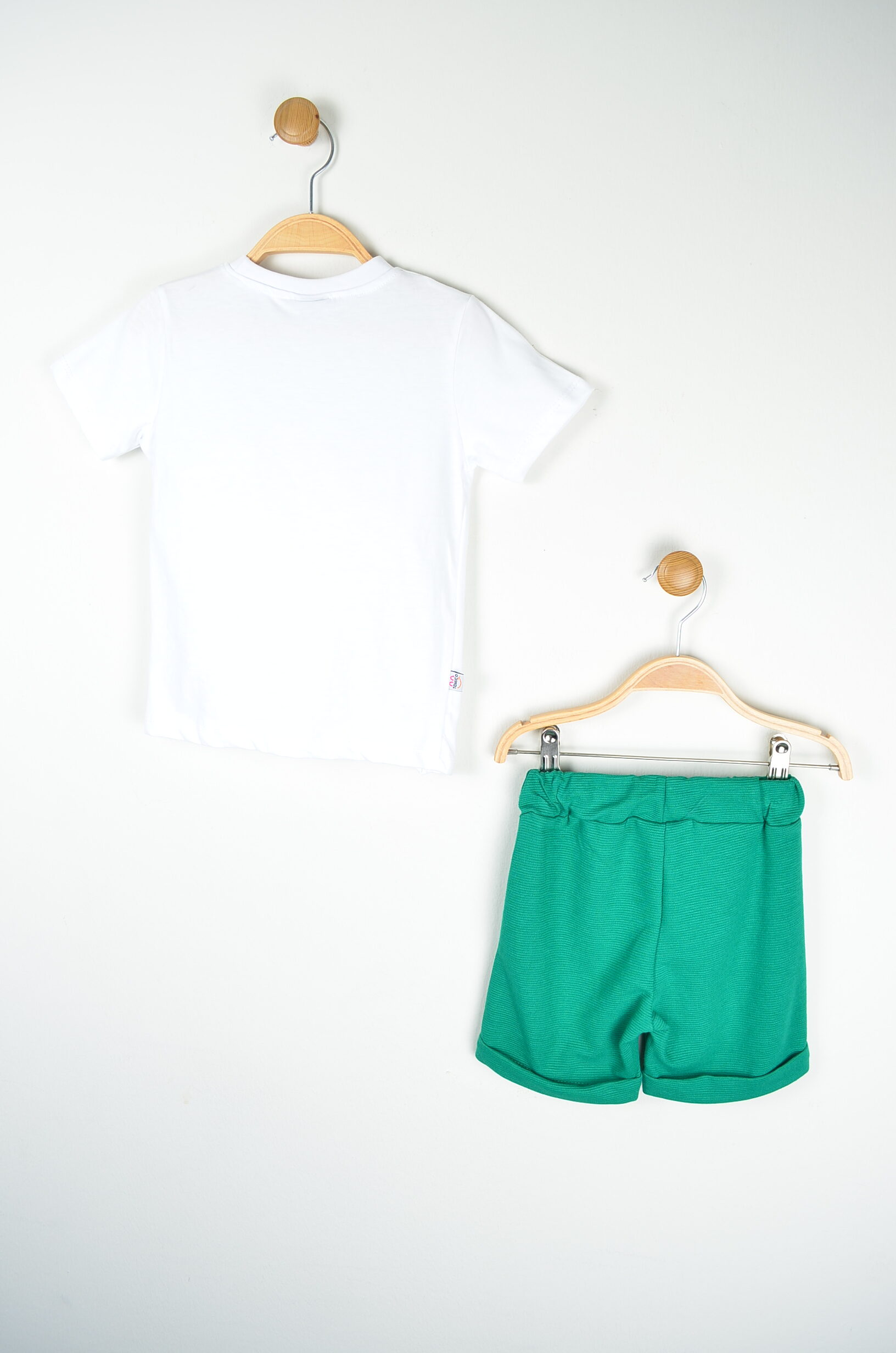 Takımın üst parçası olan beyaz tişört, canlı yeşil renkteki eğlenceli ve modern grafik baskısıyla şortla uyumlu bir görünüm sağlar. Kısa kollu ve bisiklet yaka kesimi, sıcak havalarda rahat bir kullanım sunar. Alt parça olan yeşil şort ise, üzerindeki ince beyaz çizgilerle şık bir detay kazanmıştır. Paça kıvrımları ve rahat kesimi sayesinde çocuğunuz gün boyu özgürce hareket edebilir.