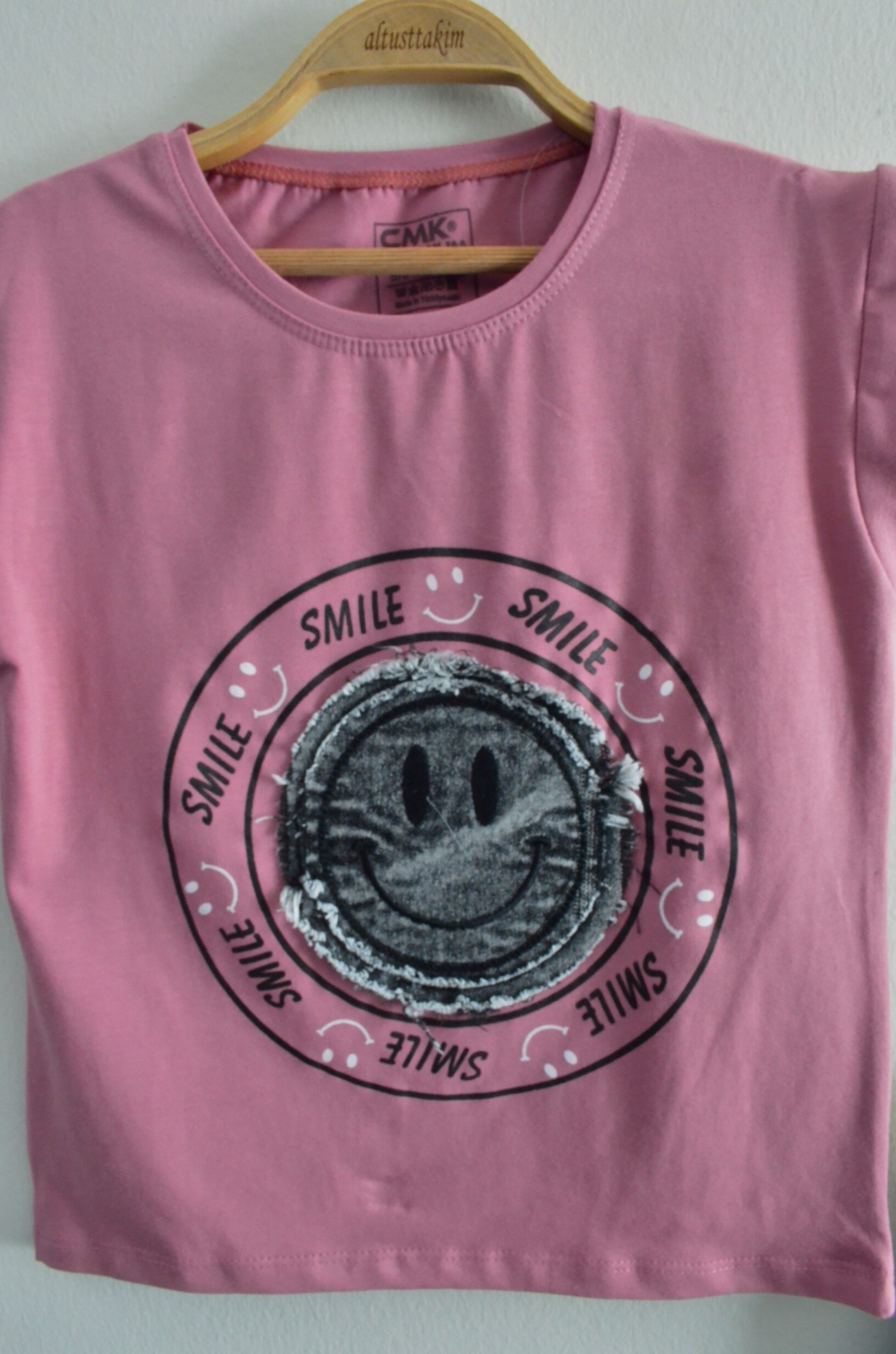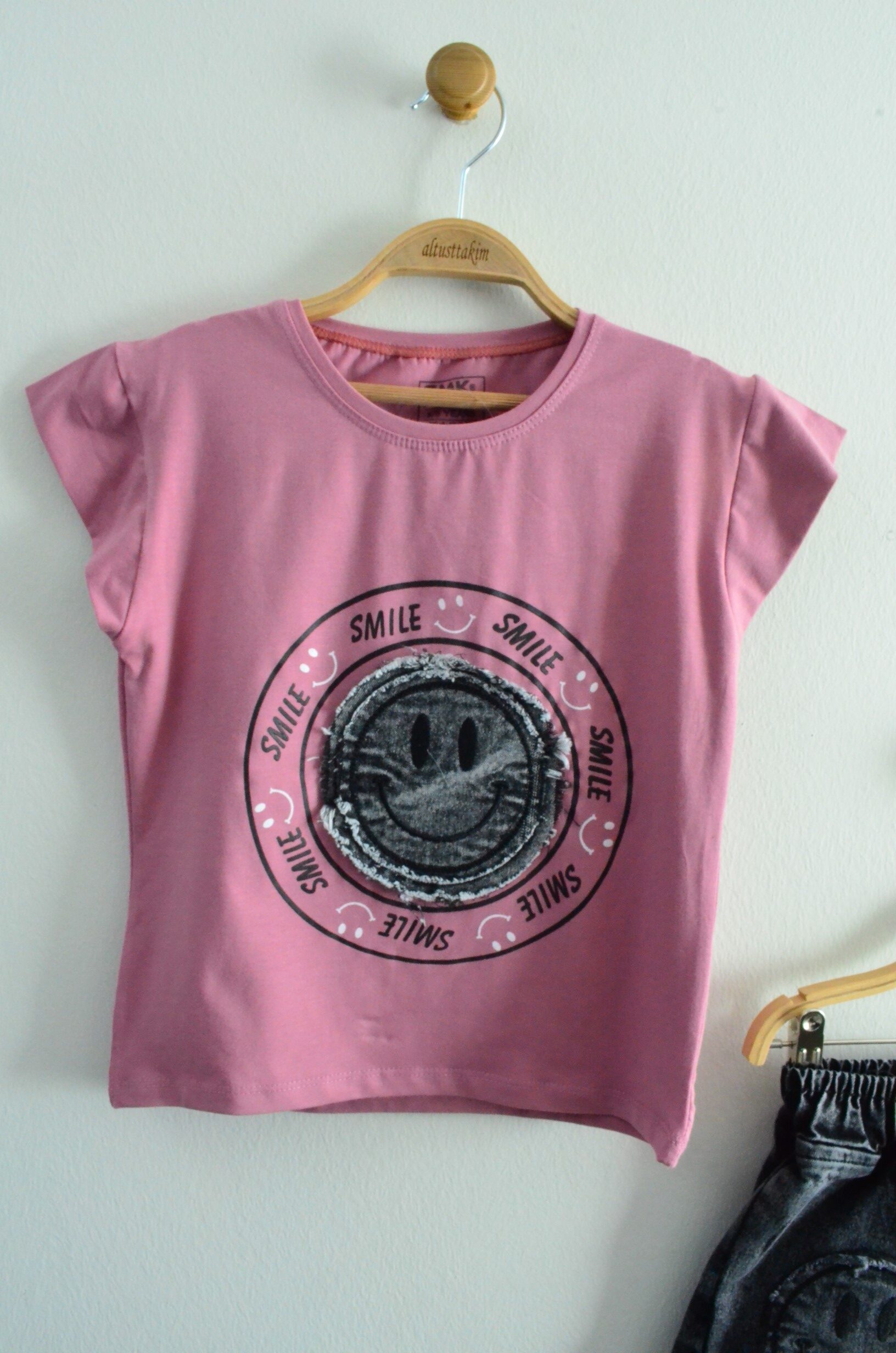 Tişörtün ön yüzünde, “SMILE” yazılarıyla çevrelenmiş, gülen yüz (smiley) figürlü bir baskı bulunmaktadır; bu detay takıma sevimli ve pozitif bir hava katar. Omuzlardaki küçük fırfırlar ise tişörtün zarifliğini artırır.