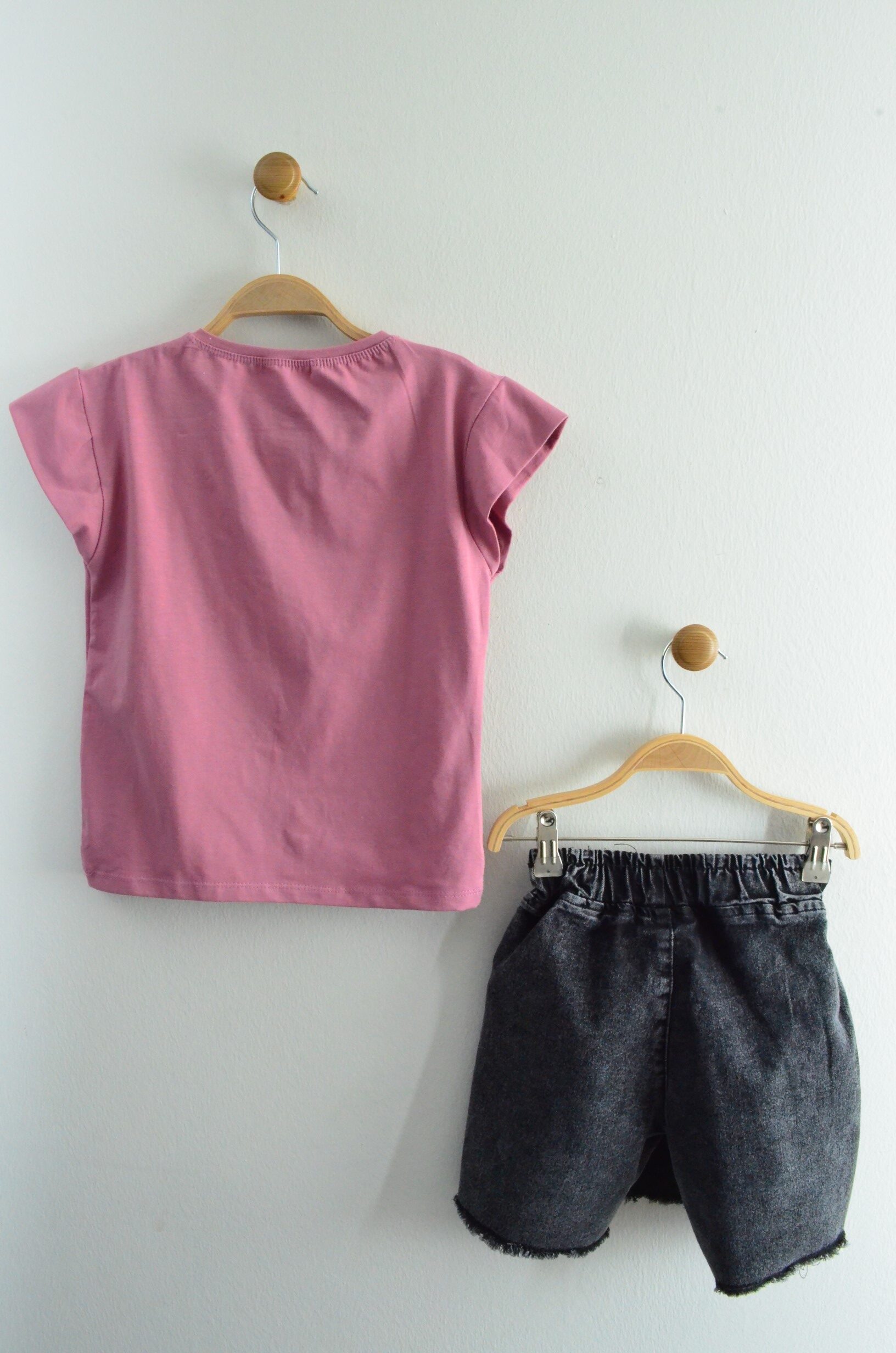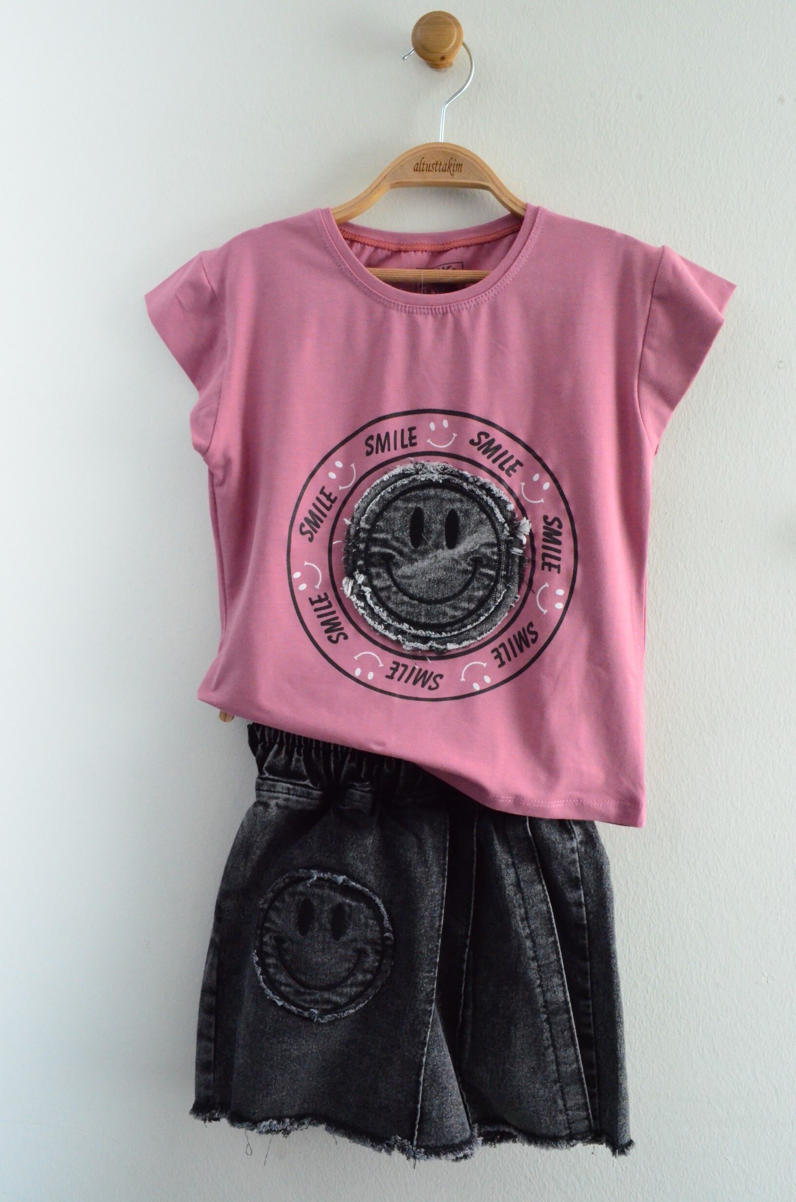 Takım, gül kurusu renginde, omuzları fırfırlı kısa kollu bir tişört ile yıkanmış görünümlü füme renkte bir kot etek şorttan oluşmaktadır.