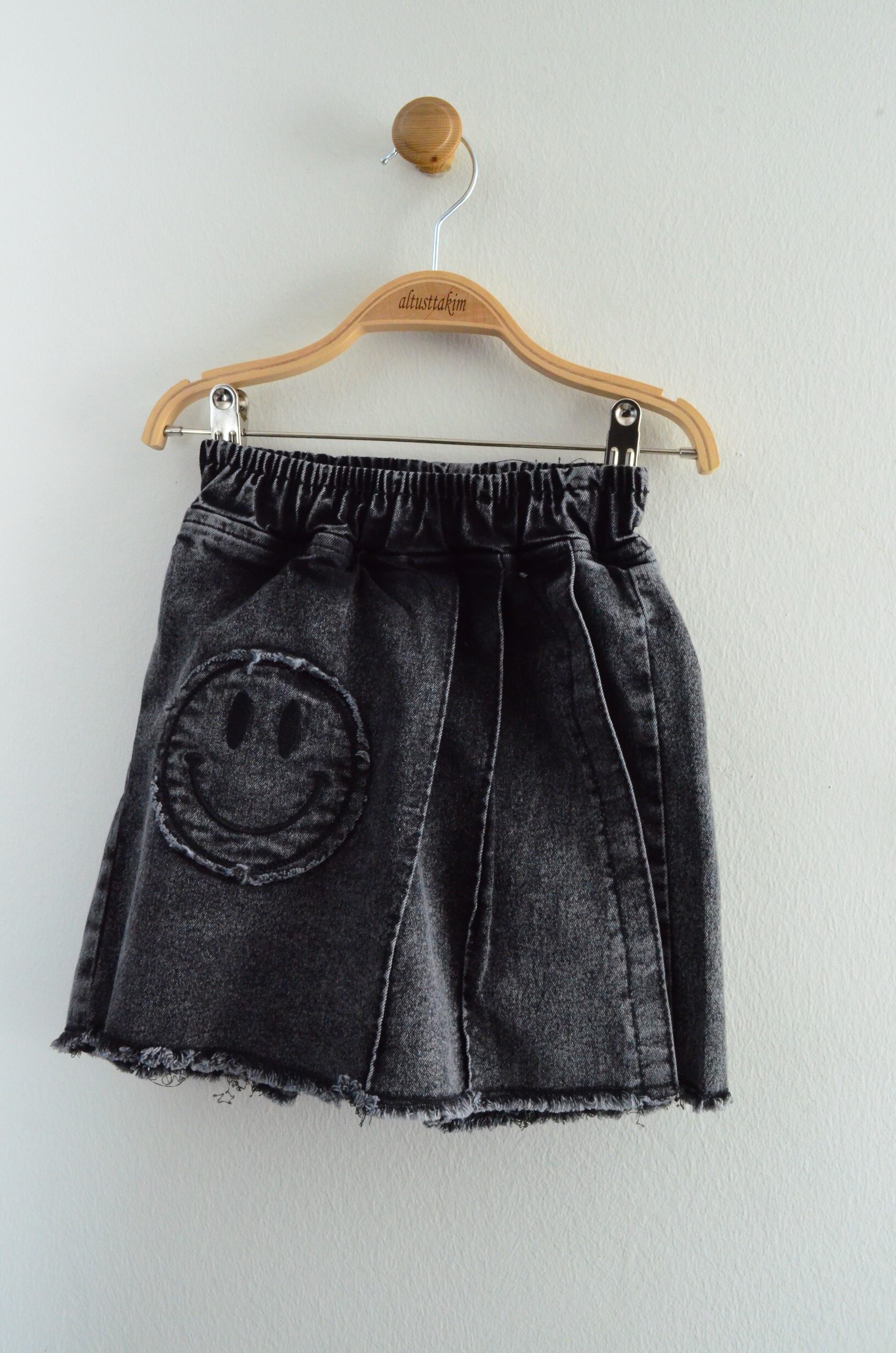 Etek şortun ön kısmında da tişörtle aynı temada, işlenmiş gülen yüz (smiley) detayı yer alır; bu detay etek şorta eğlenceli ve modern bir dokunuş katar. Esnek belli etek şort, çocukların hareket özgürlüğünü kısıtlamaz ve gün boyu konfor sağlar.