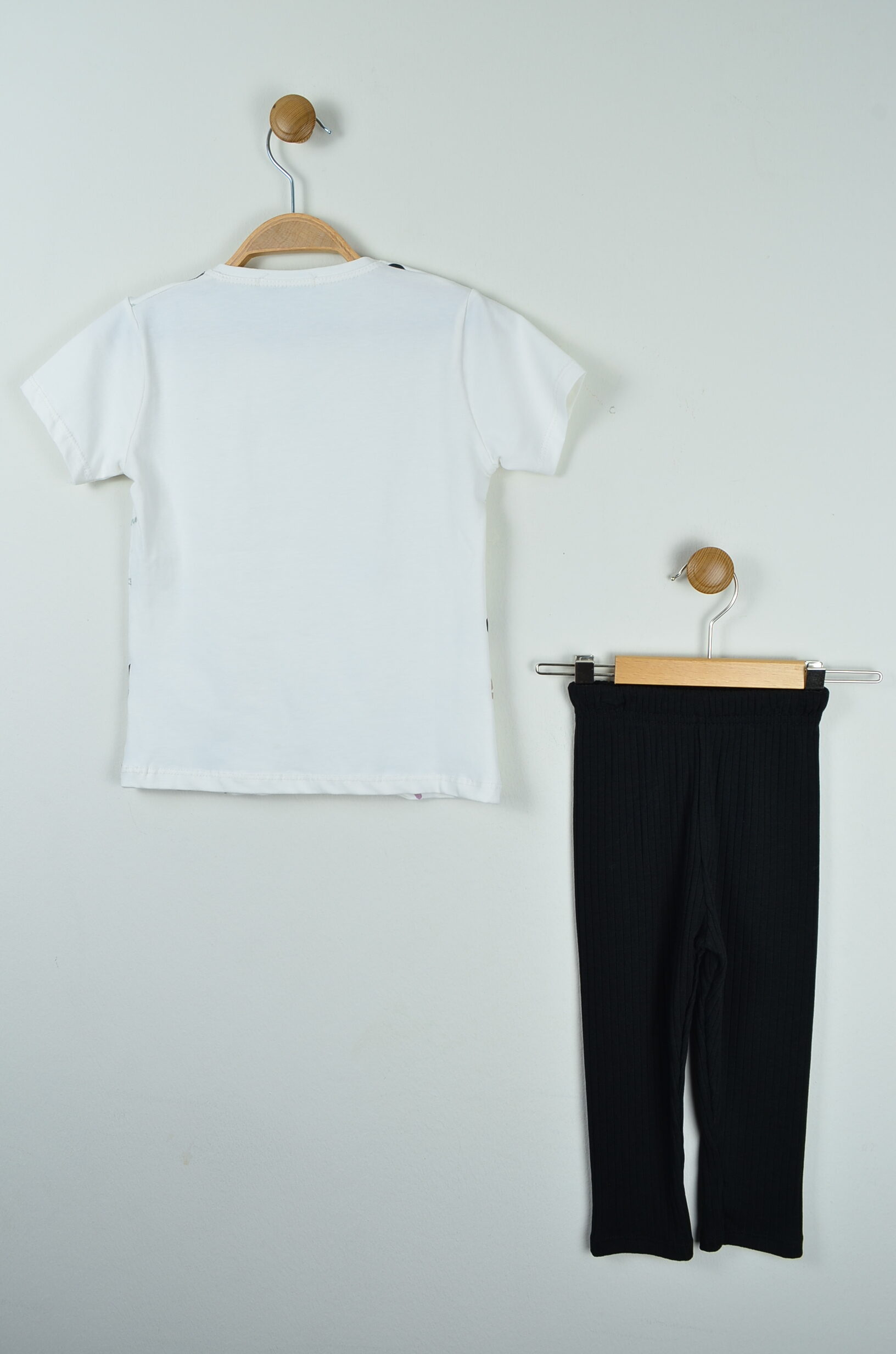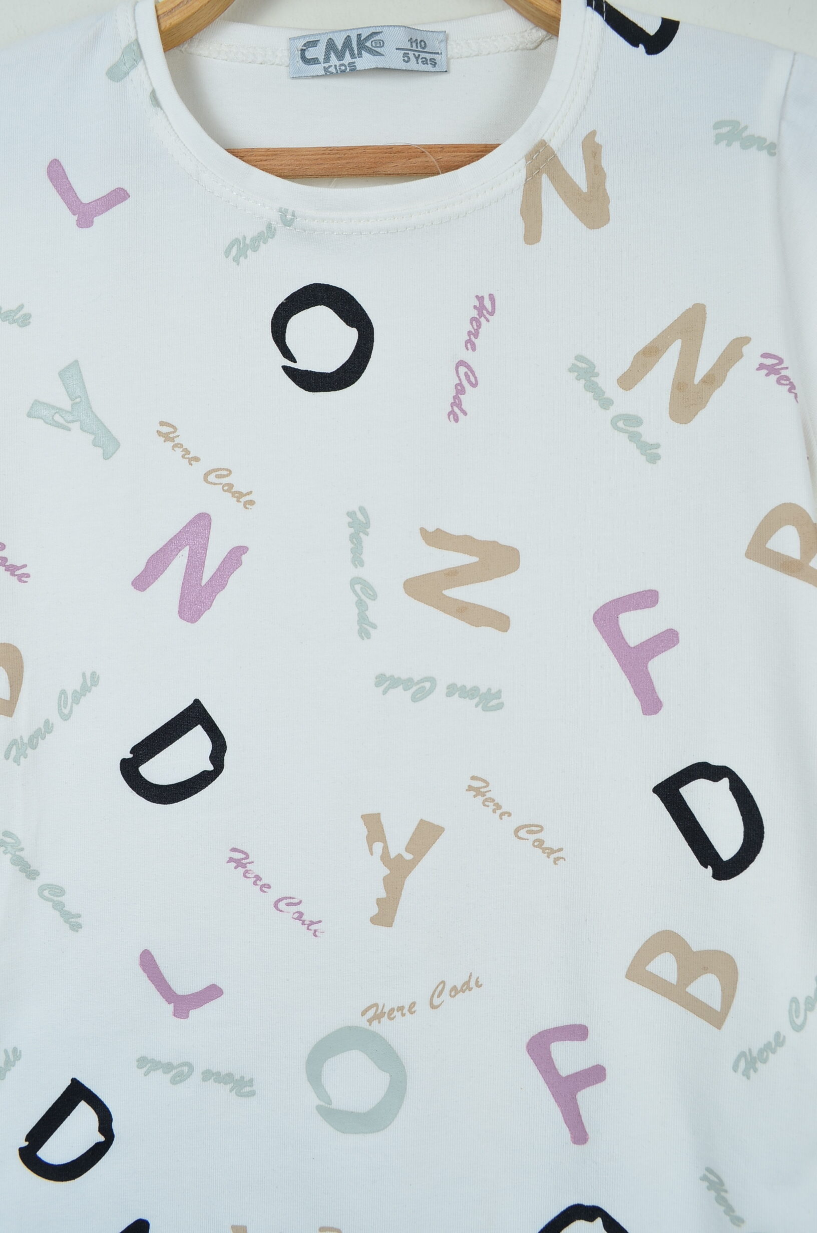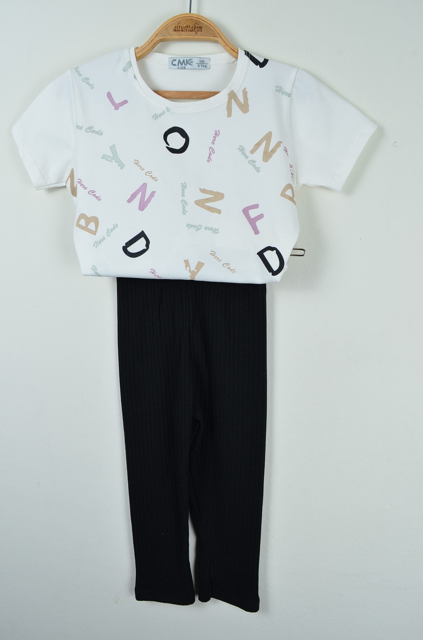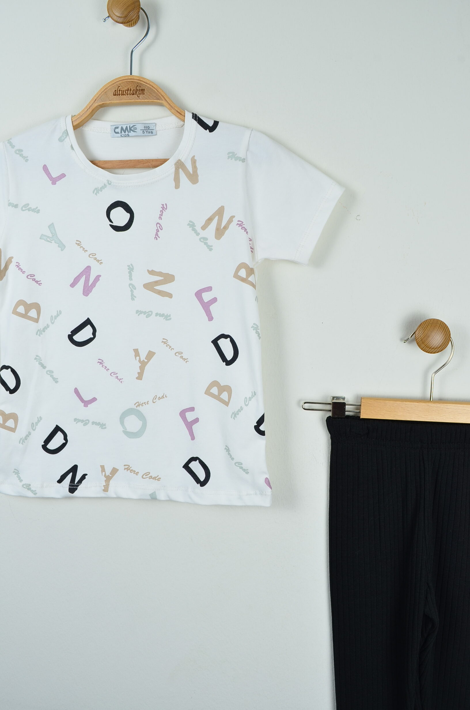 Bu sevimli iki parçalı takım, küçük kız çocuklarının günlük maceralarında hem rahat etmelerini hem de stil sahibi görünmelerini sağlar. Beyaz renkteki kısa kollu tişört, üzerinde rengarenk ve eğlenceli harf baskılarıyla hareketli bir tasarım sunar. Bu neşeli detay, çocuğunuzun enerjisini yansıtırken, sade kesimi sayesinde farklı kombinlerle de kolayca uyum sağlar.