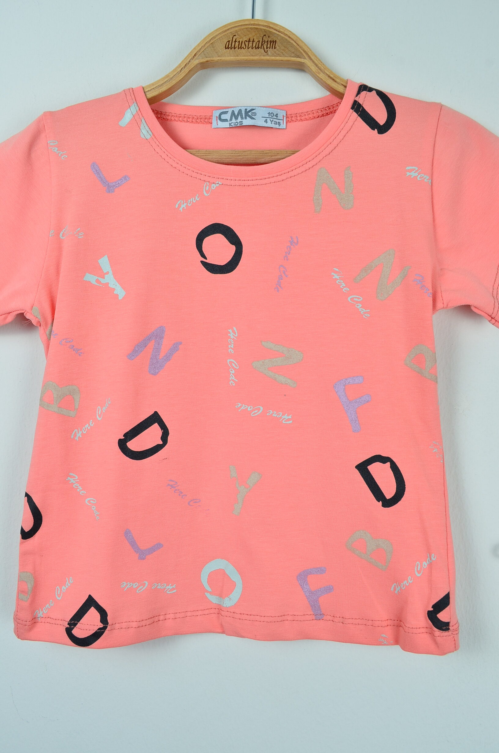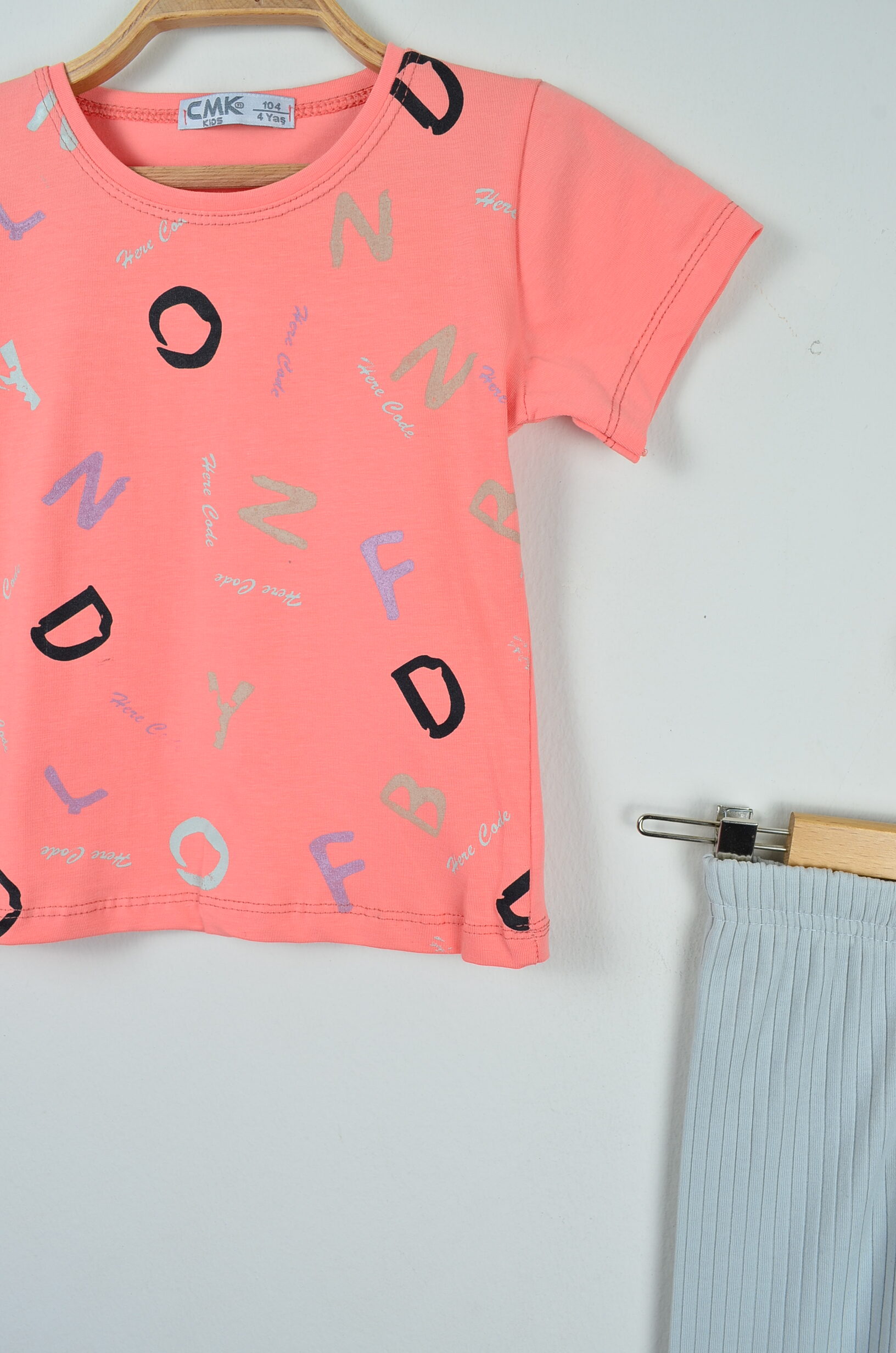 - Tişört: Kısa kollu, bisiklet yaka, şeftali renginde. Waffle dokuya ve üzerinde eğlenceli harf baskılarına sahiptir.