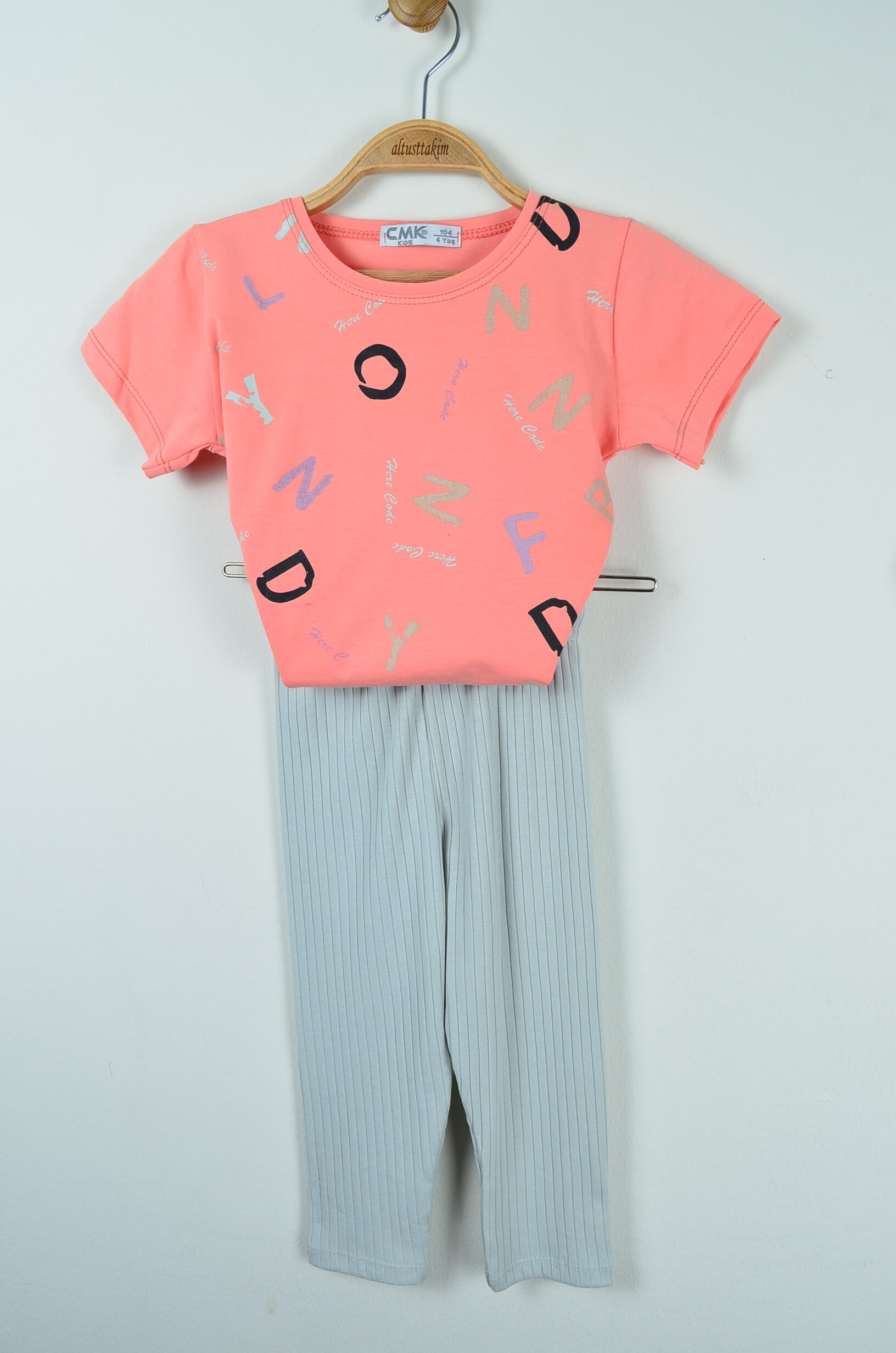 Bu iki parçalı takım, kız çocuklarınızın yaz günlerinde hem şık hem de rahat olmasını sağlar. Şeftali tonlarındaki, waffle dokulu tişört, üzerindeki pembe, mavi ve kahverengi tonlarındaki eğlenceli harf ve soyut şekil baskılarıyla canlı ve dinamik bir görünüm sunar.