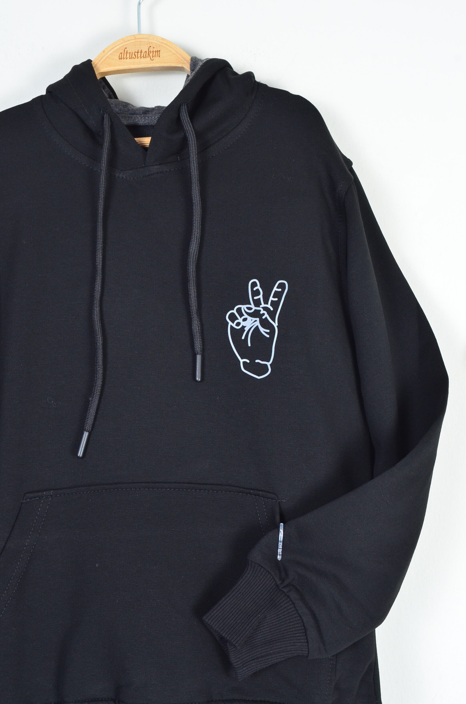 Bu kapüşonlu sweatshirt, 12-16 yaş arası erkek çocukların günlük ve okul giyiminde rahatlıkla tercih edebileceği bir parçadır. Siyah rengi ve ön kısmındaki beyaz kontürlü “barış işareti” baskısı ile modern ve sade bir stil sunar. Tamamı pamuklu olan bu ürün, nefes alabilen ince kumaşıyla serin havalarda ideal bir konfor sağlar. Kapüşonundaki ayarlanabilir ipler ve önündeki kanguru cebi kullanışlı detaylardır.