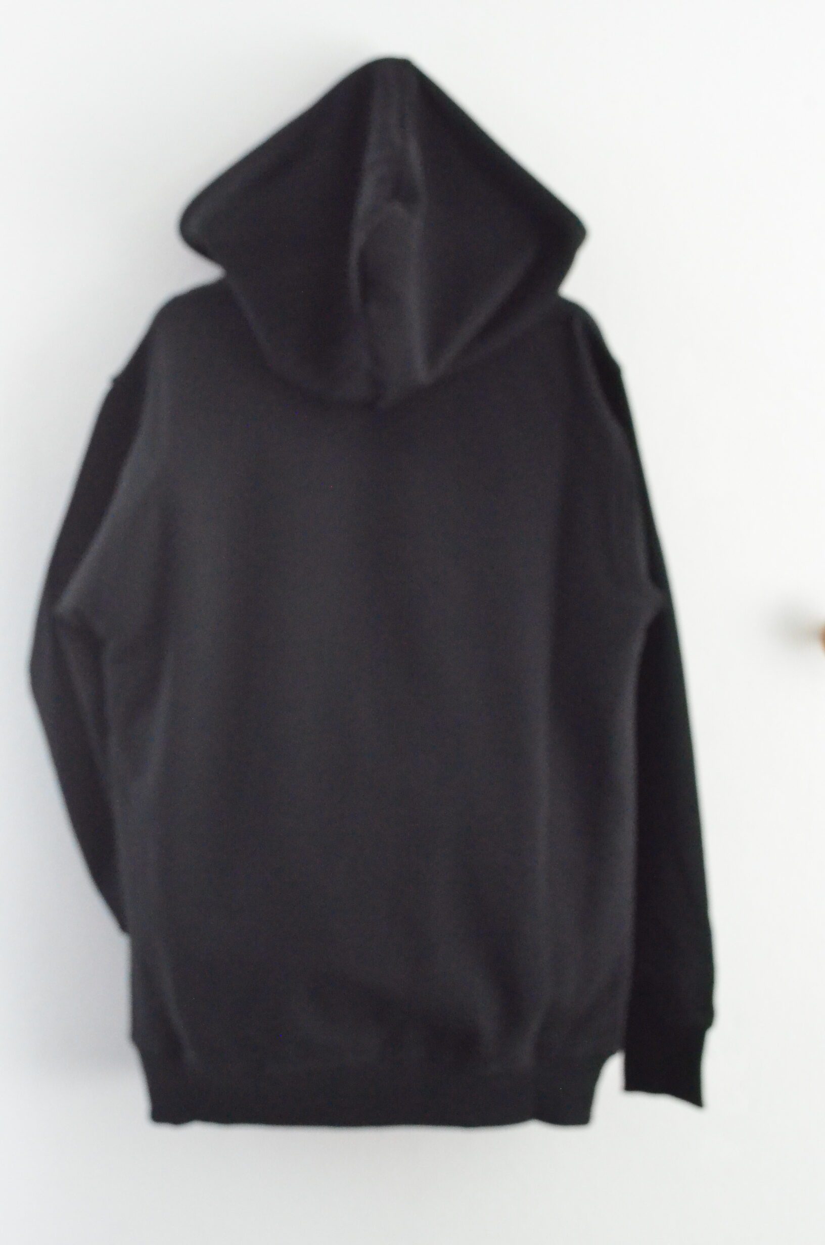 - Sweatshirt: Kapüşonlu, uzun kollu, önde kanguru cepli, siyah renkli.