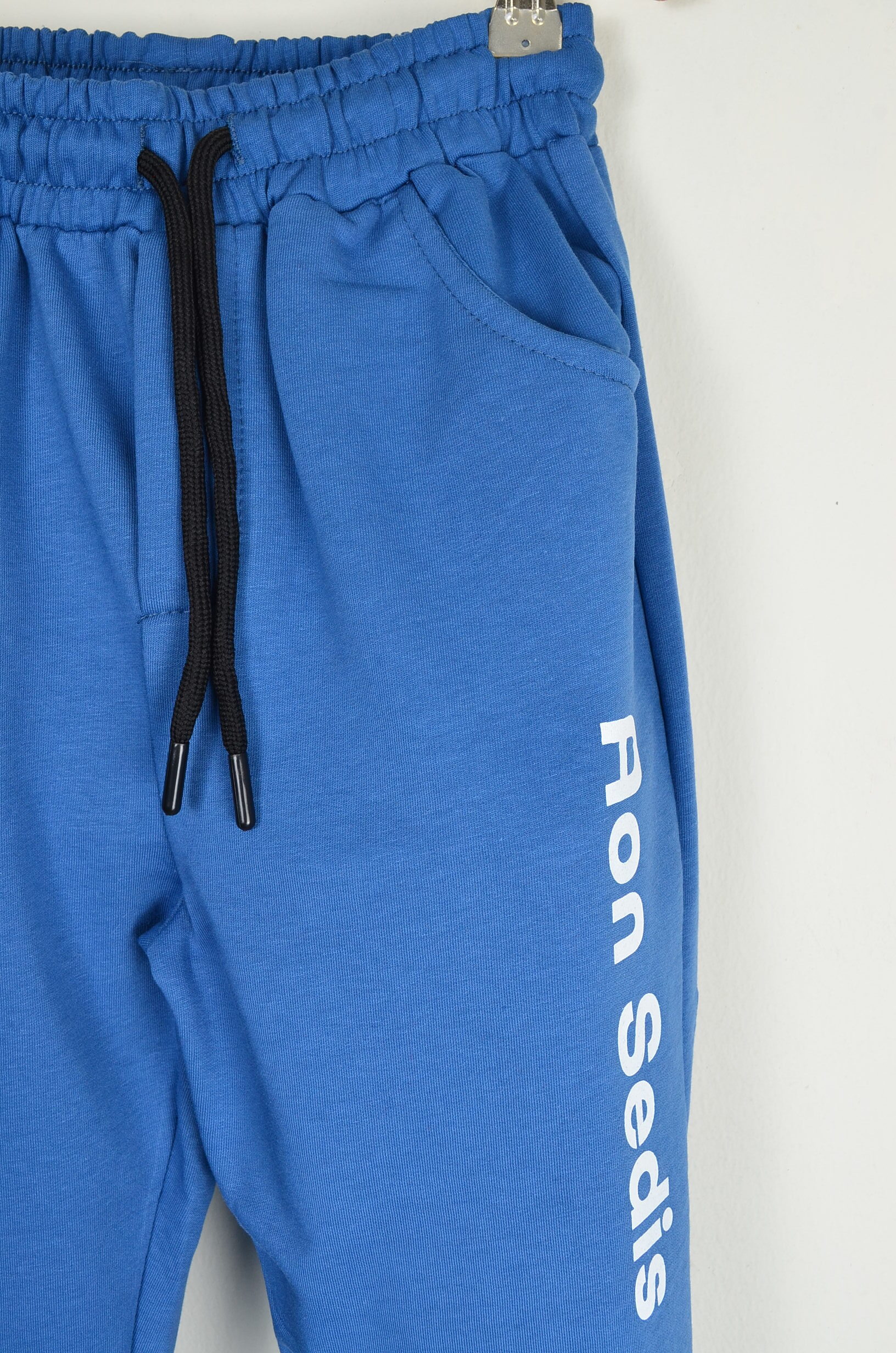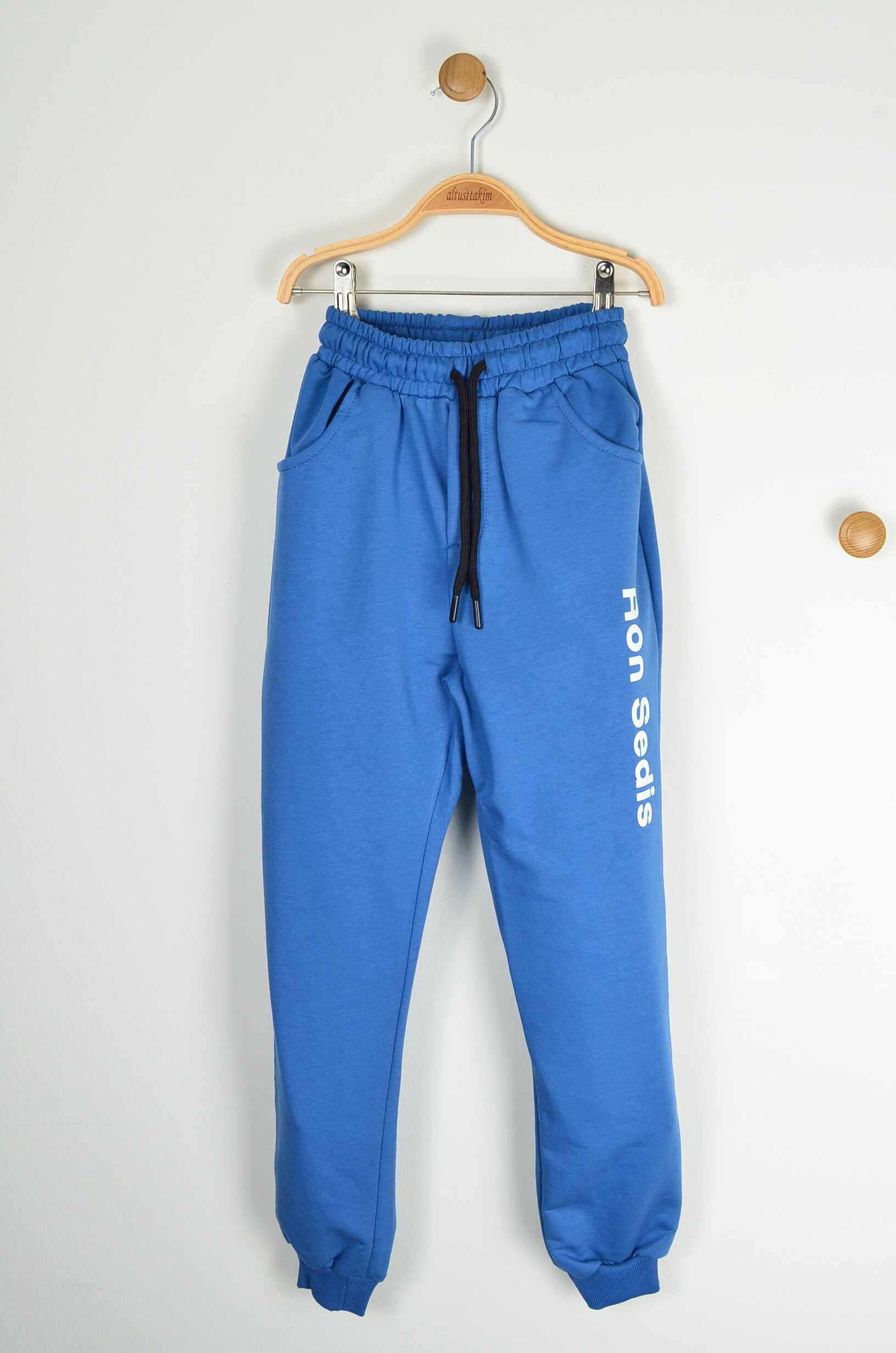 Alt: Saks mavi, belden lastikli + ayarlanabilir siyah bağcıklı, yan cepli; sağ paçada Aon Sedis yazı baskısı; paça ribanalı.