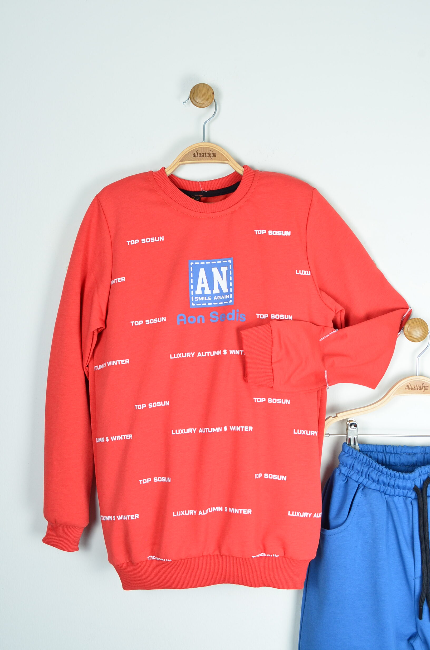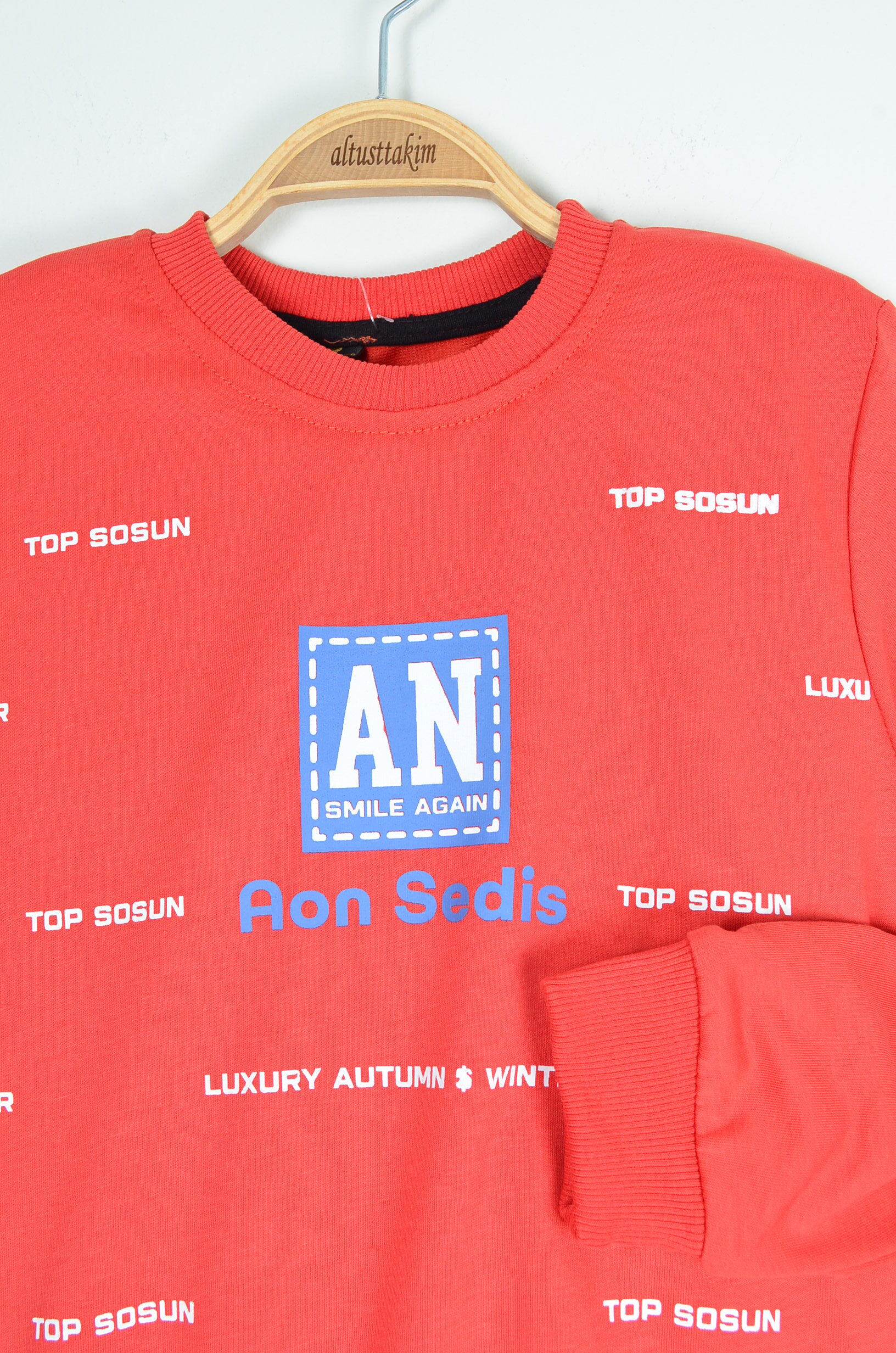 Sweatshirt (Uzun Kollu): Kırmızı, bisiklet yaka; gövdede yazı baskıları ve orta bölümde “AN / Smile Again – Aon Sedis” detayı; kol ucu ve belde ribana.