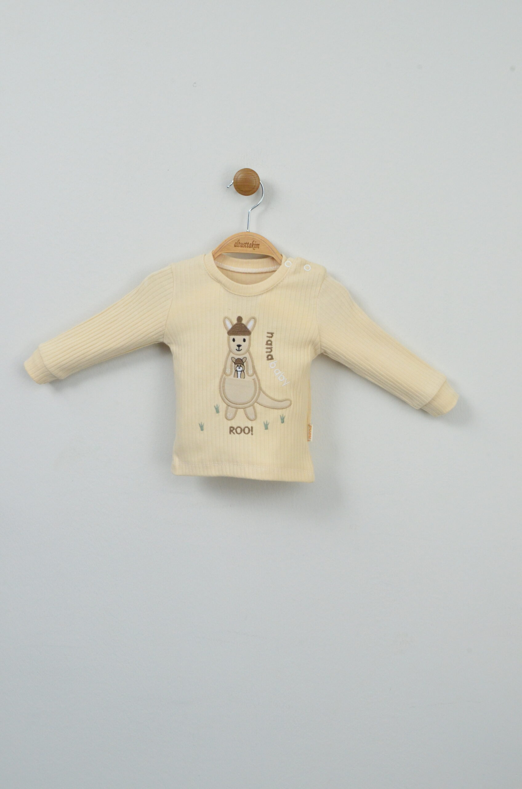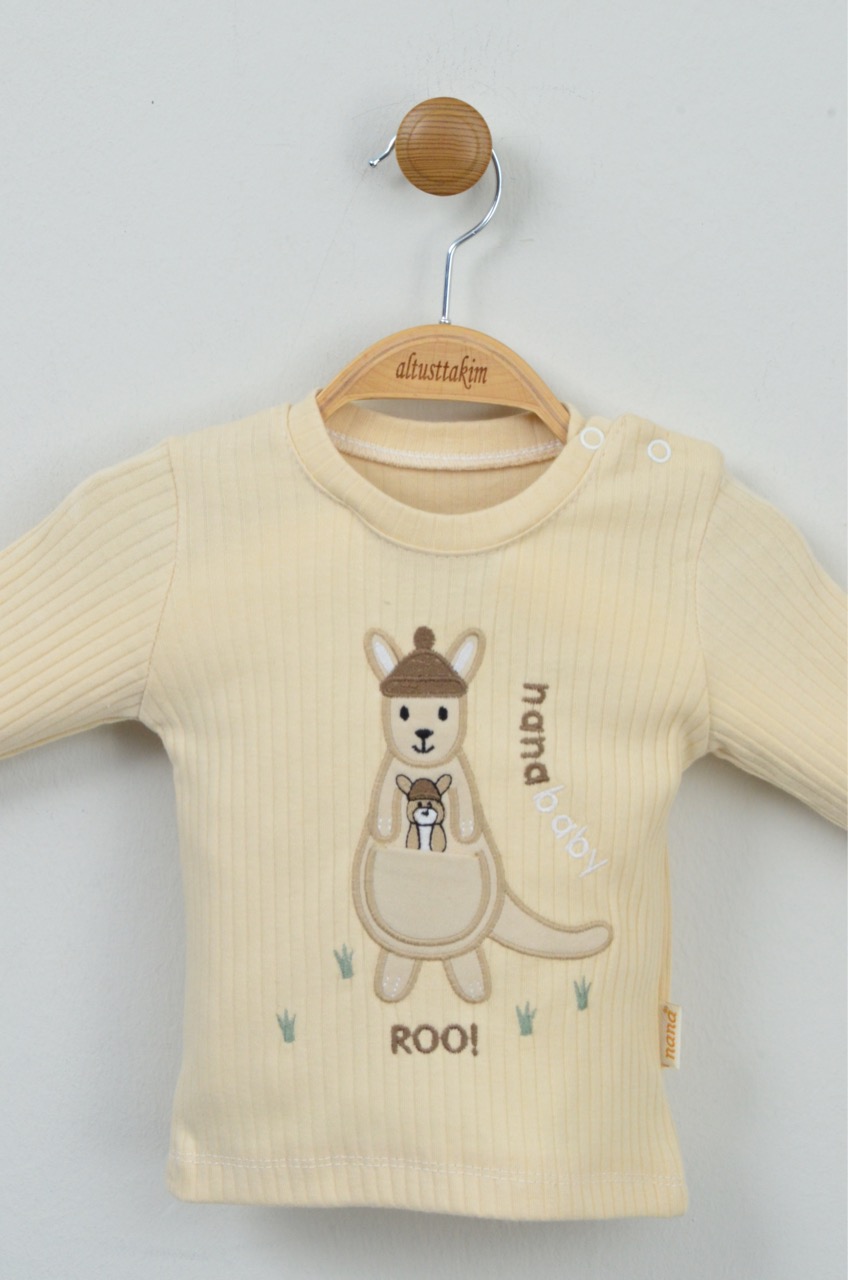 Krem Rengi Kanguru Baskılı %100 Pamuk Yenidoğan İkili Takım(0-9 Ay)