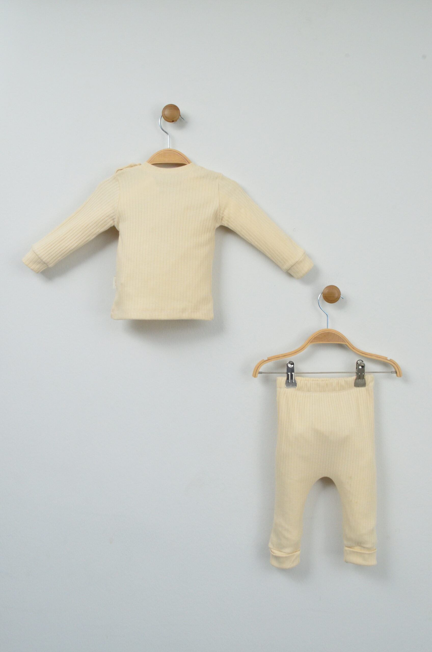 Bu sevimli krem rengi %100 pamuk yenidoğan ikili takım, bebeğinizin ilk günlerinde ihtiyaç duyacağı konforu ve şirinliği bir arada sunar. Tamamen pamuk içeriği sayesinde bebeğinizin cildine nazikçe dokunur.