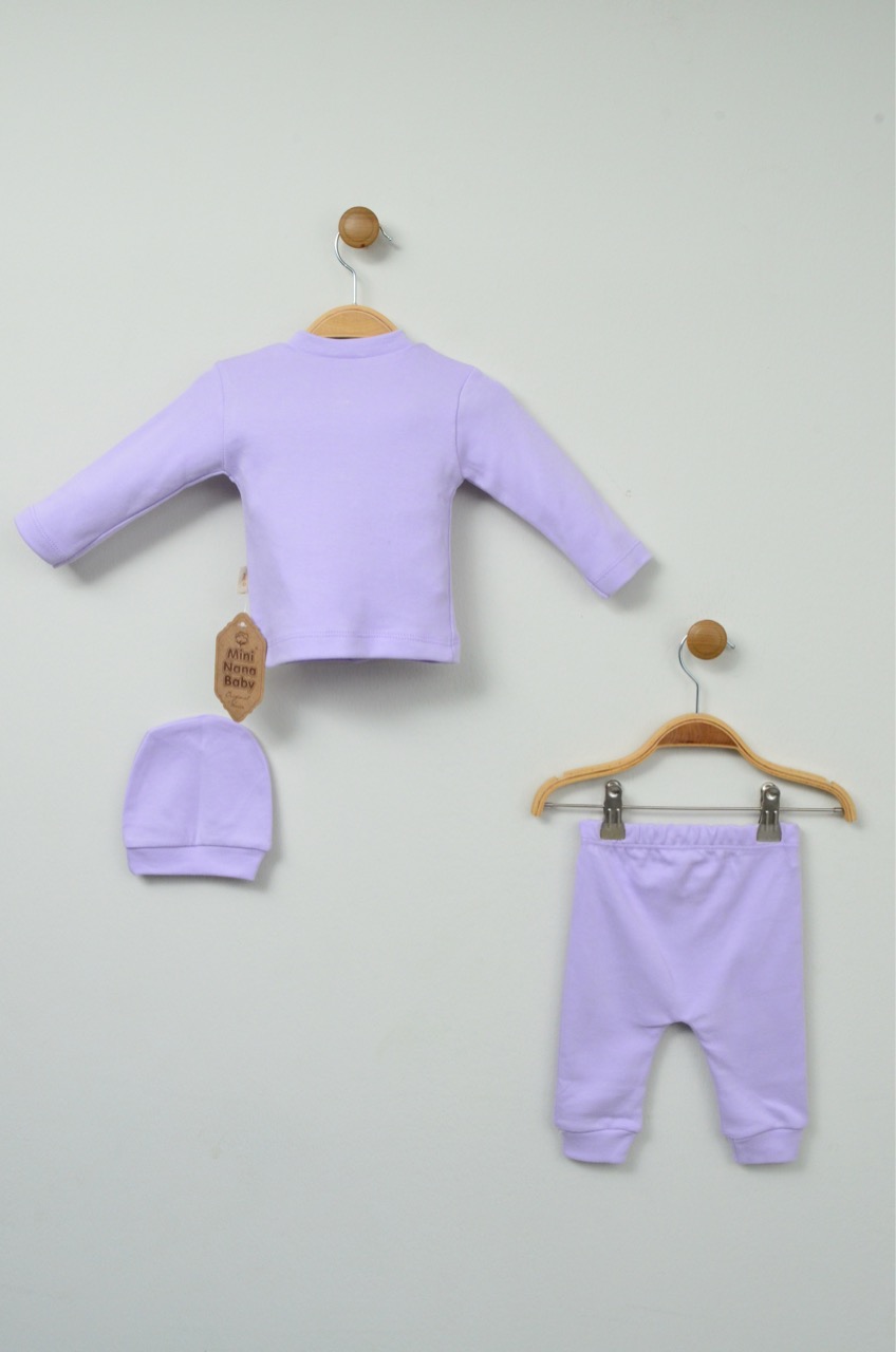 Bu sevimli lila %100 pamuk yenidoğan üçlü takım, bebeğinizin ilk günlerinde ihtiyaç duyacağı konforu ve şirinliği bir arada sunar. Tamamen pamuk içeriği sayesinde bebeğinizin cildine nazikçe dokunur.