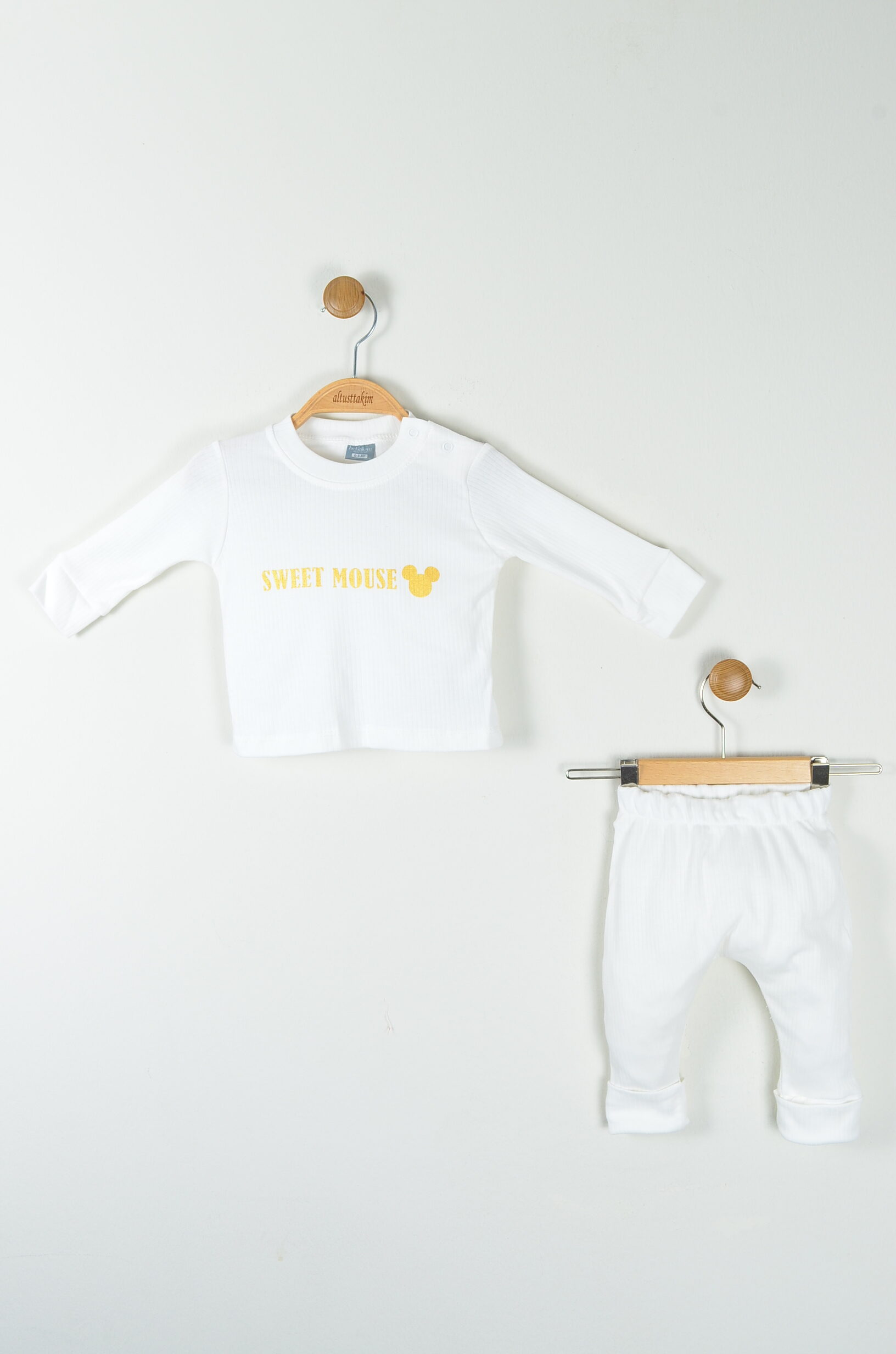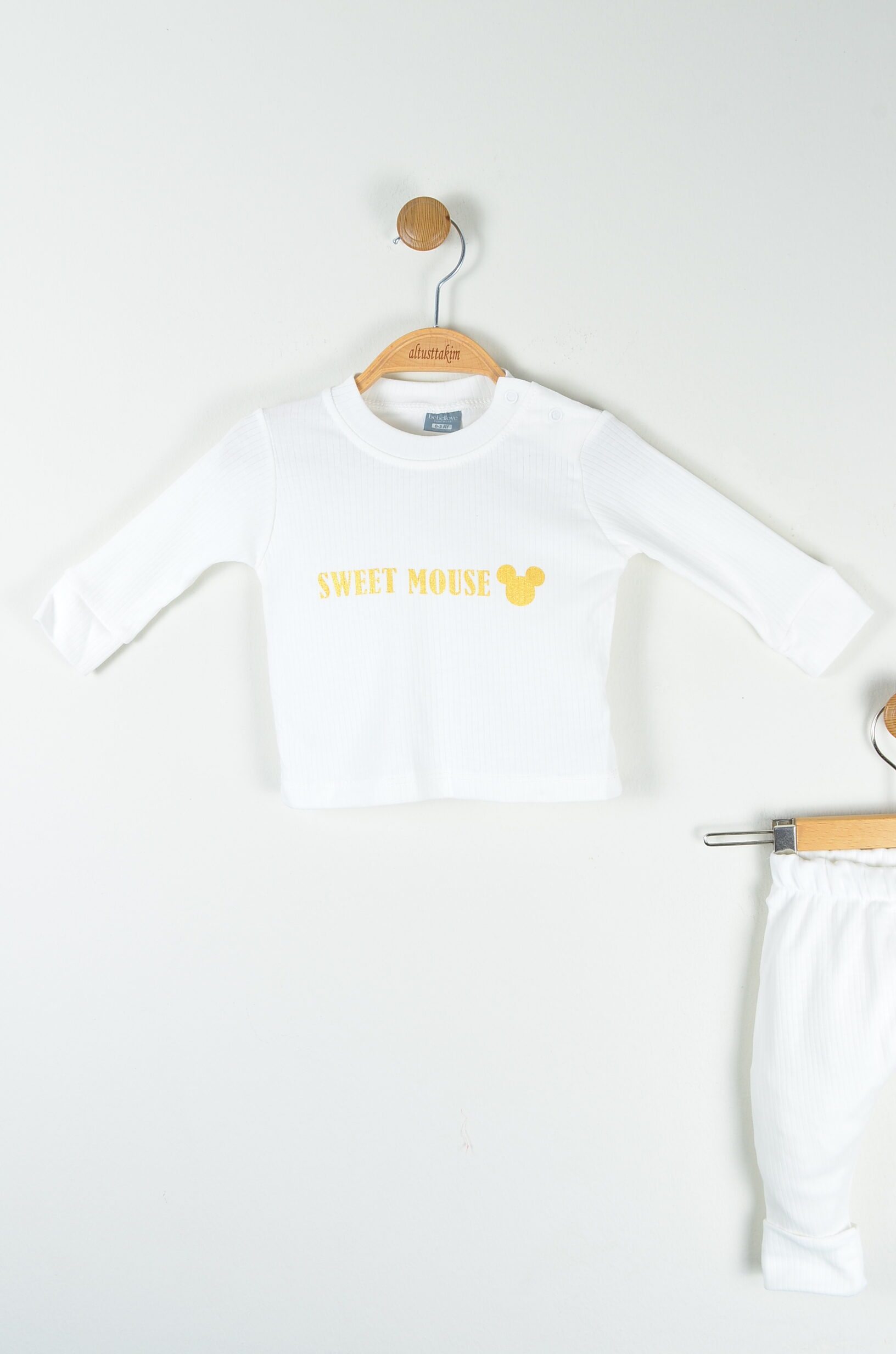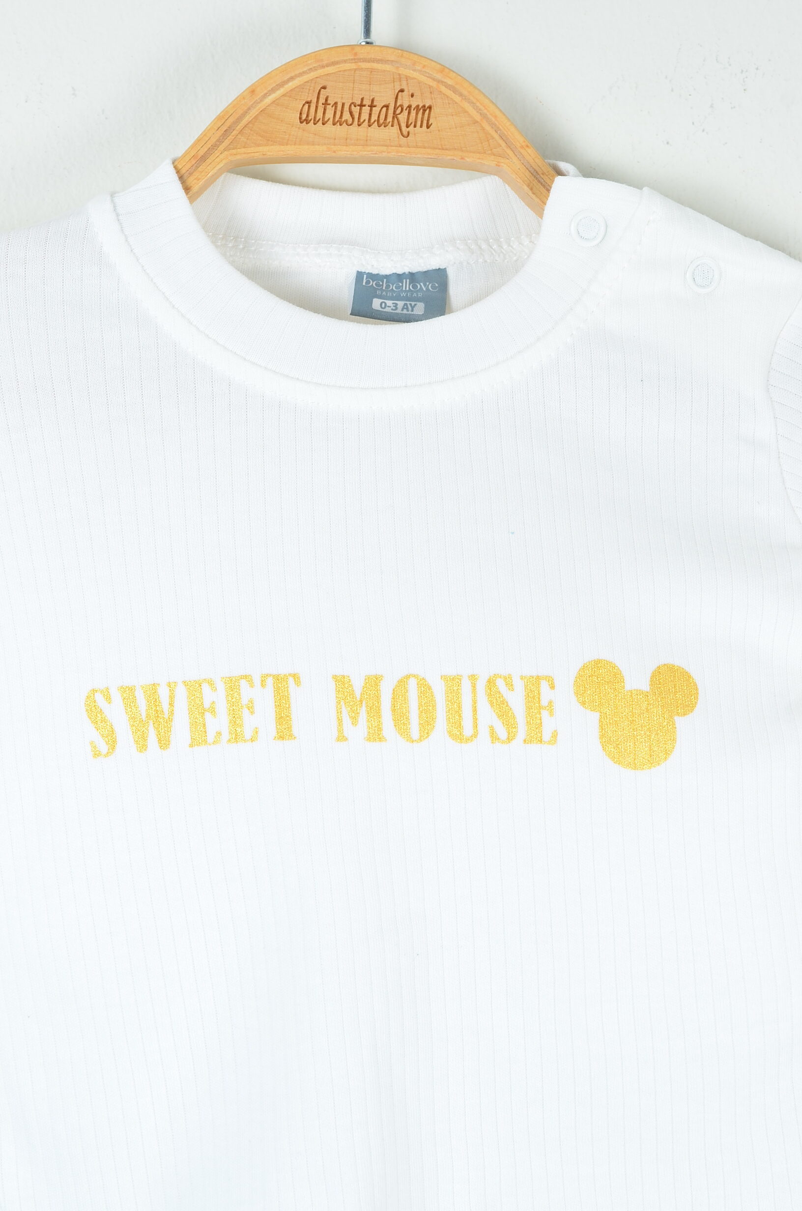 - Uzun Kollu Body: Düz beyaz renk, ribanalı, bisiklet yaka. Ön kısmında sarı “SWEET MOUSE” yazısı ve fare başı figürü bulunur.