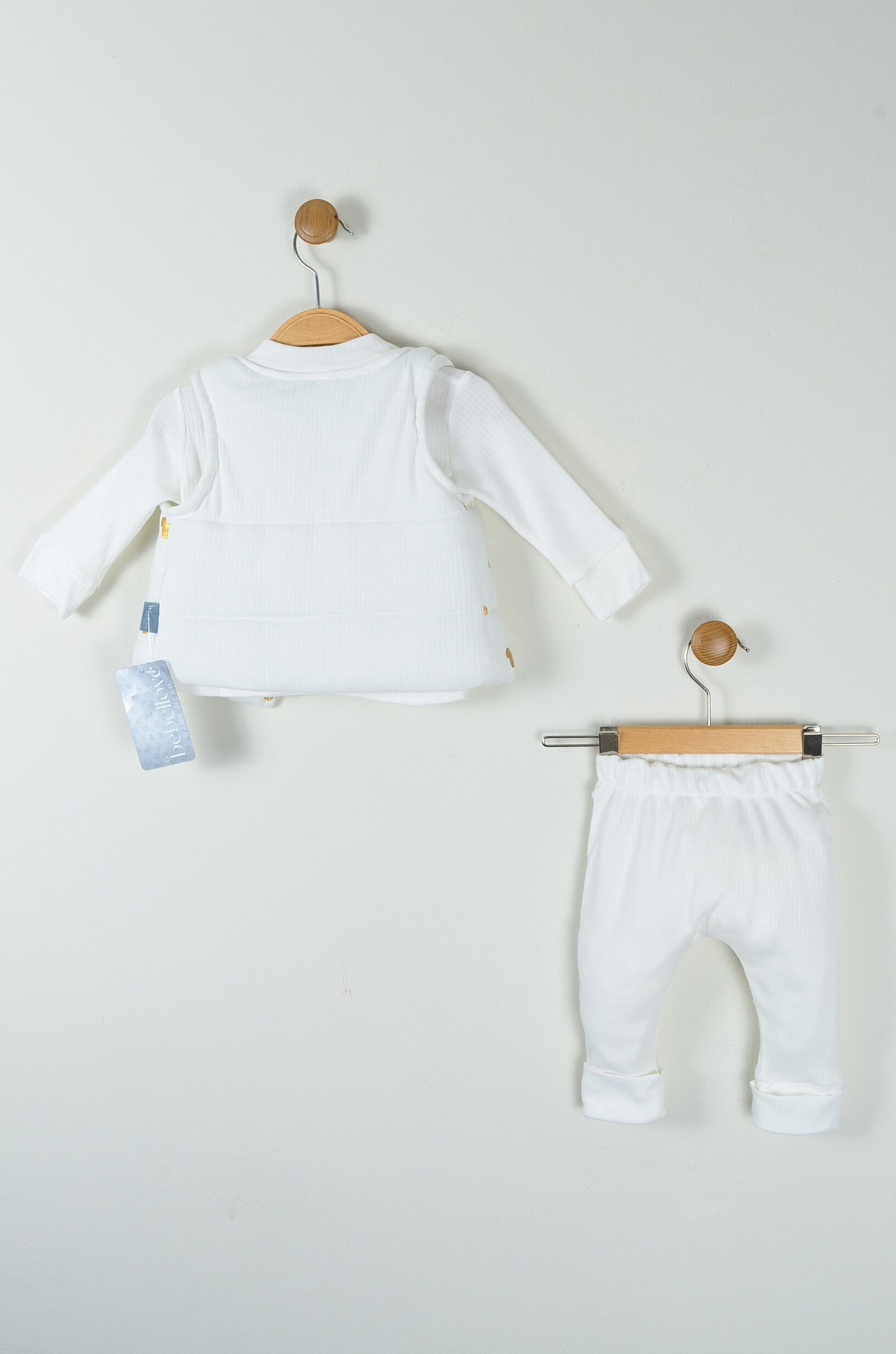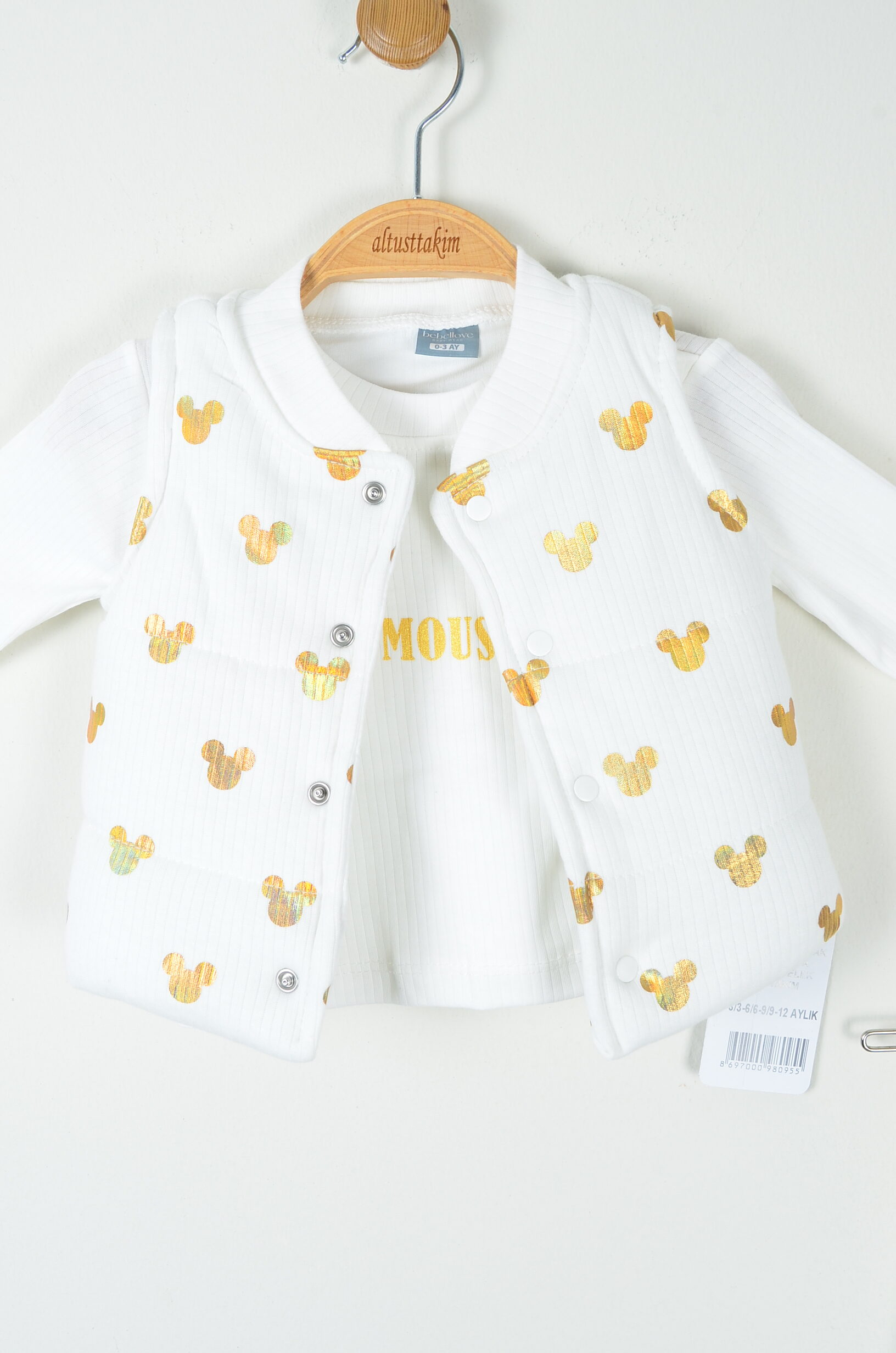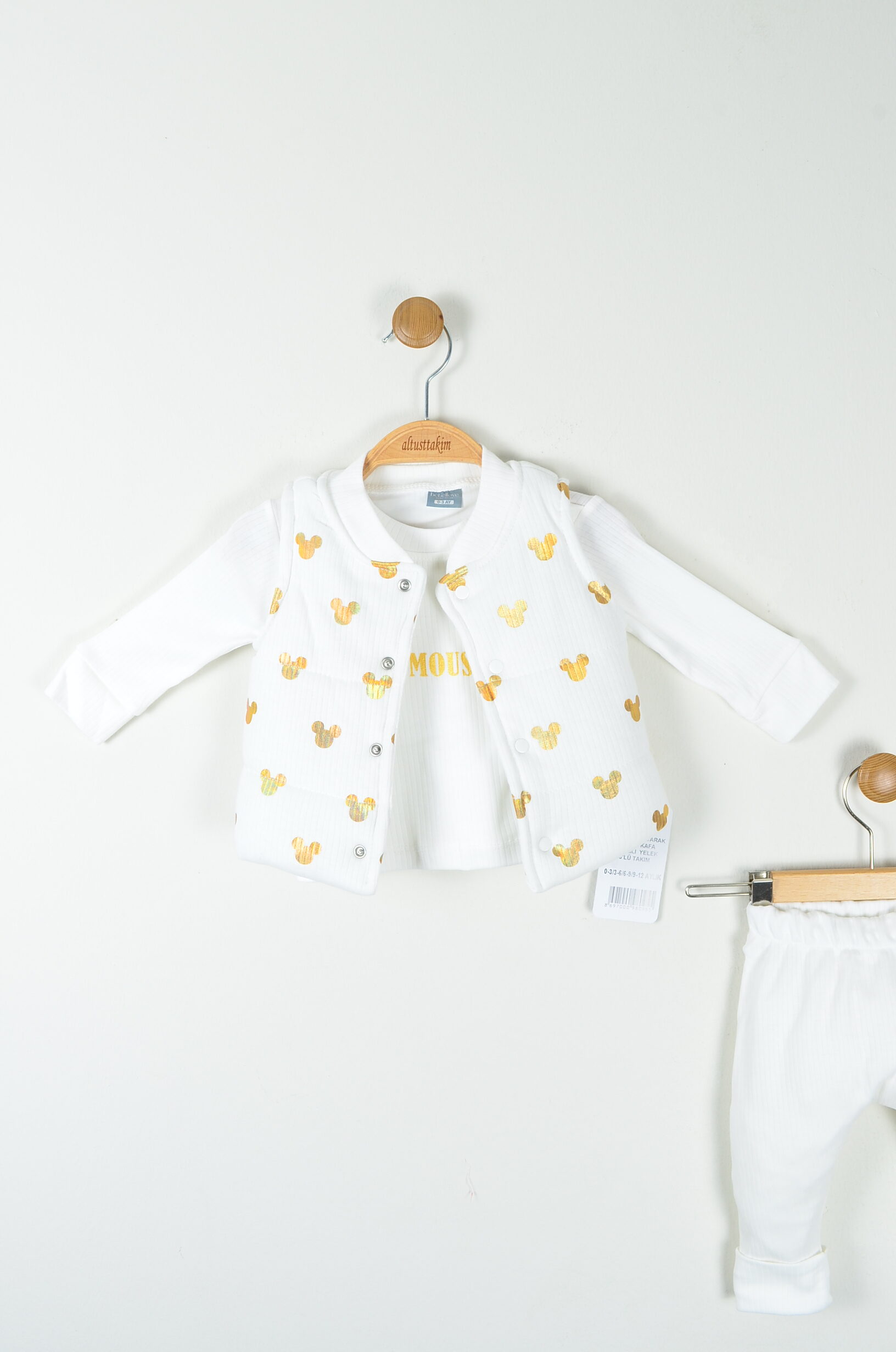 Bu sevimli üçlü bebek giyim seti, miniklerin gardırobuna hem zarafet hem de eğlence katmaya hazır. Set içeriğinde, üzerinde sarı “SWEET MOUSE” yazısı ve fare başı figürü bulunan uzun kollu bir body, yumuşacık ribana kumaştan üretilmiş uyumlu bir tayt ve altın sarısı fare başı desenleriyle süslenmiş, önü çıtçıtlı bir yelek bulunmaktadır. Beyazın saflığı ve altın sarısı parıltılarla birleşen bu takım, bebeğinizin her anında şık ve rahat hissetmesini sağlar.