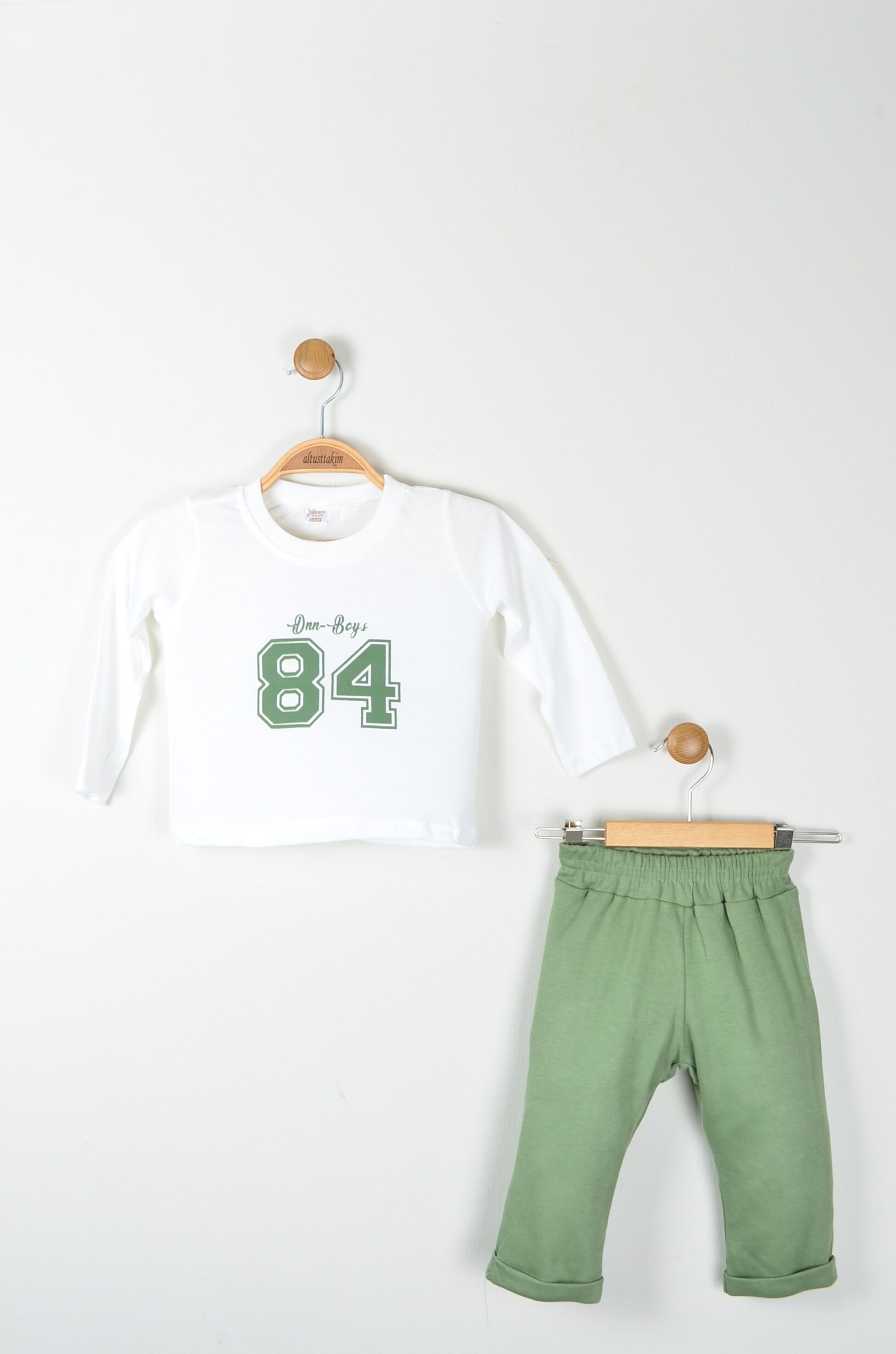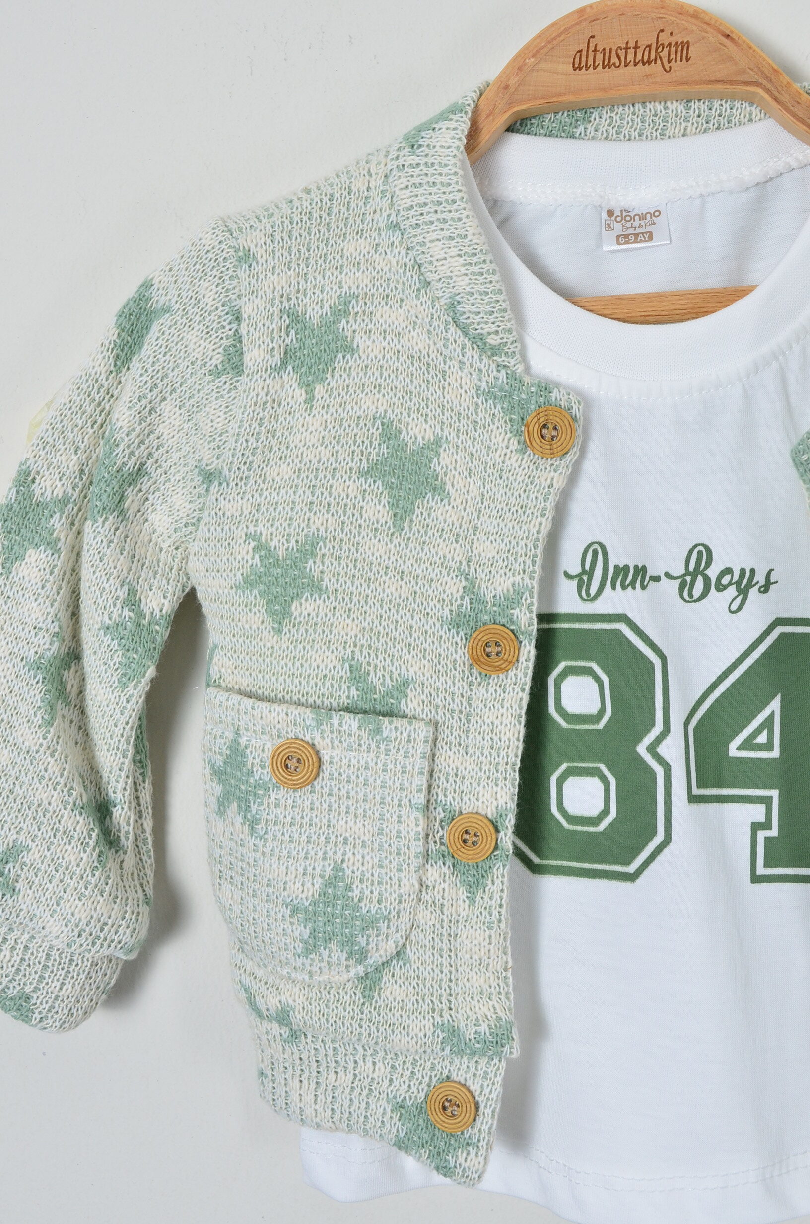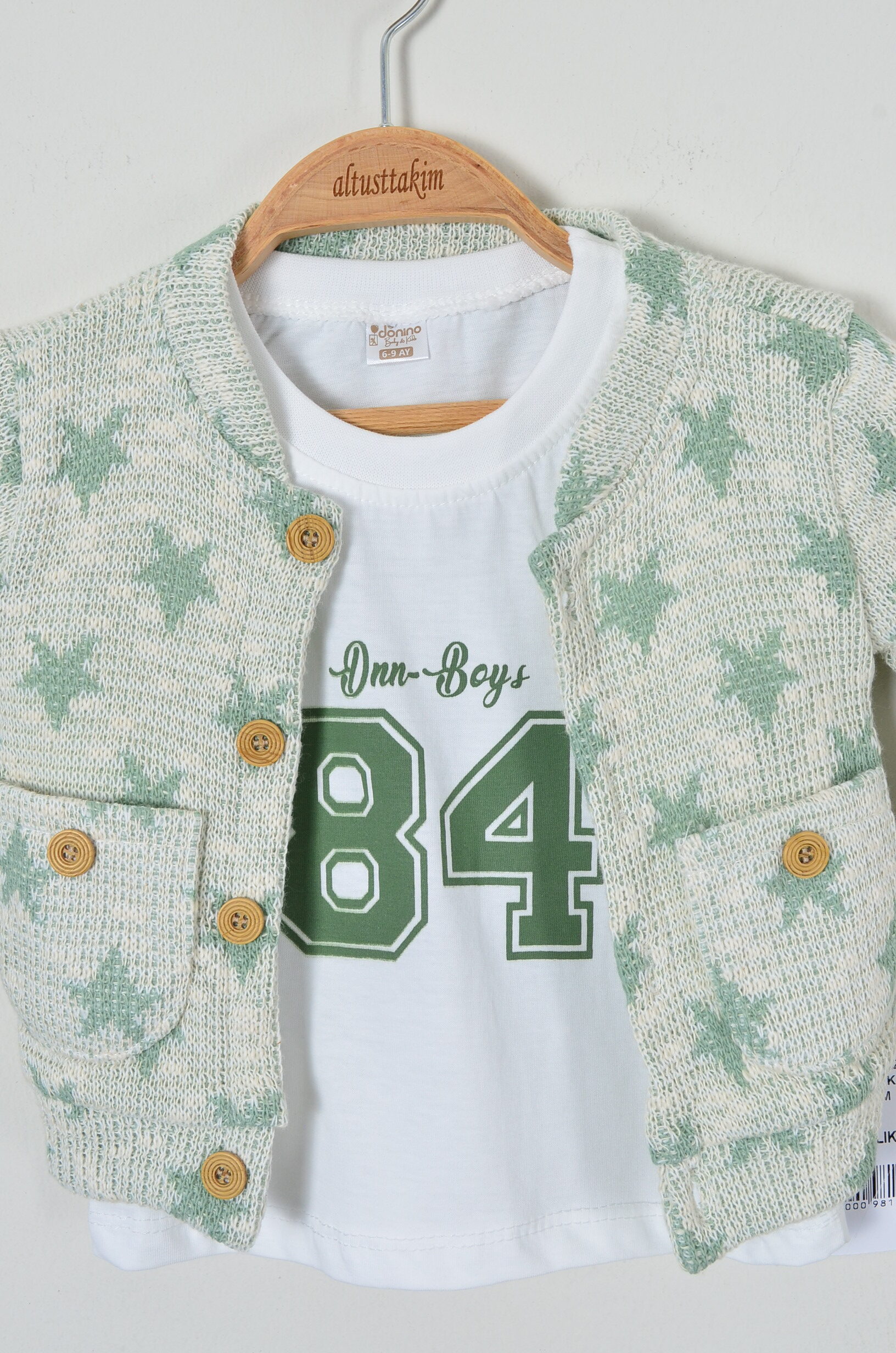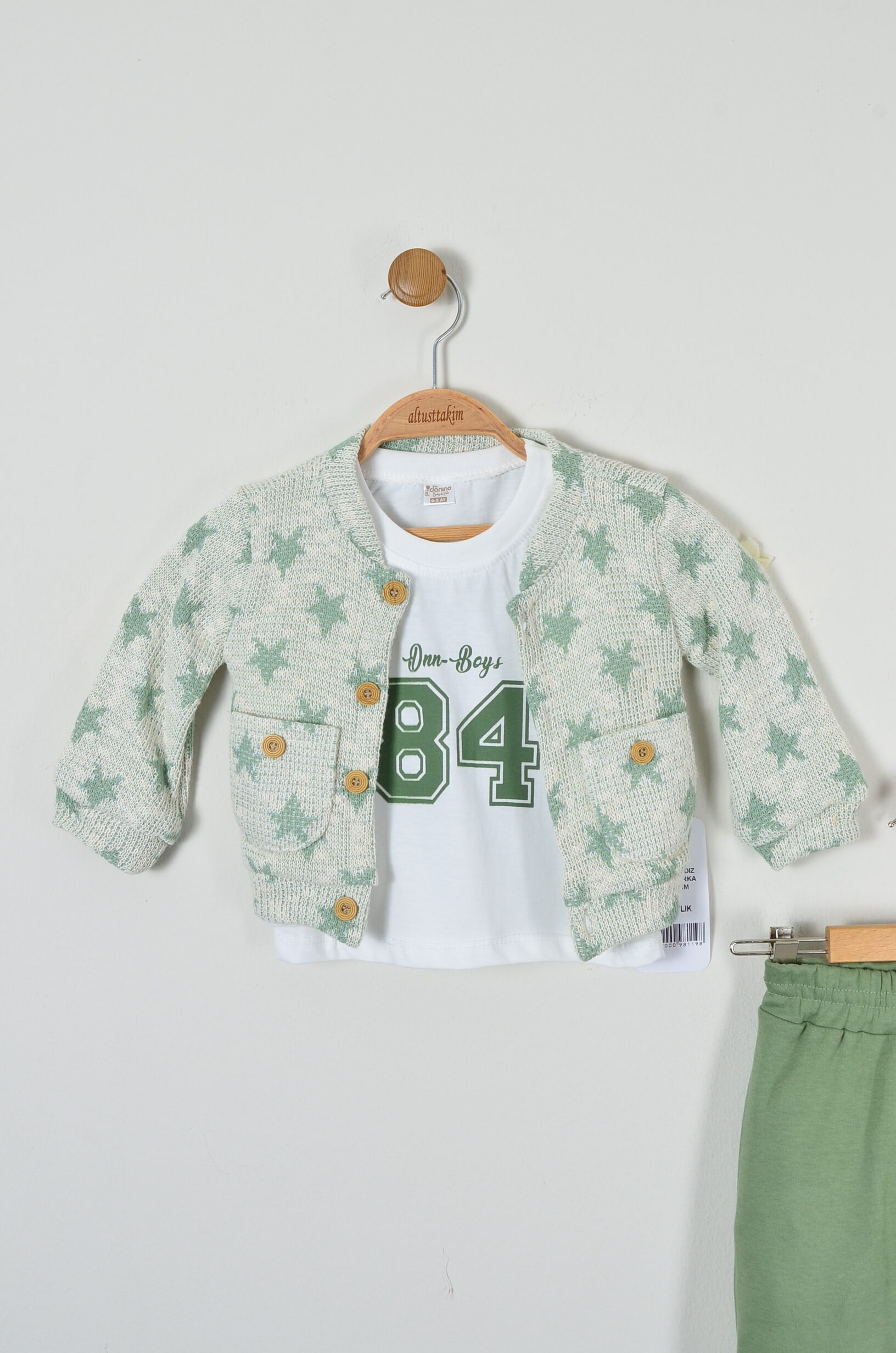 Bu üçlü bebek giyim seti, minik sporcuların hem rahat hem de havalı bir stil sergilemesi için tasarlandı. Set içeriğinde, üzerinde “Dnn-Boys” yazısı ve “84” sayısı bulunan uzun kollu bir body, uyumlu renkte bir tayt ve yıldız desenli, önden düğmeli bir hırka (yelek) bulunmaktadır. Yeşil ve beyazın enerjisiyle birleşen bu takım, bebeğinizin her anında konforlu ve şık hissetmesini sağlar. Yumuşak pamuklu kumaşı sayesinde hassas bebek cildine dosttur.
