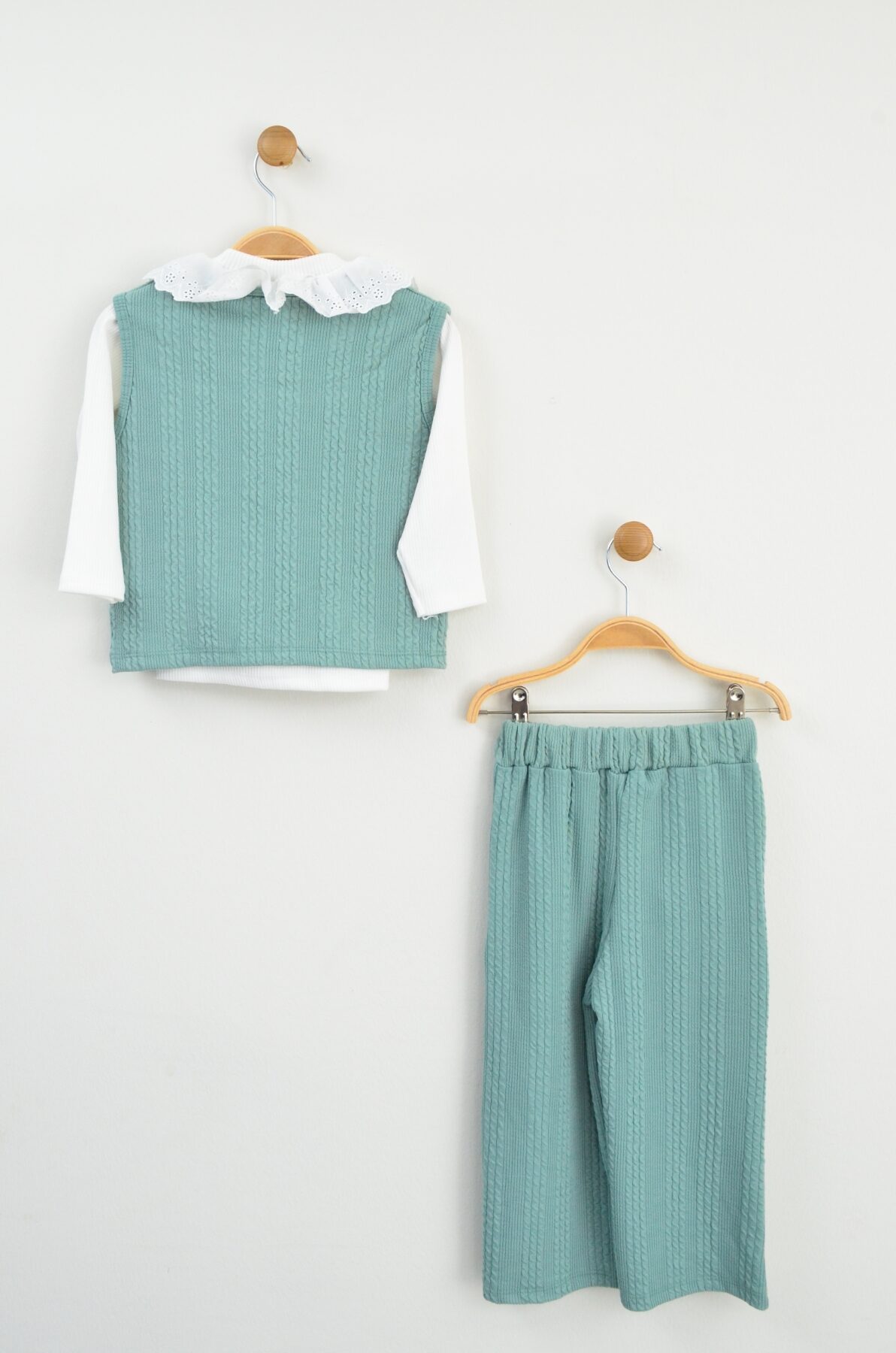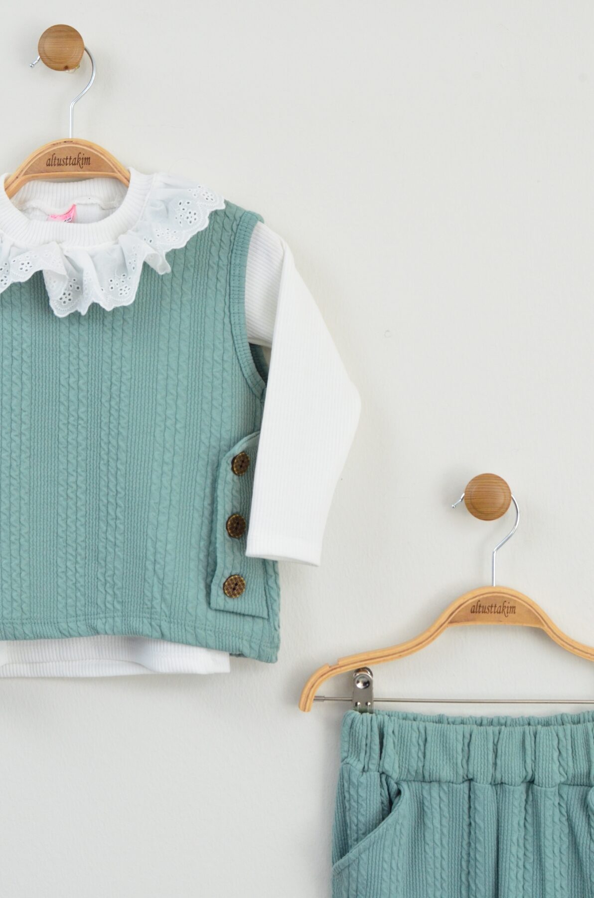 Miniklerin günlük hayatında hem şık hem de rahat olmasını sağlayacak bu iki parça takım, mint yeşili rengi ve fırfırlı yeleğiyle dikkat çekiyor. Yumuşacık fitilli kumaşı sayesinde çocuğunuz gün boyu konforlu hissederken, özgün tasarımıyla da göz kamaştıracak.
